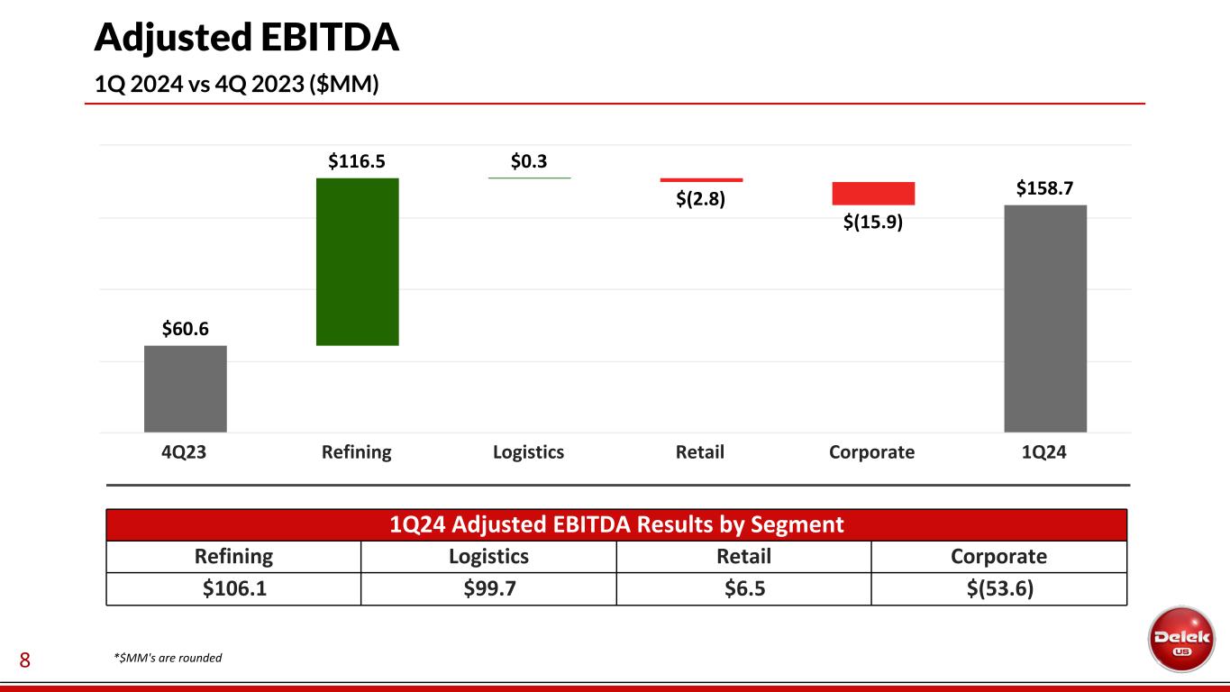 "On the strategic front, we made significant headway," Soreq continued. "Delek Logistics improved its financial strength and flexibility with the debt and equity offerings executed during the quarter. The $800 million of liquidity and additional volume activity in the units enhances our opportunities with DKL. In addition, we initiated a process to unlock the value inherit in the retail business. We are well positioned to execute the sum of the parts initiative and realize value for our stakeholders."