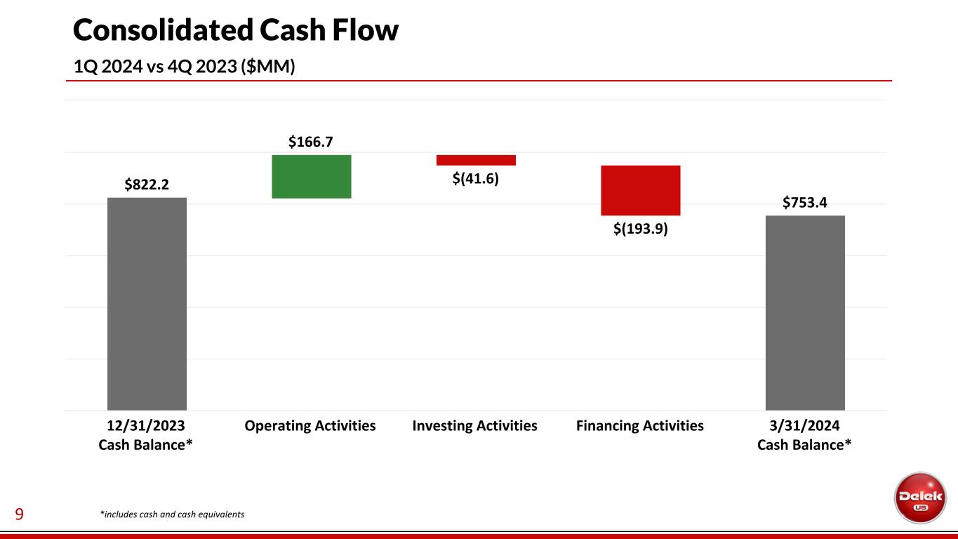 As of March 31, 2024, Delek US had a cash balance of $753.4 million and total consolidated long-term debt of $2,496.9 million, resulting in net debt of $1,743.5 million. As of March 31, 2024, Delek Logistics Partners, LP (NYSE: DKL) ("Delek Logistics") had $9.7 million of cash and $1,601.2 million of total long-term debt, which are included in the consolidated amounts on Delek US' balance sheet. Excluding Delek Logistics, Delek US had $743.7 million in cash and $895.7 million of long-term debt, or a $152.0 million net debt position.
