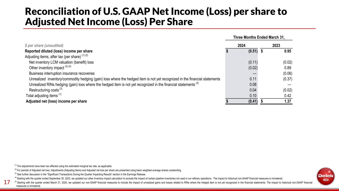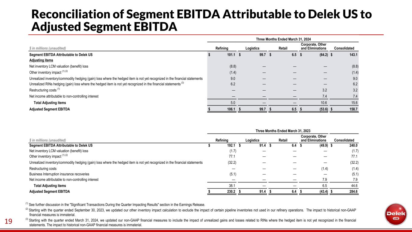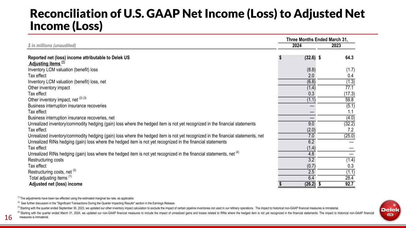 Non-GAAP measures have important limitations as analytical tools, because they exclude some, but not all, items that affect net earnings and operating income. These measures should not be considered substitutes for their most directly comparable U.S. GAAP financial measures. Additionally, because Adjusted net income or loss, Adjusted net income or loss per share, EBITDA and Adjusted EBITDA, Adjusted Refining Margin and Refining Production Margin or any of our other identified non-GAAP measures may be defined differently by other companies in its industry, Delek US' definition may not be comparable to similarly titled measures of other companies. See the accompanying tables in this earnings release for a reconciliation of these non-GAAP measures to the most directly comparable GAAP measures.