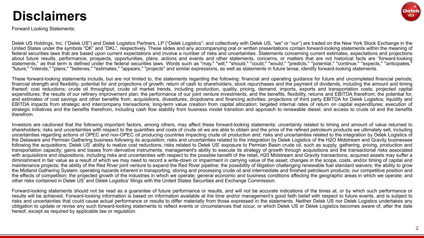 投資家の皆様は、特に以下の重要な要因が、これらの将来見通しに関する記述に影響を及ぼす可能性があることにご留意ください:関税、税金、原油、天然ガス、石油精製品、または再生可能エネルギーに関する政府政策の変更を含む、政治的または規制的な動向、将来の自社株買い戻しおよび配当支払いの時期および金額に関する不確実性、当社が入手できる原油の量およびコスト、当社が最終的に販売する石油精製品の価格に関するリスクおよび不確実性、原油生産および価格設定に影響を与えるOPECおよび非OPEC産油国の行動に関する不確実性;デレック・ロジスティクス社によるデラウェア・ギャザリング事業、パーミアン・ギャザリング事業、H2Oミッドストリーム事業、グラビティ事業の買収後の統合に関連するリスクと不確実性、デレックUS社によるコスト削減の実現能力、パーミアン・ベースン原油の供給、価格、集荷、生産、輸送能力などのエクスポージャーに関連するリスク、デリバティブ商品による利益と損失、買収と売却に関連するリスク、小売事業、H2Oミッドストリーム事業、グラビティ事業の買収によりもたらされる可能性のある利益に関するリスクと不確実性;買収した資産の公正価値が低下し、帳簿価額の評価減または減損を計上する必要が生じる可能性、再生可能燃料基準免除を争う訴訟の可能性、資本およびメンテナンス・プロジェクトの範囲、費用、および/または時期の変更、ミッドランド・ギャザリング・システムを成長させる能力、レッド・リバー・ジョイント・ベンチャーがレッド・リバー・パイプラインの容量を増加させる拡張プロジェクトを完了させる能力;原油および中間・最終石油製品の輸送、貯蔵、処理に内在する操業上の危険、当社の競争上の地位および競争による影響、当社が事業を行っている業界の成長予測、当社が事業を行っている地域に影響を及ぼす一般的な経済および経営状況、ならびにフォーム10-K年次報告書、フォーム10-Q四半期報告書、およびその他のSECへの提出書類および報告書に開示されているリスクを含む、Delek USが米国証券取引委員会(以下「SEC」)に提出した書類に記載されているその他のリスク。