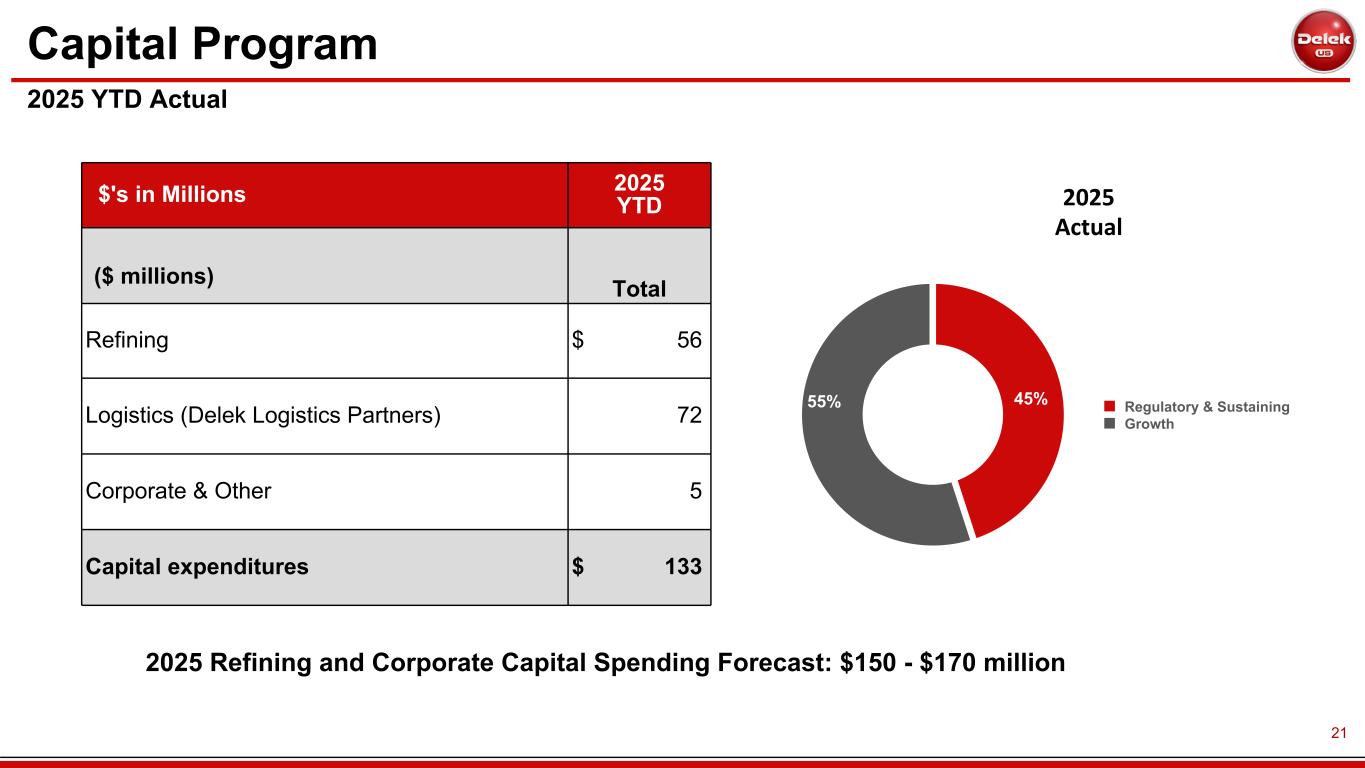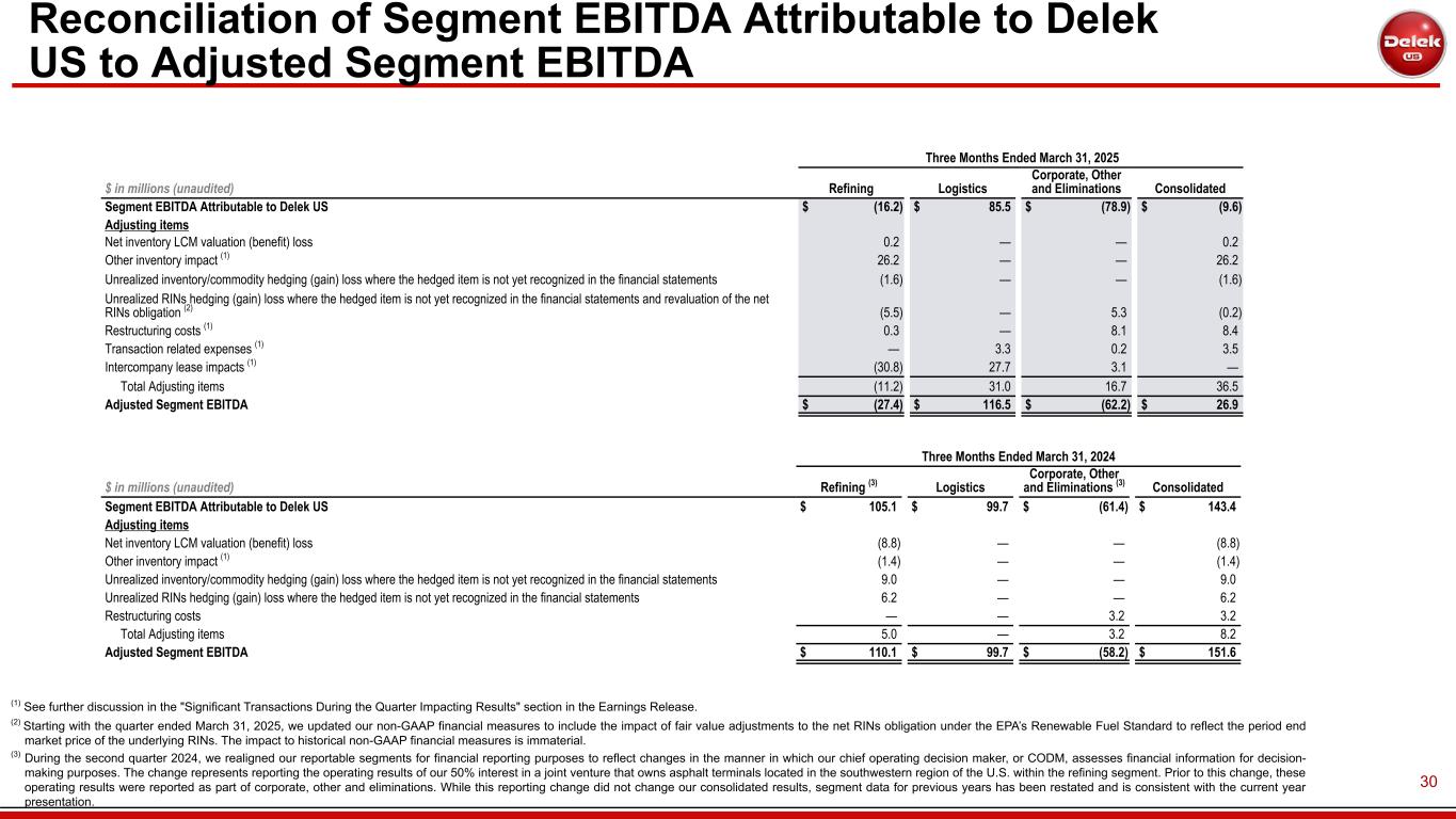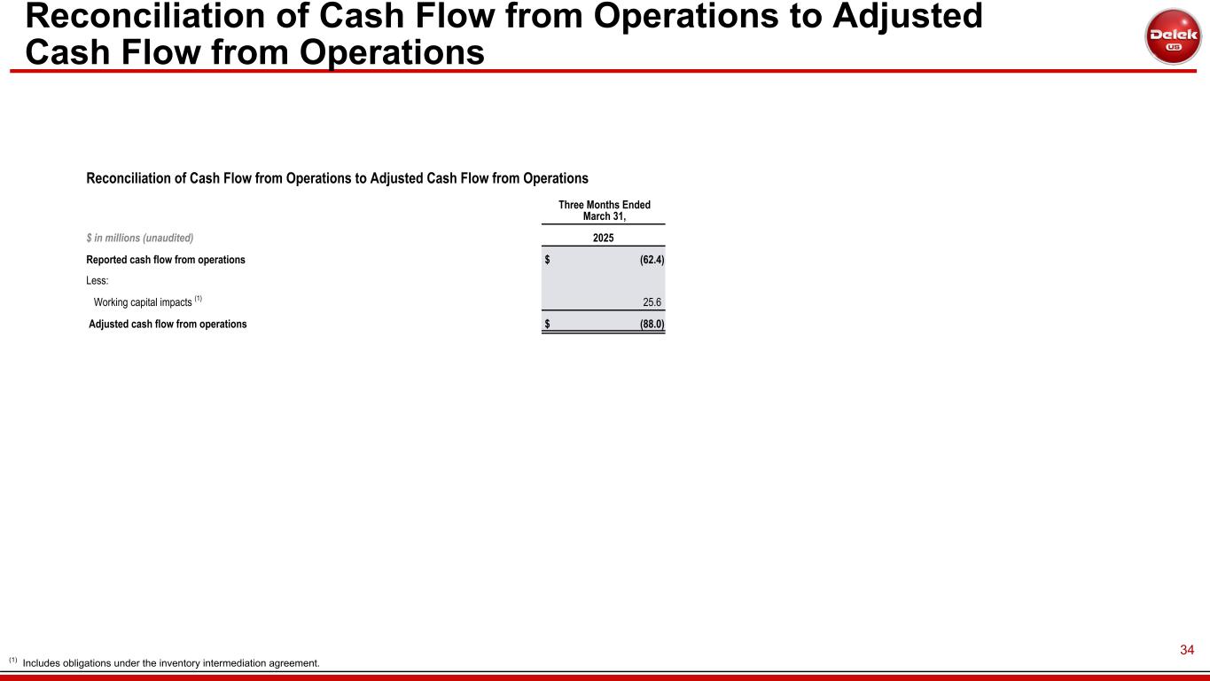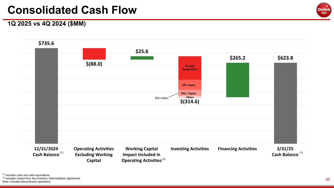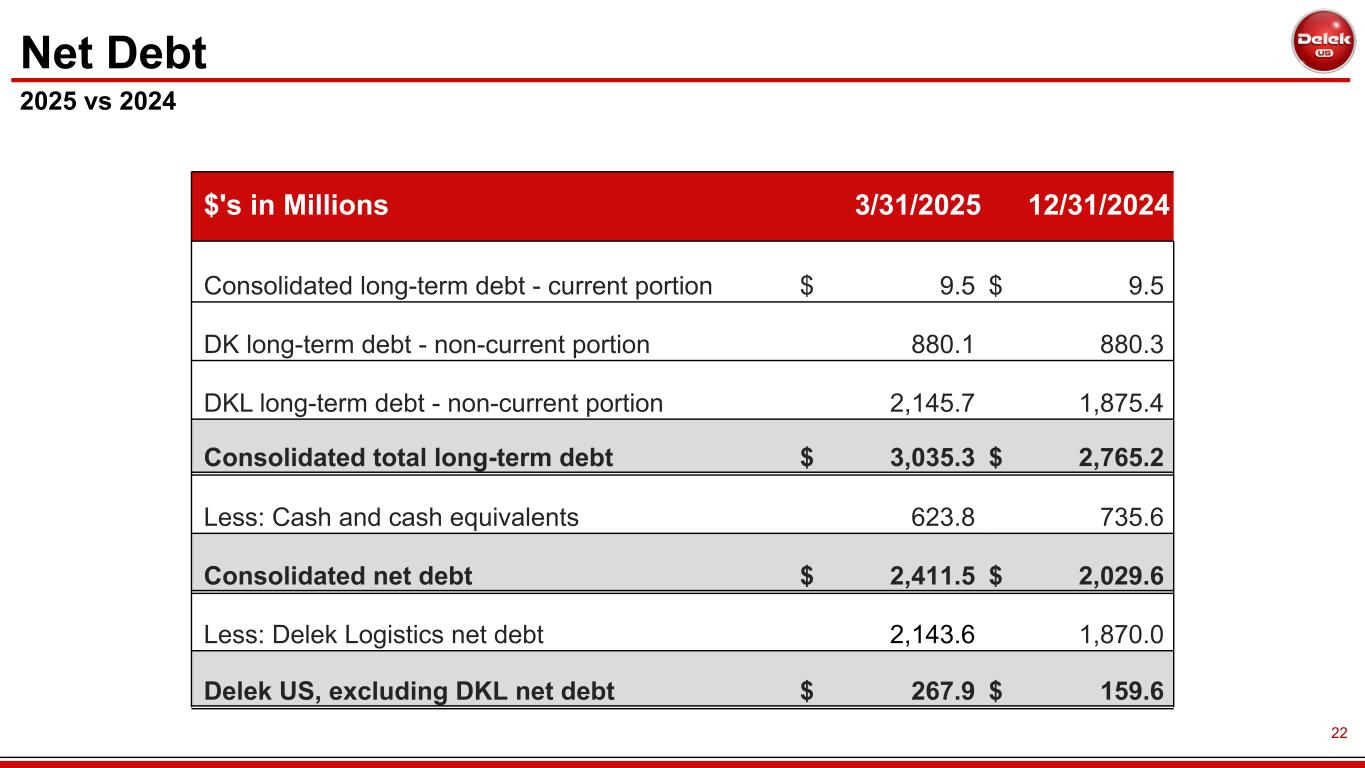 2025年3月31日現在、Delek USの現金残高は6億2,380万ドル、連結長期債務総額は30億3,530万ドルで、純負債は24億1,150万ドルとなっている。2025年3月31日現在、Delek Logistics Partners, LP(NYSE: DKL)(以下「Delek Logistics」)の現金残高は210万ドル、長期借入金総額は21億4,570万ドルで、Delek USの貸借対照表の連結金額に含まれています。Delek Logisticsを除くと、Delek USの現金は6億2,170万ドル、長期借入金は8億8,960万ドル、純有利子負債は2億6,790万ドルであった。