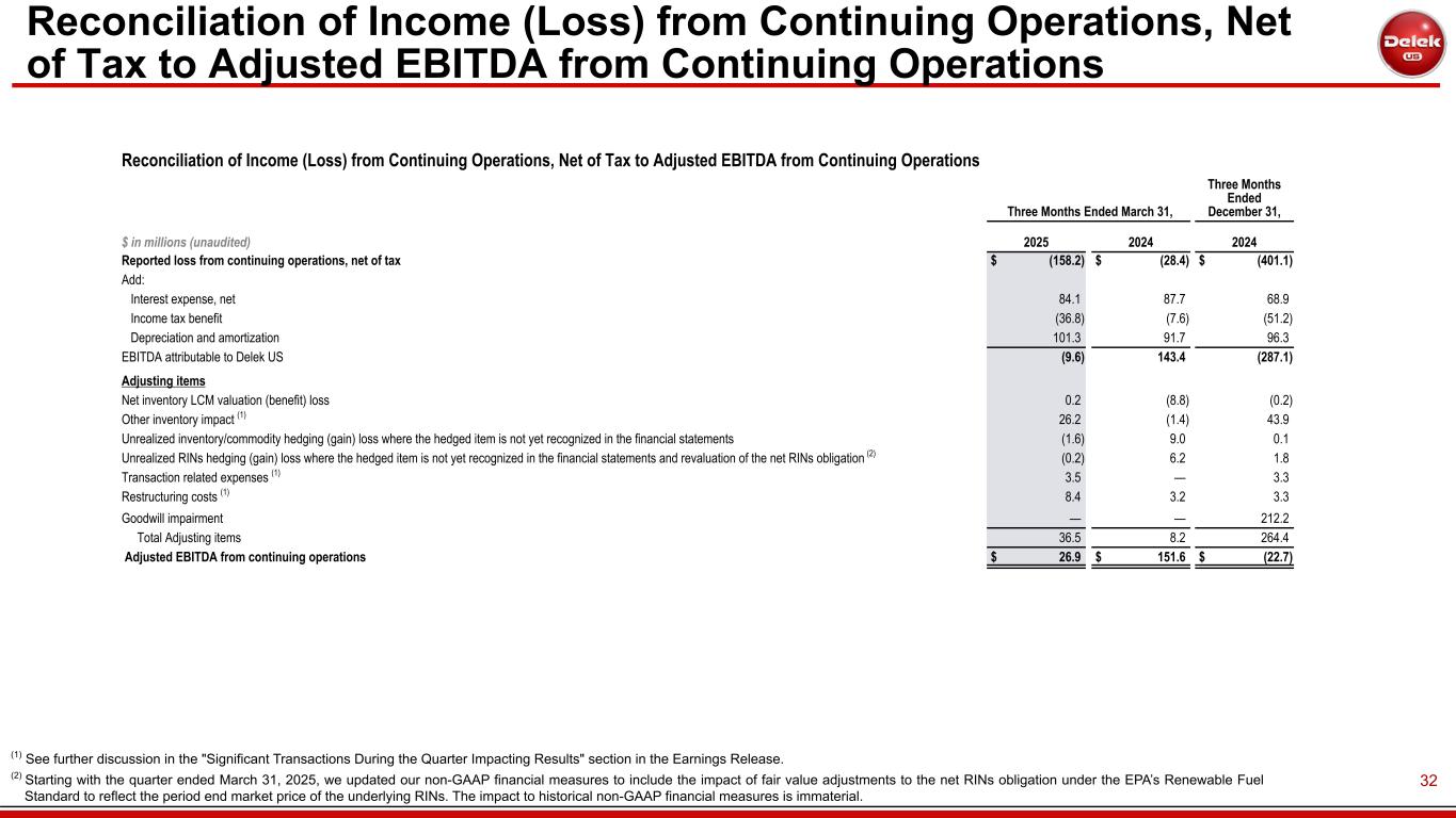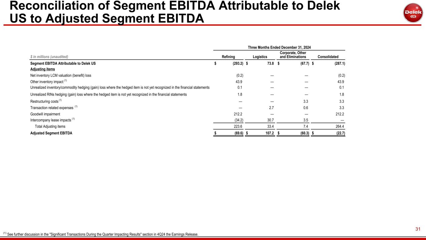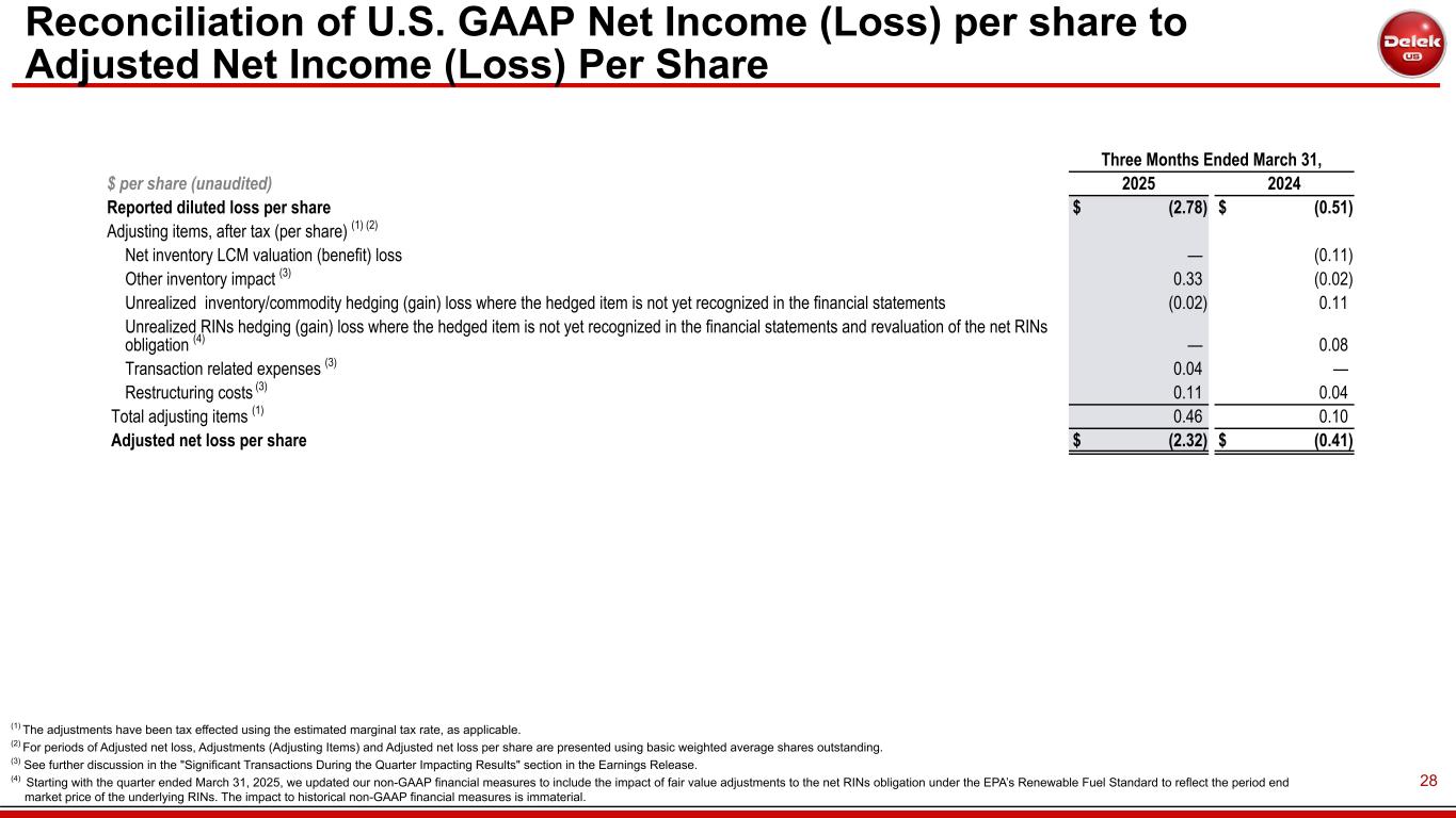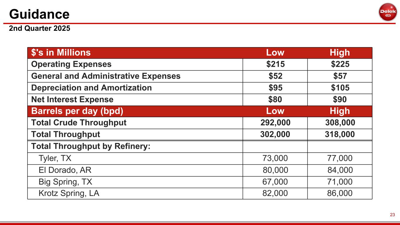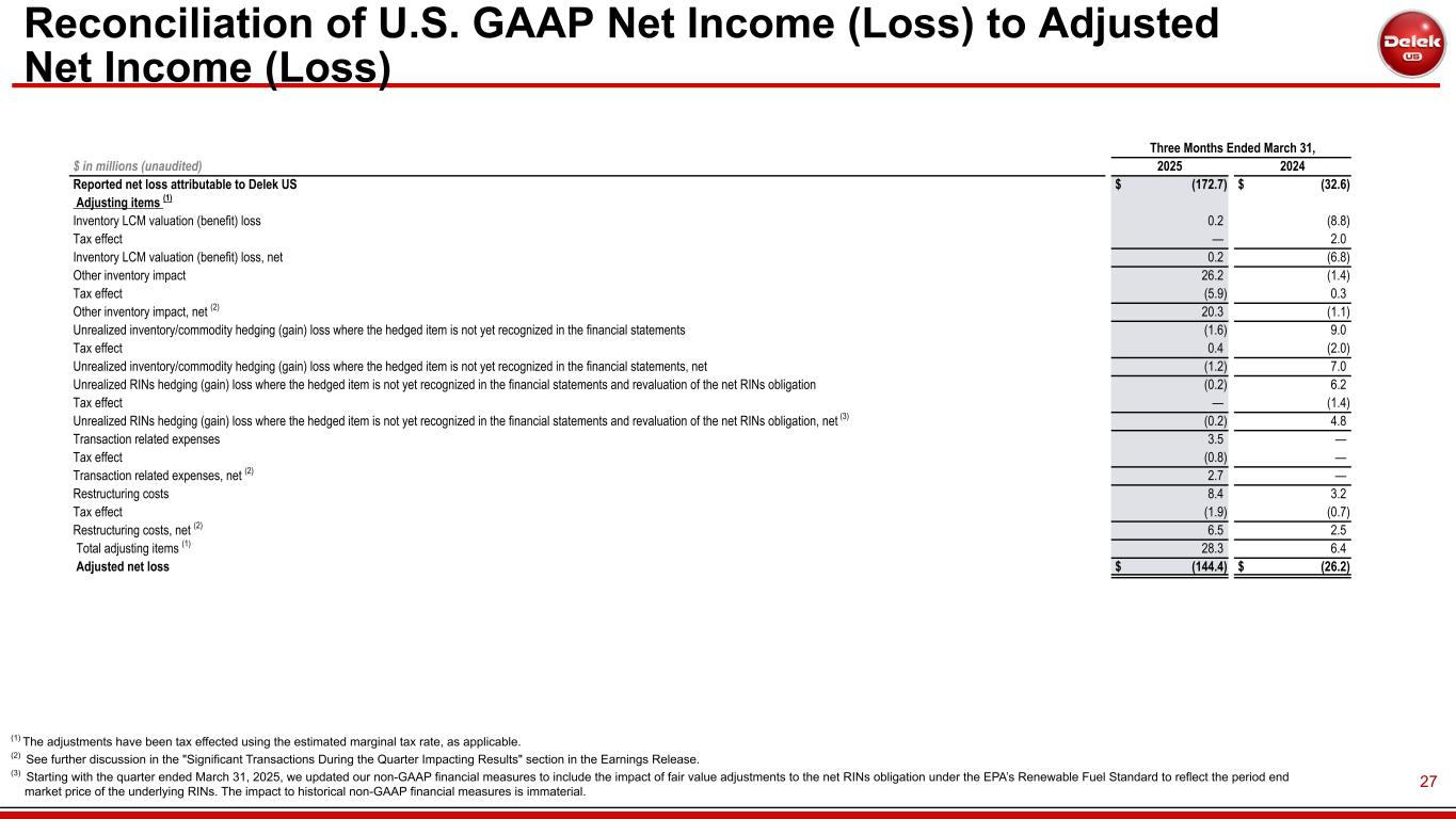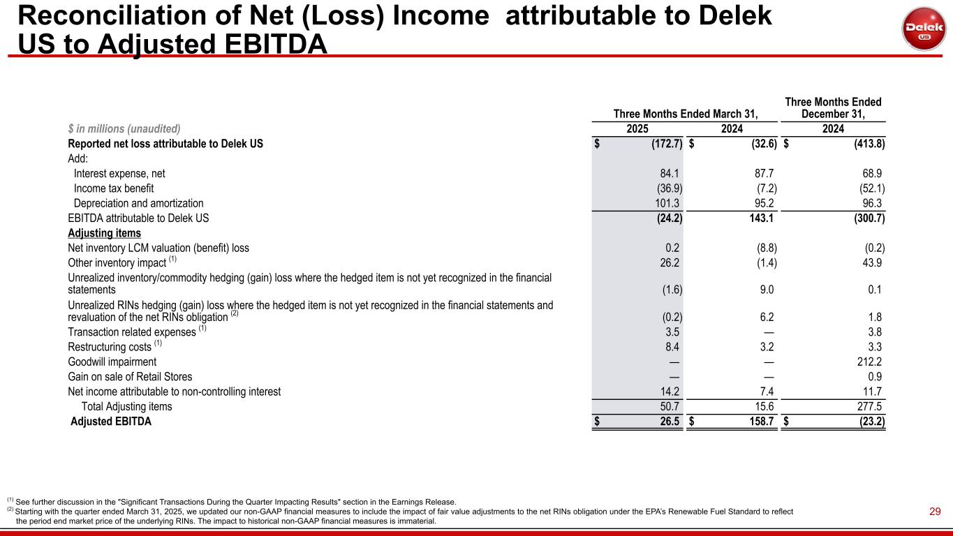 2025年3月31日現在、Delek USの現金残高は6億2,380万ドル、連結長期債務総額は30億3,530万ドルで、純負債は24億1,150万ドルとなっている。2025年3月31日現在、Delek Logistics Partners, LP(NYSE: DKL)(以下「Delek Logistics」)の現金残高は210万ドル、長期借入金総額は21億4,570万ドルで、Delek USの貸借対照表の連結金額に含まれています。Delek Logisticsを除くと、Delek USの現金は6億2,170万ドル、長期借入金は8億8,960万ドル、純有利子負債は2億6,790万ドルであった。