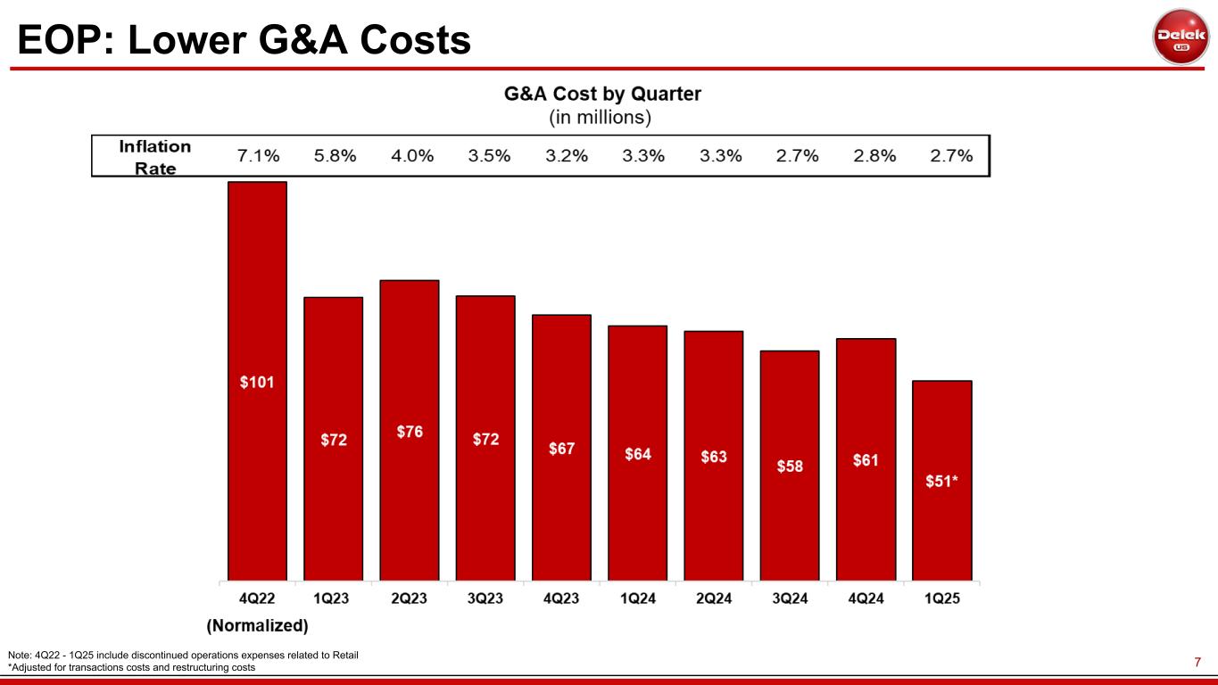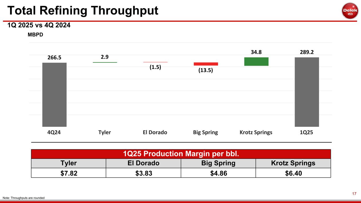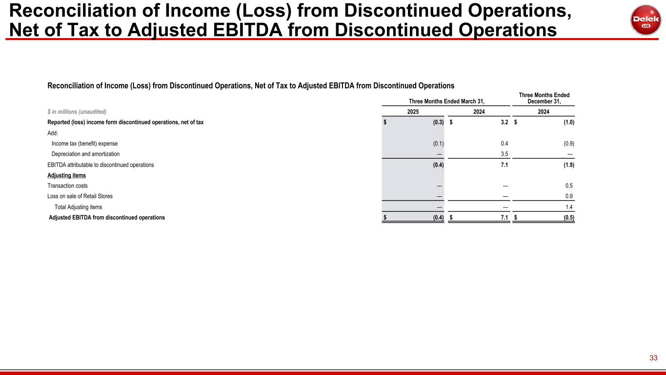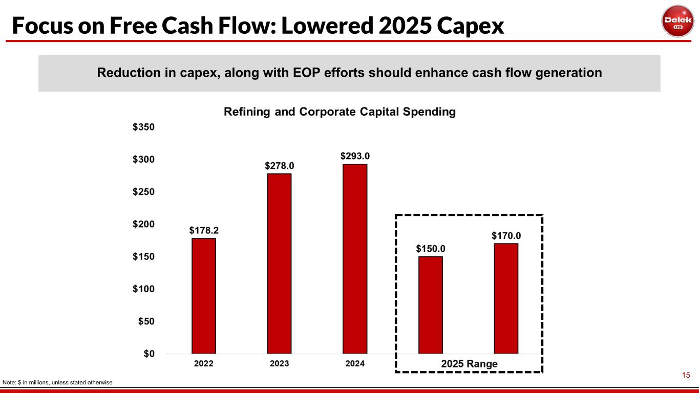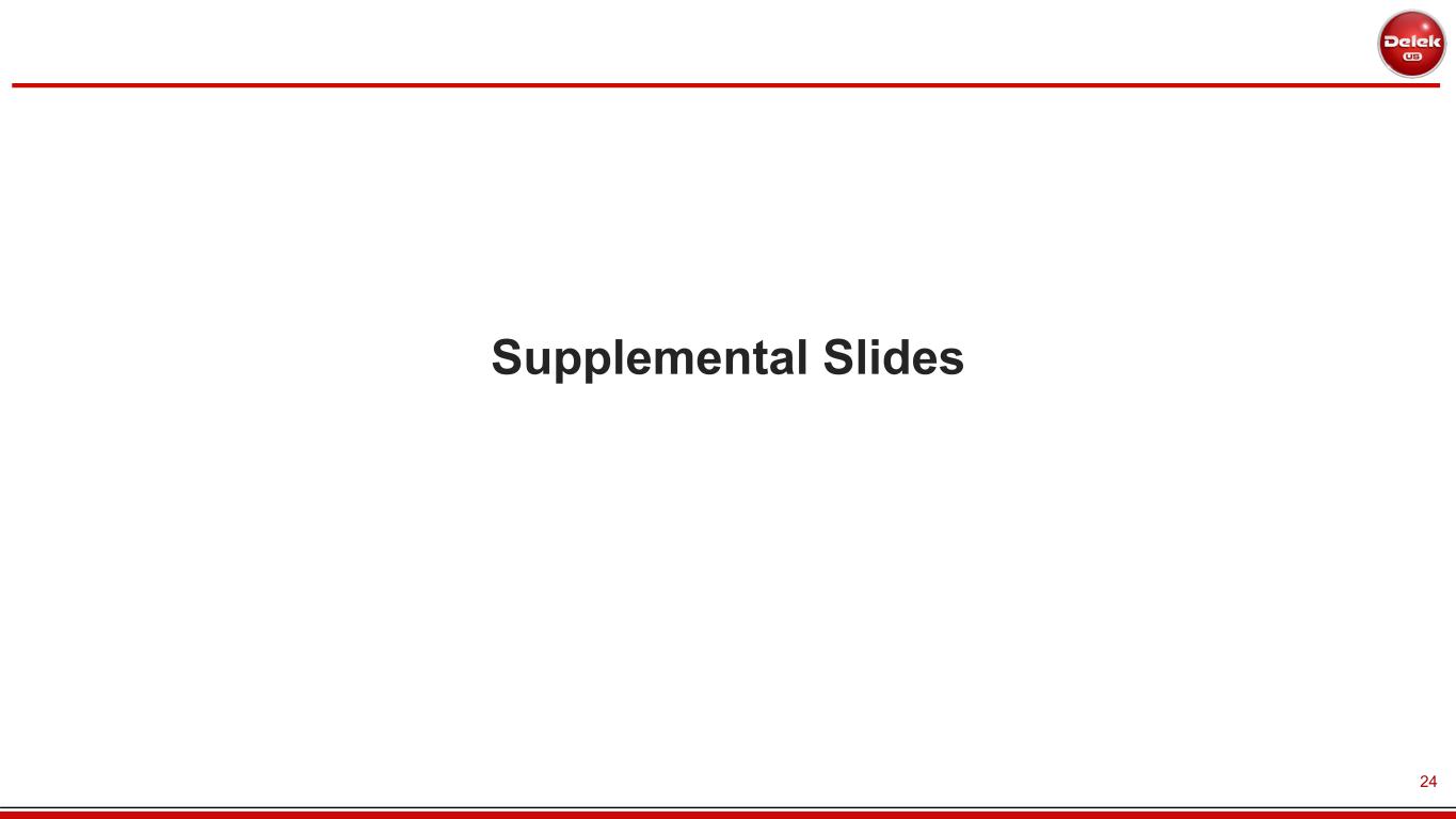 2025年3月31日現在、Delek USの現金残高は6億2,380万ドル、連結長期債務総額は30億3,530万ドルで、純負債は24億1,150万ドルとなっている。2025年3月31日現在、Delek Logistics Partners, LP(NYSE: DKL)(以下「Delek Logistics」)の現金残高は210万ドル、長期借入金総額は21億4,570万ドルで、Delek USの貸借対照表の連結金額に含まれています。Delek Logisticsを除くと、Delek USの現金は6億2,170万ドル、長期借入金は8億8,960万ドル、純有利子負債は2億6,790万ドルであった。