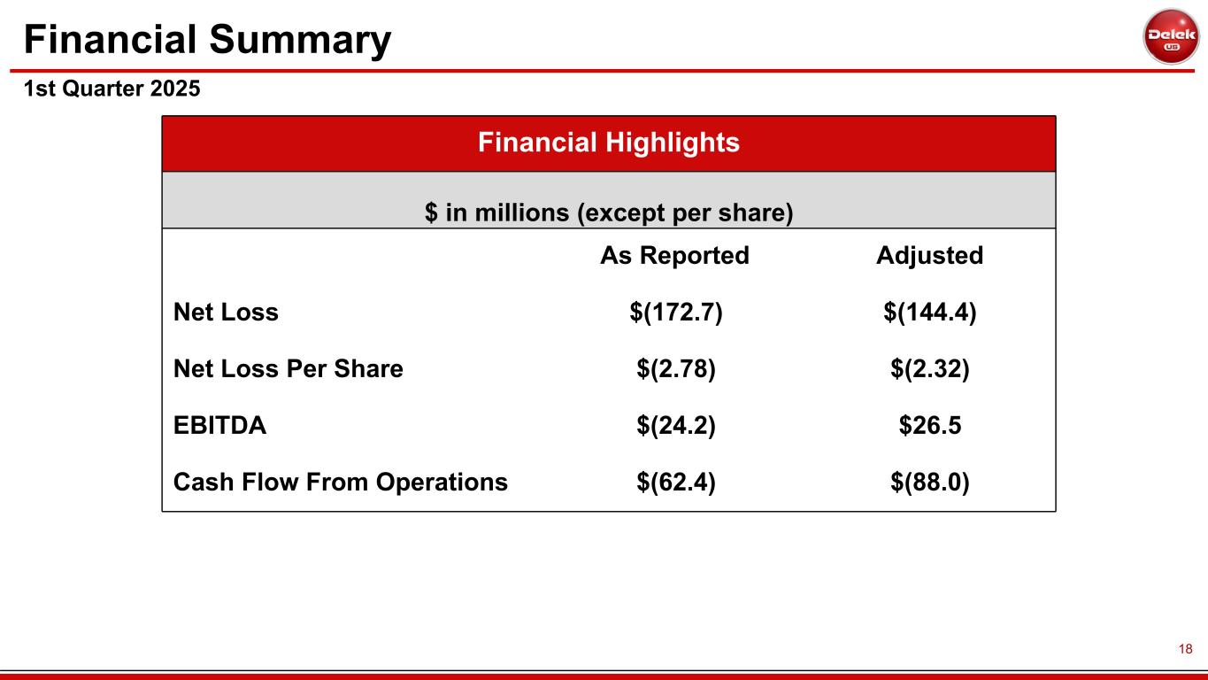 テネシー州セントウッド--2025年5月7日--Delek US Holdings, Inc. (NYSE: DK)(以下、Delek US)は本日、2025年3月31日を期末とする第1四半期の業績を発表した。