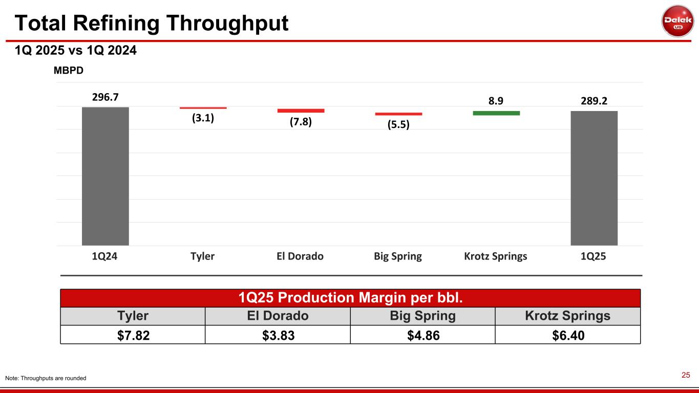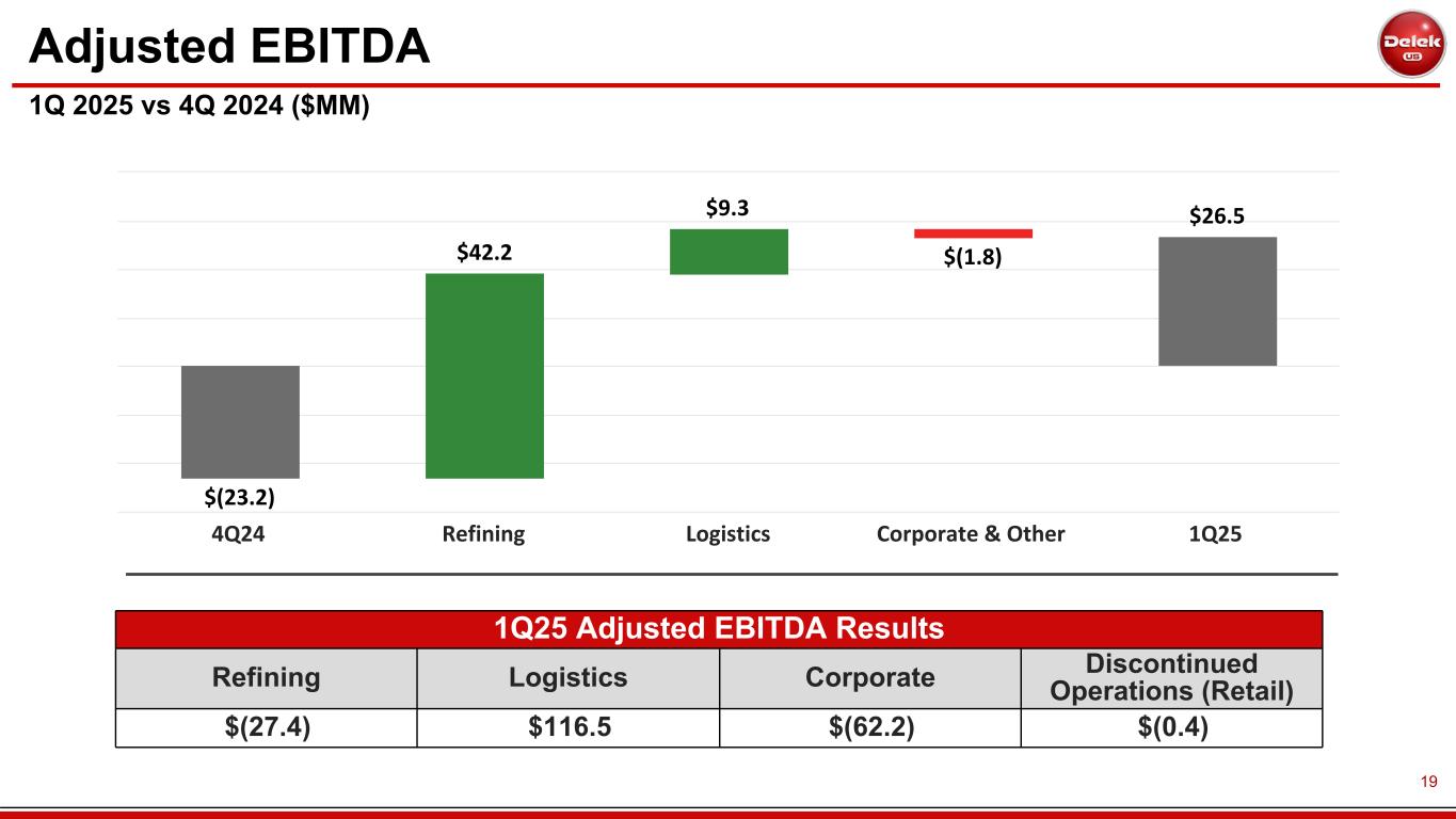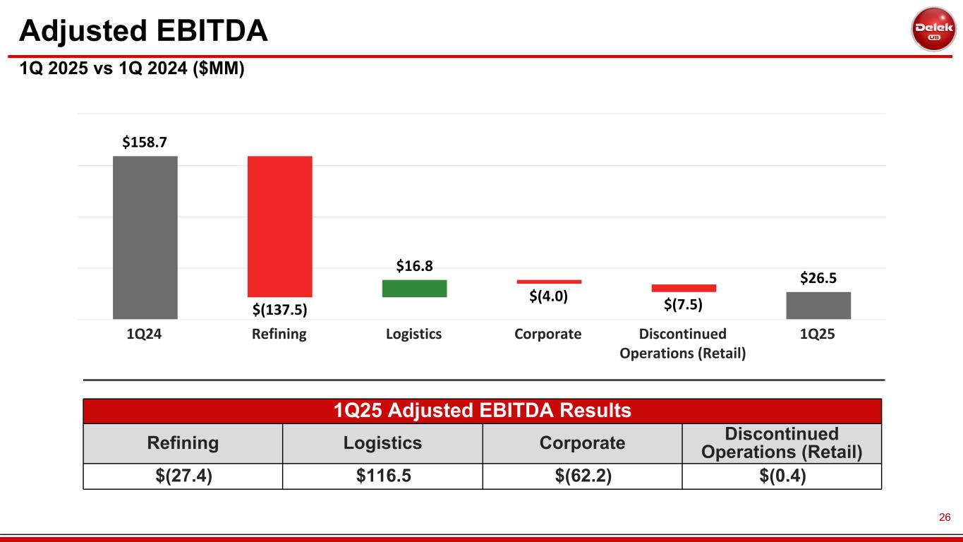 精製部門の調整後 EBITDA は、前年同期の 1 億 1,010 万ドルに対し、2025 年第 1 四半期は(2,740 万ドル)となり、2025 年第 1 四半期は 2,620 万ドル、2024 年第 1 四半期は(140 万ドル)のその他在庫の影響を反映しました。2024年比で減少しているのは、主に精製クラック・スプレッドの低下によるものです。2025年第1四半期のDelek USのベンチマーク・クラック・スプレッドは、前年同期比で平均29.8%低下しました。
