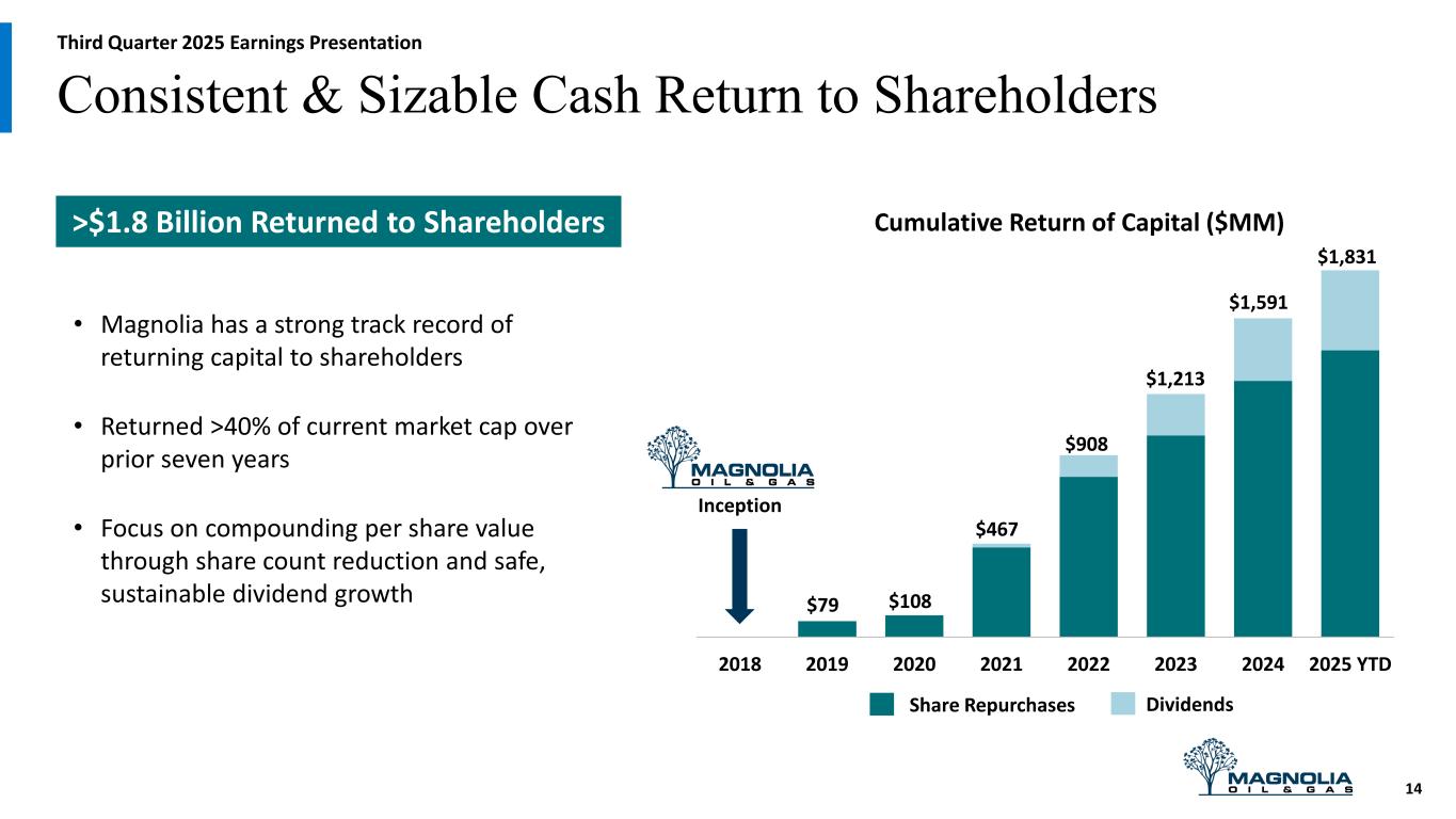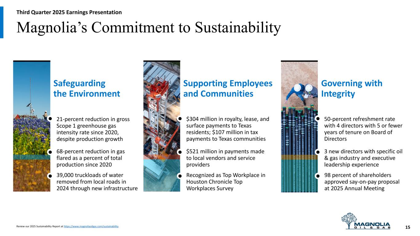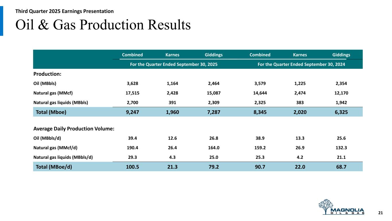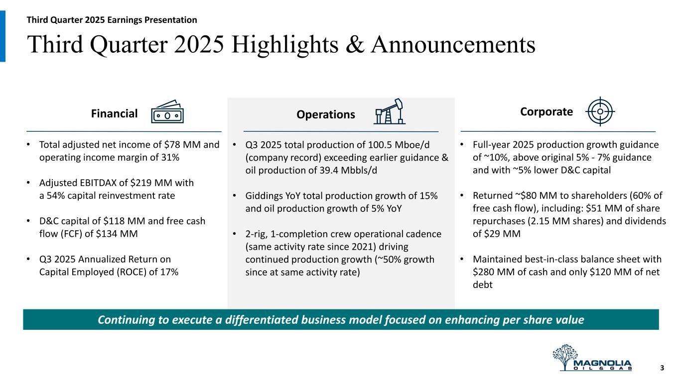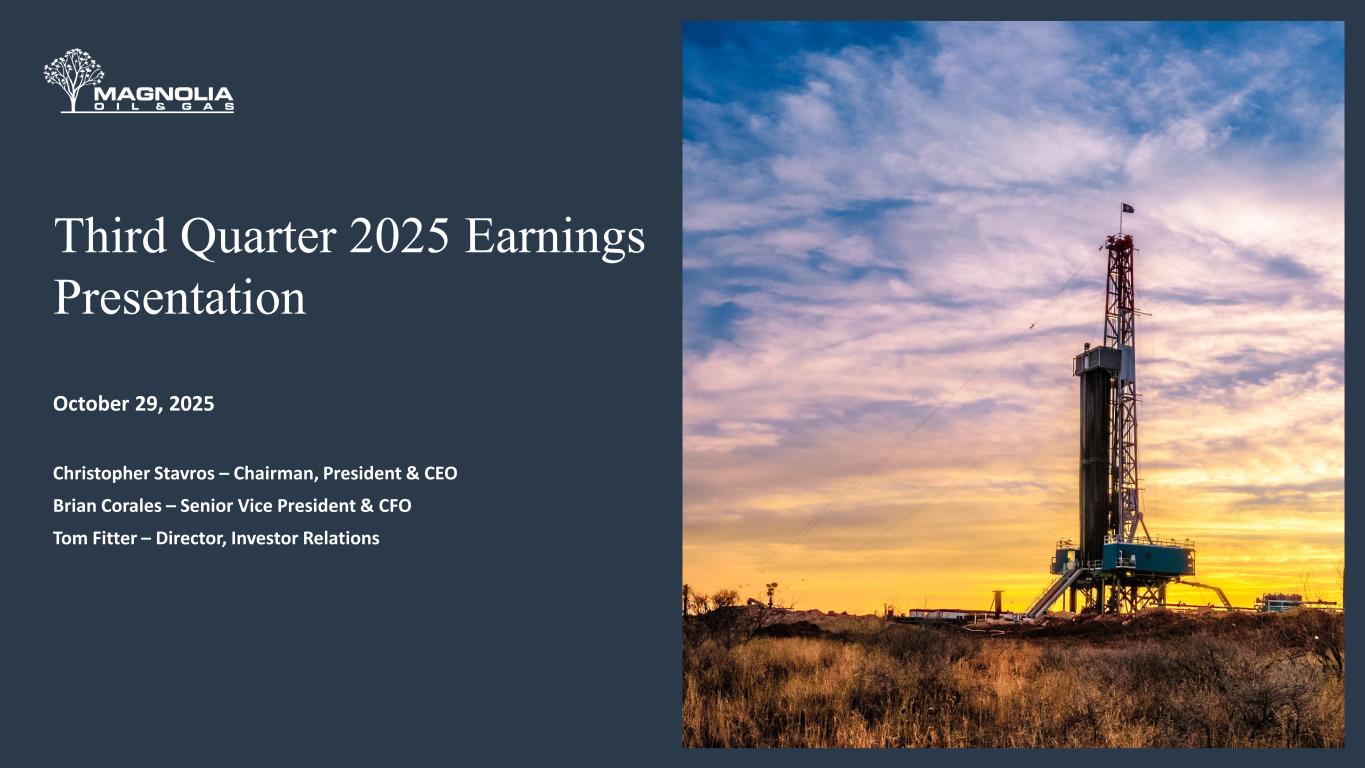 2025年10月29日、テキサス州ヒューストン - マグノリア・オイル・アンド・ガス・コーポレーション(「マグノリア」、「当社」、「当社」)は本日、2025年第3四半期の財務・経営成績を発表した。