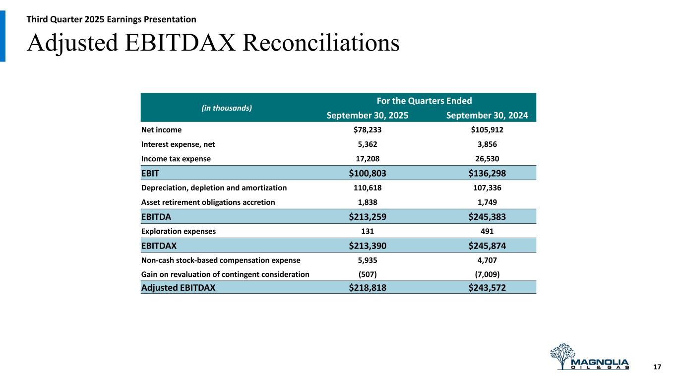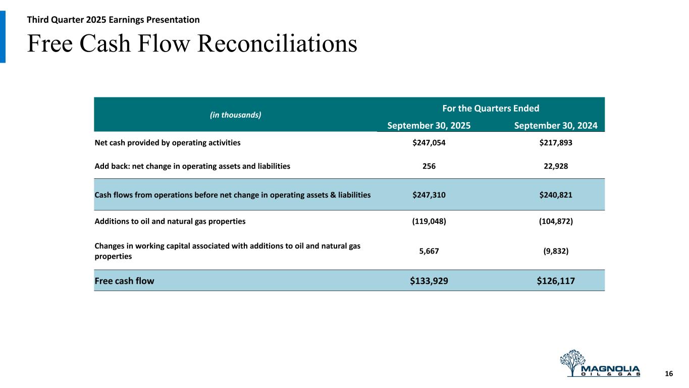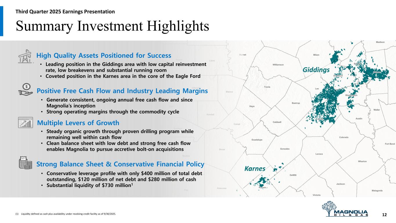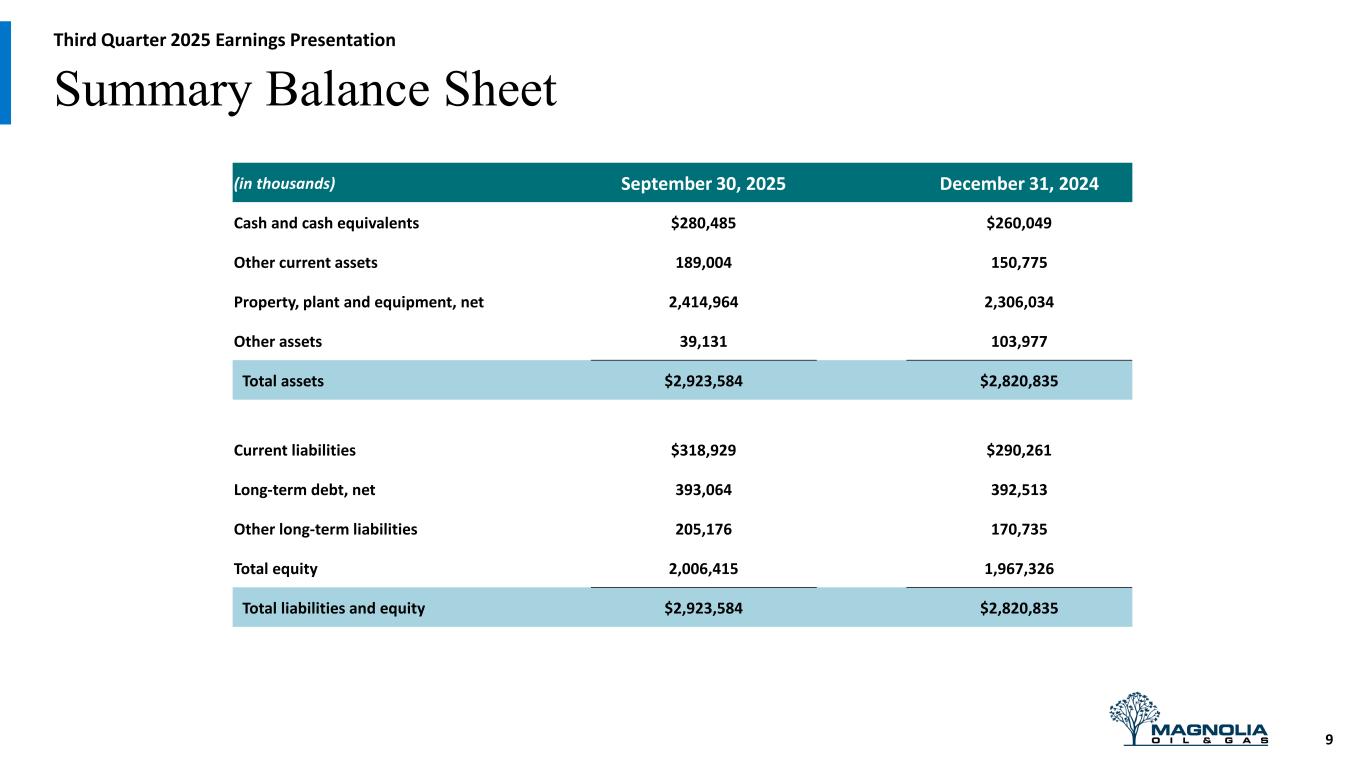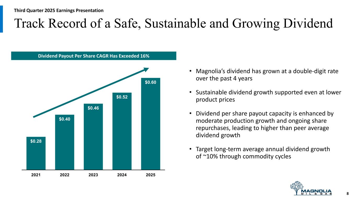 2025年10月29日、テキサス州ヒューストン - マグノリア・オイル・アンド・ガス・コーポレーション(「マグノリア」、「当社」、「当社」)は本日、2025年第3四半期の財務・経営成績を発表した。