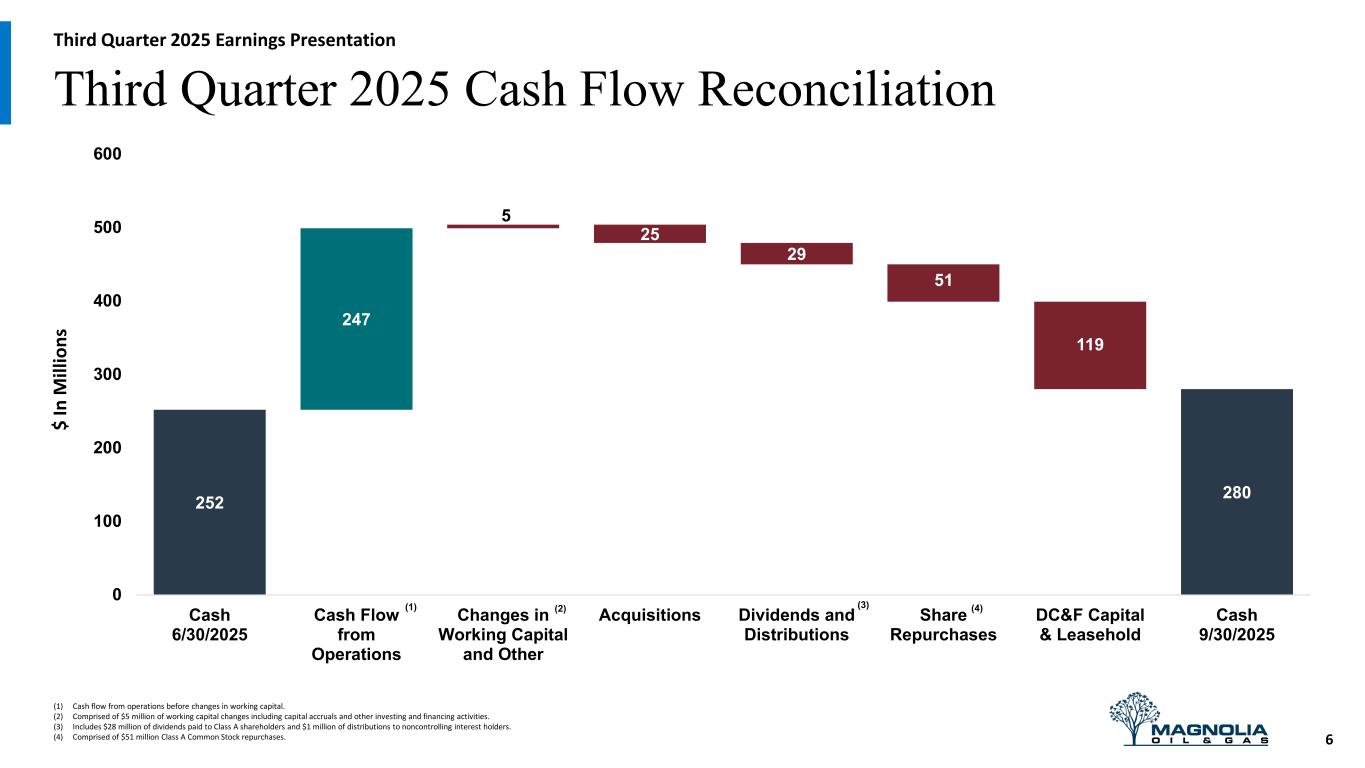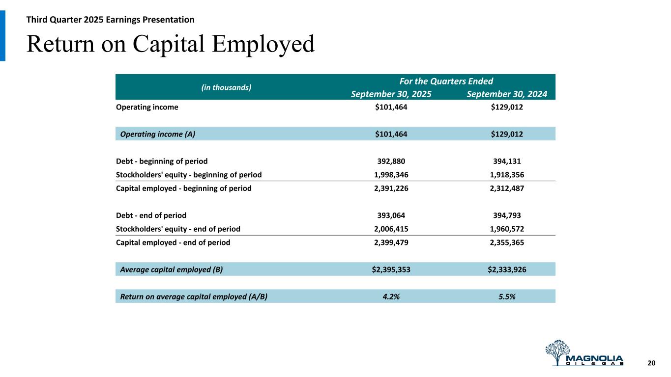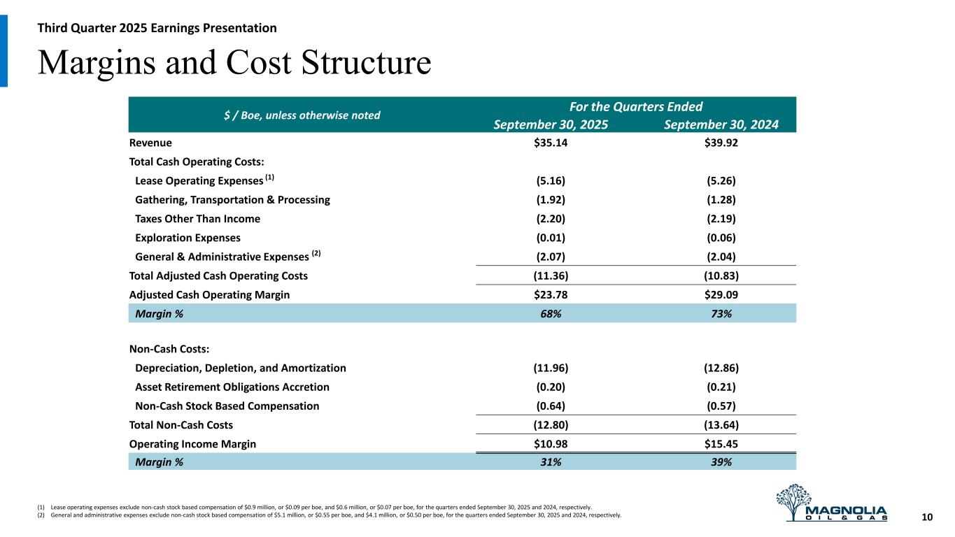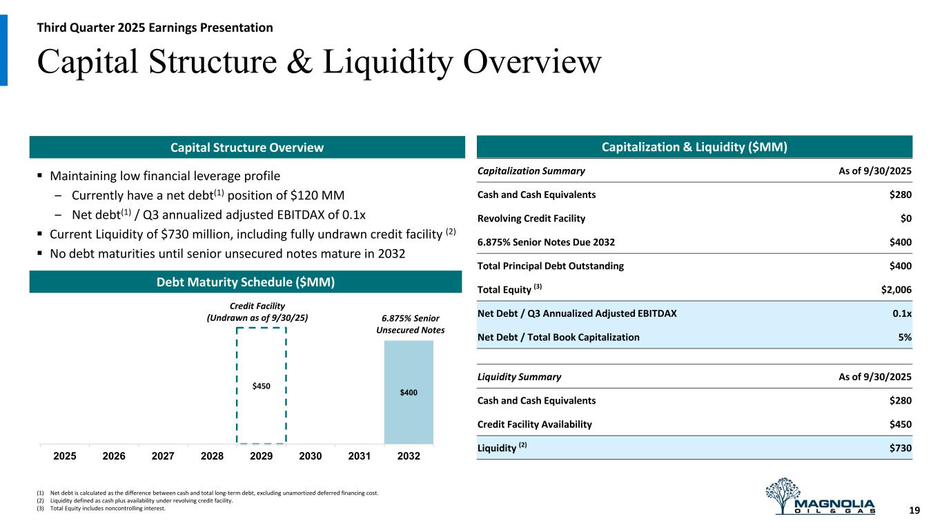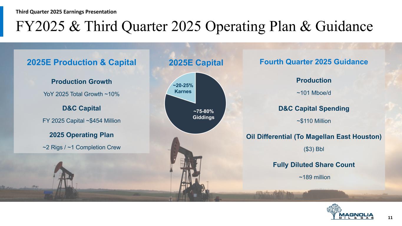 原油価格差は、マゼラン・イースト・ヒューストンに対してバレル当たり約3ドルのディスカウントとなる見込みで、マグノリアは全ての石油・天然ガス生産において完全なノン・ヘッジを維持する。2025年第4四半期の完全希薄化後の株式数は約1億8900万株となる見込みで、これは2024年第4四半期の水準より約4%低い。