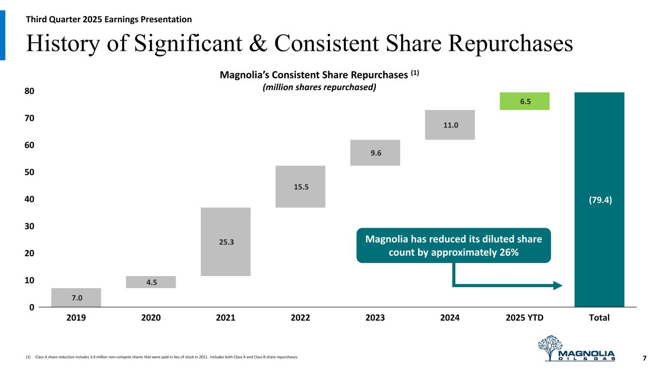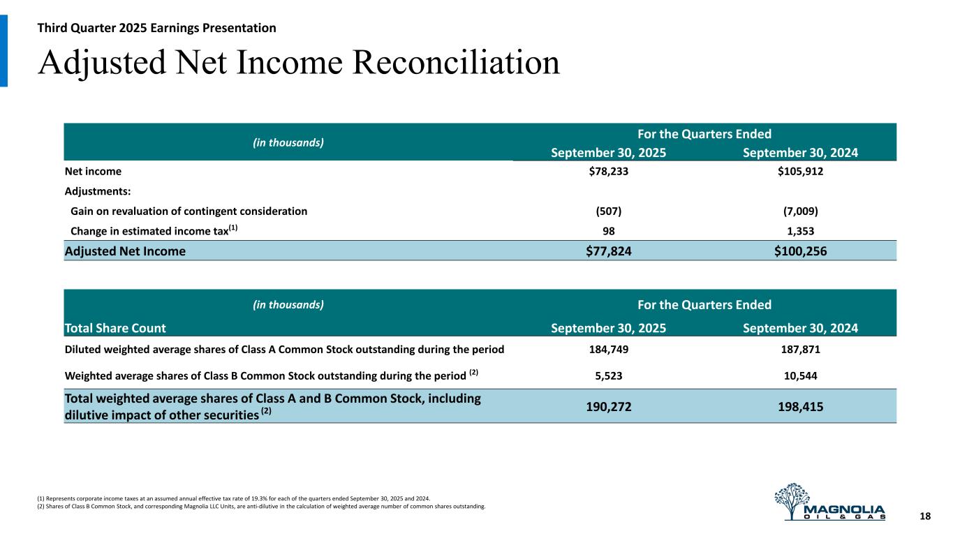 -マグノリアは、クラスA普通株式に帰属する2025年度第3四半期の純利益を7,550万ドル(希薄化後1株当たり0.40ドル)と発表した。2025年度第3四半期の純利益合計は7,820万ドル、調整後純利益(1)合計は7,780万ドルでした。希薄化後の加重平均発行済み株式総数は2024年第3四半期に比べ4%減少し、1億9,030万株(2)となった。
