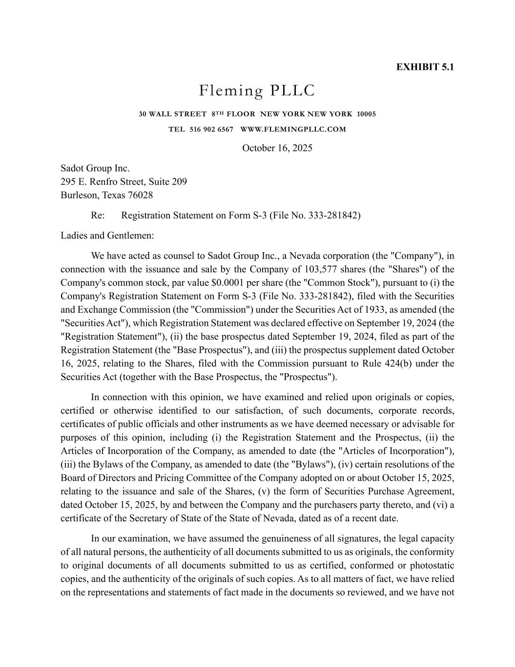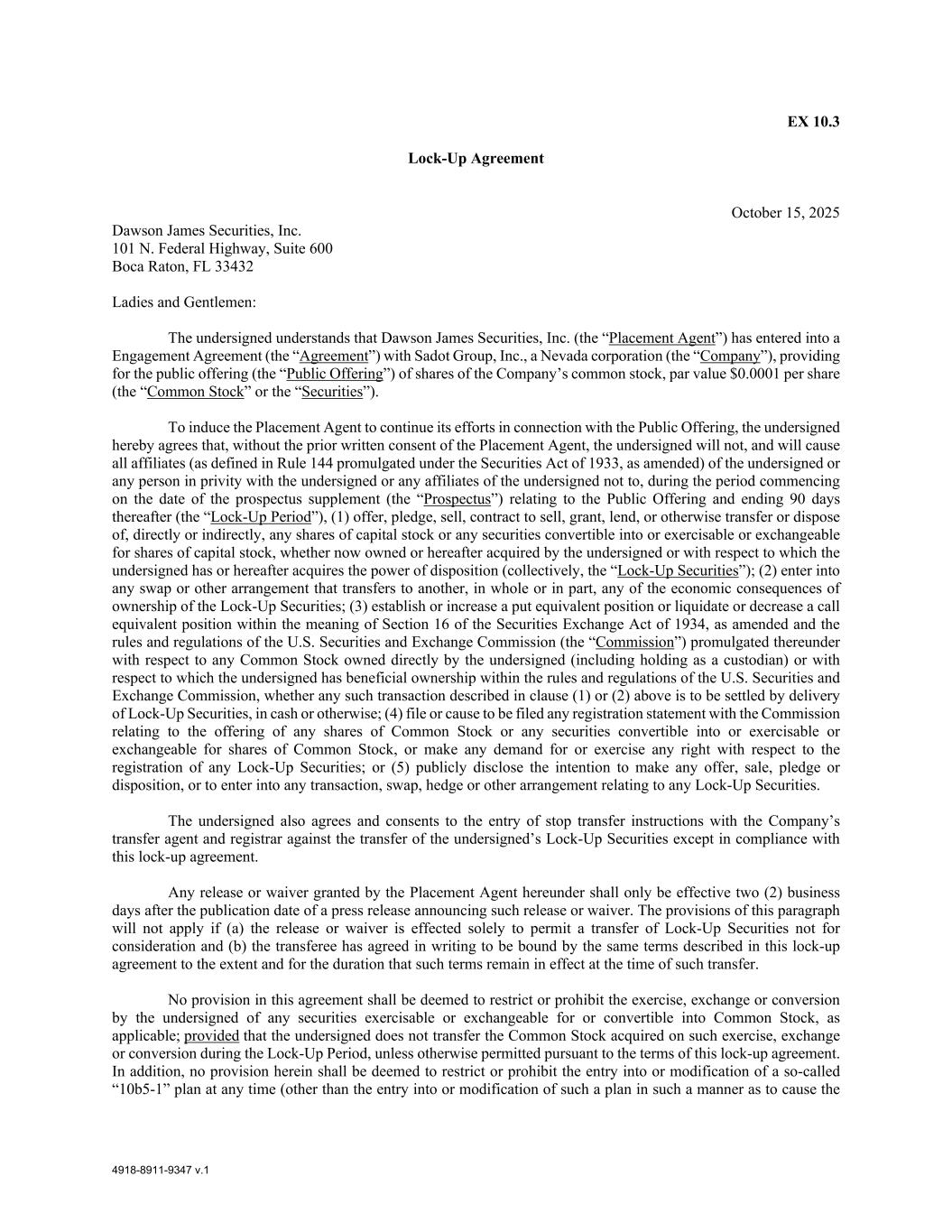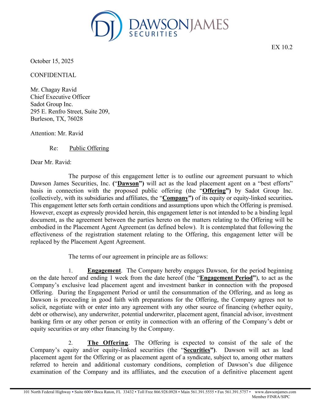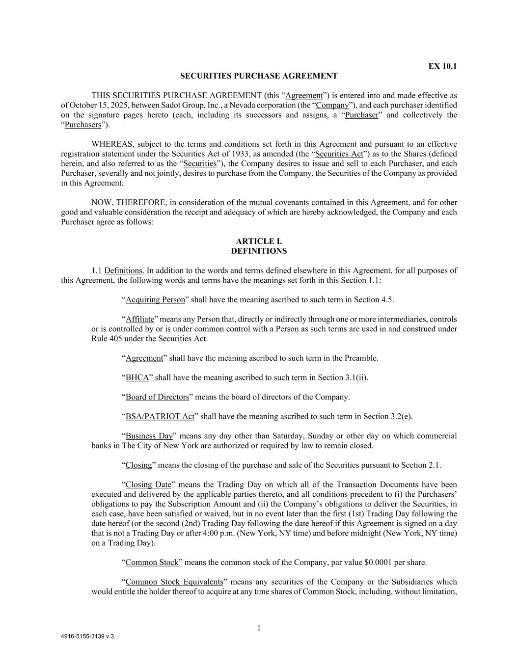 1 4916-5155-3139 v.3 EX 10.1 SECURITIES PURCHASE AGREEMENT THIS SECURITIES PURCHASE AGREEMENT (this “Agreement”) is entered into and made effective as of October 15, 2025, between Sadot Group, Inc., a Nevada corporation (the “Company”), and each purchaser identified on the signature pages hereto (each, including its successors and assigns, a “Purchaser” and collectively the “Purchasers”). WHEREAS, subject to the terms and conditions set forth in this Agreement and pursuant to an effective registration statement under the Securities Act of 1933, as amended (the “Securities Act”) as to the Shares (defined herein, and also referred to as the “Securities”), the Company desires to issue and sell to each Purchaser, and each Purchaser, severally and not jointly, desires to purchase from the Company, the Securities of the Company as provided in this Agreement. NOW, THEREFORE, in consideration of the mutual covenants contained in this Agreement, and for other good and valuable consideration the receipt and adequacy of which are hereby acknowledged, the Company and each Purchaser agree as follows: ARTICLE I. DEFINITIONS 1.1 Definitions. In addition to the words and terms defined elsewhere in this Agreement, for all purposes of this Agreement, the following words and terms have the meanings set forth in this Section 1.1: “Acquiring Person” shall have the meaning ascribed to such term in Section 4.5. “Affiliate” means any Person that, directly or indirectly through one or more intermediaries, controls or is controlled by or is under common control with a Person as such terms are used in and construed under Rule 405 under the Securities Act. “Agreement” shall have the meaning ascribed to such term in the Preamble. “BHCA” shall have the meaning ascribed to such term in Section 3.1(ii). “Board of Directors” means the board of directors of the Company. “BSA/PATRIOT Act” shall have the meaning ascribed to such term in Section 3.2(e). “Business Day” means any day other than Saturday, Sunday or other day on which commercial banks in The City of New York are authorized or required by law to remain closed. “Closing” means the closing of the purchase and sale of the Securities pursuant to Section 2.1. “Closing Date” means the Trading Day on which all of the Transaction Documents have been executed and delivered by the applicable parties thereto, and all conditions precedent to (i) the Purchasers’ obligations to pay the Subscription Amount and (ii) the Company’s obligations to deliver the Securities, in each case, have been satisfied or waived, but in no event later than the first (1st) Trading Day following the date hereof (or the second (2nd) Trading Day following the date hereof if this Agreement is signed on a day that is not a Trading Day or after 4:00 p.m. (New York, NY time) and before midnight (New York, NY time) on a Trading Day). “Common Stock” means the common stock of the Company, par value $0.0001 per share. “Common Stock Equivalents” means any securities of the Company or the Subsidiaries which would entitle the holder thereof to acquire at any time shares of Common Stock, including, without limitation,
