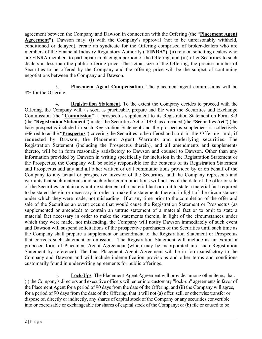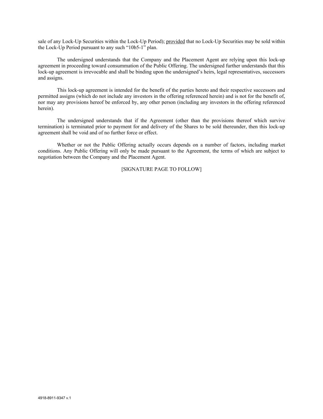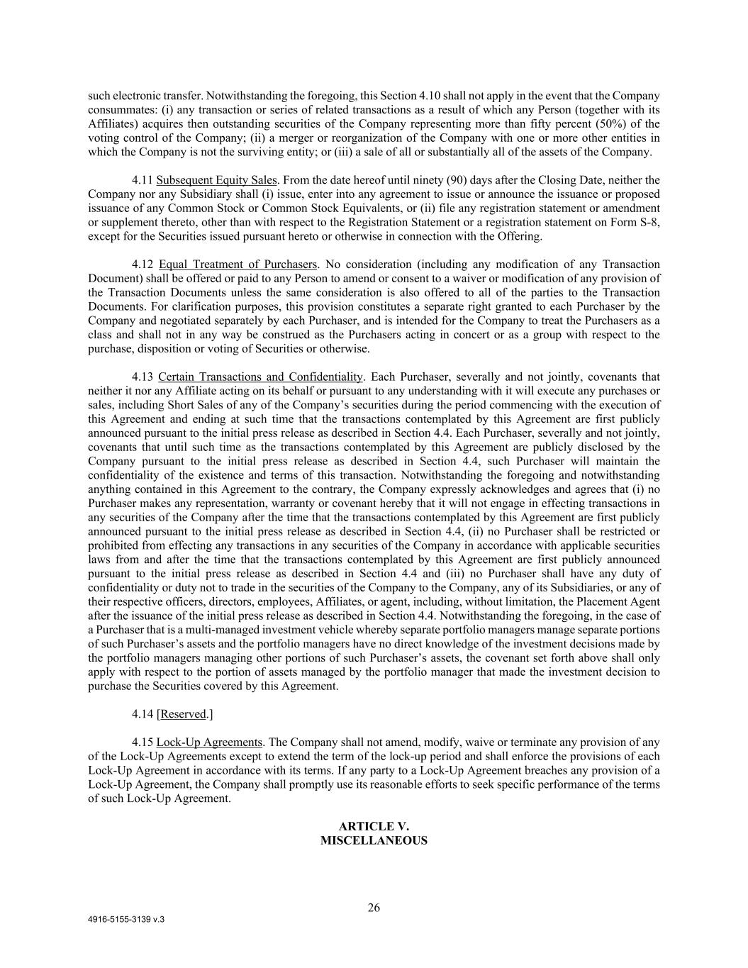 26 4916-5155-3139 v.3 such electronic transfer. Notwithstanding the foregoing, this Section 4.10 shall not apply in the event that the Company consummates: (i) any transaction or series of related transactions as a result of which any Person (together with its Affiliates) acquires then outstanding securities of the Company representing more than fifty percent (50%) of the voting control of the Company; (ii) a merger or reorganization of the Company with one or more other entities in which the Company is not the surviving entity; or (iii) a sale of all or substantially all of the assets of the Company. 4.11 Subsequent Equity Sales. From the date hereof until ninety (90) days after the Closing Date, neither the Company nor any Subsidiary shall (i) issue, enter into any agreement to issue or announce the issuance or proposed issuance of any Common Stock or Common Stock Equivalents, or (ii) file any registration statement or amendment or supplement thereto, other than with respect to the Registration Statement or a registration statement on Form S-8, except for the Securities issued pursuant hereto or otherwise in connection with the Offering. 4.12 Equal Treatment of Purchasers. No consideration (including any modification of any Transaction Document) shall be offered or paid to any Person to amend or consent to a waiver or modification of any provision of the Transaction Documents unless the same consideration is also offered to all of the parties to the Transaction Documents. For clarification purposes, this provision constitutes a separate right granted to each Purchaser by the Company and negotiated separately by each Purchaser, and is intended for the Company to treat the Purchasers as a class and shall not in any way be construed as the Purchasers acting in concert or as a group with respect to the purchase, disposition or voting of Securities or otherwise. 4.13 Certain Transactions and Confidentiality. Each Purchaser, severally and not jointly, covenants that neither it nor any Affiliate acting on its behalf or pursuant to any understanding with it will execute any purchases or sales, including Short Sales of any of the Company’s securities during the period commencing with the execution of this Agreement and ending at such time that the transactions contemplated by this Agreement are first publicly announced pursuant to the initial press release as described in Section 4.4. Each Purchaser, severally and not jointly, covenants that until such time as the transactions contemplated by this Agreement are publicly disclosed by the Company pursuant to the initial press release as described in Section 4.4, such Purchaser will maintain the confidentiality of the existence and terms of this transaction. Notwithstanding the foregoing and notwithstanding anything contained in this Agreement to the contrary, the Company expressly acknowledges and agrees that (i) no Purchaser makes any representation, warranty or covenant hereby that it will not engage in effecting transactions in any securities of the Company after the time that the transactions contemplated by this Agreement are first publicly announced pursuant to the initial press release as described in Section 4.4, (ii) no Purchaser shall be restricted or prohibited from effecting any transactions in any securities of the Company in accordance with applicable securities laws from and after the time that the transactions contemplated by this Agreement are first publicly announced pursuant to the initial press release as described in Section 4.4 and (iii) no Purchaser shall have any duty of confidentiality or duty not to trade in the securities of the Company to the Company, any of its Subsidiaries, or any of their respective officers, directors, employees, Affiliates, or agent, including, without limitation, the Placement Agent after the issuance of the initial press release as described in Section 4.4. Notwithstanding the foregoing, in the case of a Purchaser that is a multi-managed investment vehicle whereby separate portfolio managers manage separate portions of such Purchaser’s assets and the portfolio managers have no direct knowledge of the investment decisions made by the portfolio managers managing other portions of such Purchaser’s assets, the covenant set forth above shall only apply with respect to the portion of assets managed by the portfolio manager that made the investment decision to purchase the Securities covered by this Agreement. 4.14 [Reserved.] 4.15 Lock-Up Agreements. The Company shall not amend, modify, waive or terminate any provision of any of the Lock-Up Agreements except to extend the term of the lock-up period and shall enforce the provisions of each Lock-Up Agreement in accordance with its terms. If any party to a Lock-Up Agreement breaches any provision of a Lock-Up Agreement, the Company shall promptly use its reasonable efforts to seek specific performance of the terms of such Lock-Up Agreement. ARTICLE V. MISCELLANEOUS
