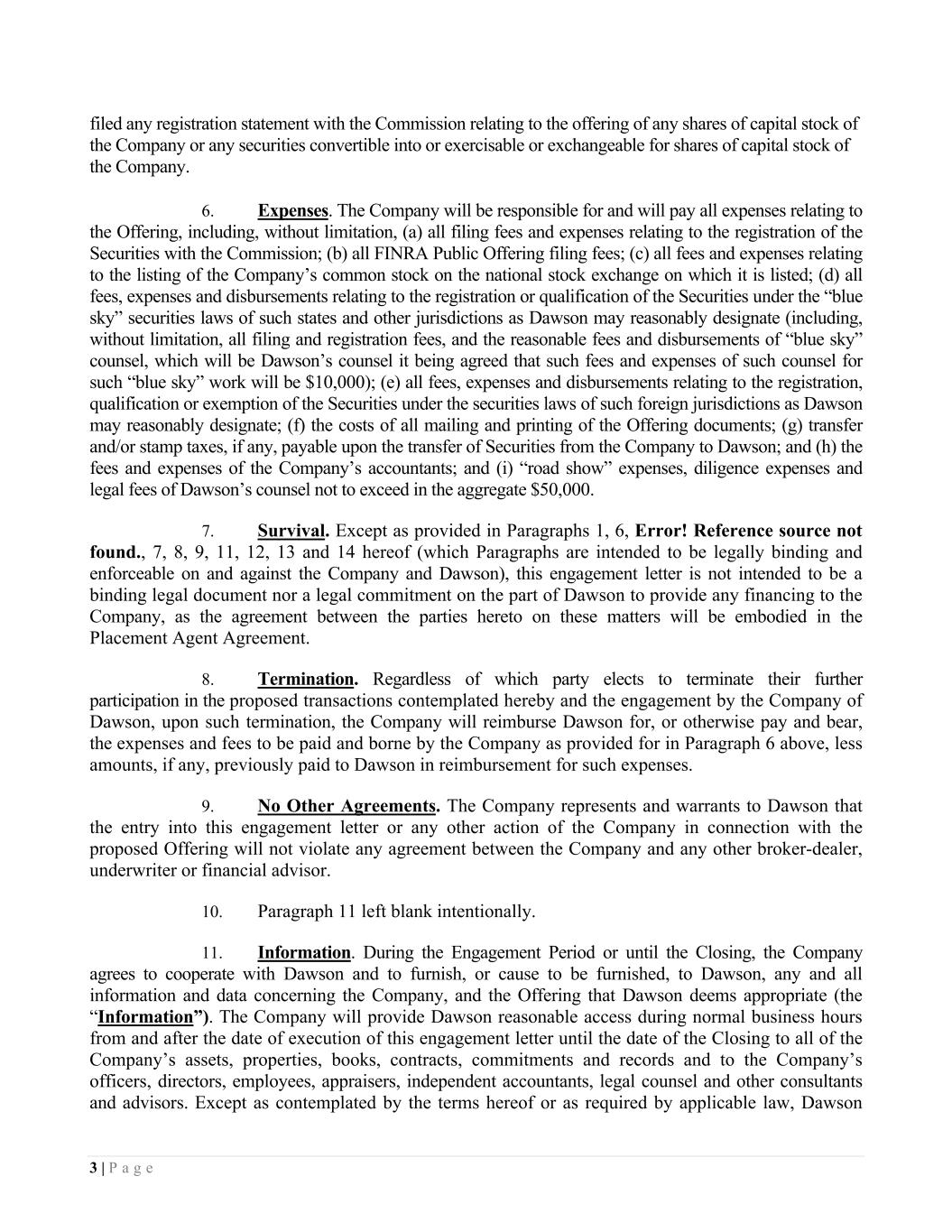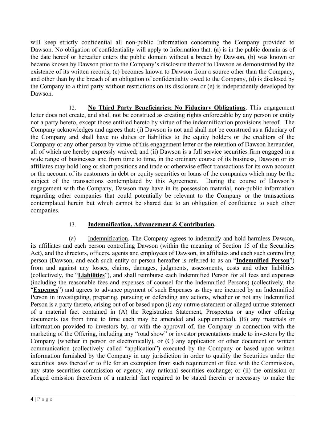 24 4916-5155-3139 v.3 limitation, the Placement Agent, on the one hand, and any of the Purchasers or any of their Affiliates on the other hand, shall terminate and be of no further force or effect. The Company understands and confirms that each Purchaser shall be relying on the foregoing covenant in effecting transactions in securities of the Company. The Company and each Purchaser shall consult with each other in issuing any other press releases with respect to the transactions contemplated hereby, and neither the Company nor any Purchaser shall issue any such press release nor otherwise make any such public statement without the prior consent of the Company, with respect to any press release of any Purchaser, or without the prior consent of each Purchaser, with respect to any press release of the Company, which consent shall not unreasonably be withheld or delayed, except if such disclosure is required by law, in which case the disclosing party shall promptly provide the other party with prior notice of such public statement or communication. Notwithstanding the foregoing, the Company shall not publicly disclose the name of any Purchaser, or include the name of any Purchaser in any filing with the SEC or any regulatory agency or Trading Market, without the prior written consent of such Purchaser, except (a) as required by federal securities law in connection with the filing of final Transaction Documents with the SEC and (b) to the extent such disclosure is required by law or Trading Market regulations, in which case the Company shall provide the Purchasers with prior notice of such disclosure permitted under this clause (b) and reasonably cooperate with such Purchaser regarding such disclosure. 4.5 Shareholder Rights Plan. No claim will be made or enforced by the Company or, with the consent of the Company, any other Person, that any Purchaser is an “Acquiring Person” under any control share acquisition, business combination, poison pill (including any distribution under a rights agreement) or similar anti-takeover plan or arrangement in effect or hereafter adopted by the Company, or that any Purchaser could be deemed to trigger the provisions of any such plan or arrangement, by virtue of receiving Securities under the Transaction Documents or under any other agreement between the Company and the Purchasers. 4.6 Non-Public Information. Except with respect to the material terms and conditions of the transactions contemplated by the Transaction Documents, which shall be disclosed pursuant to Section 4.4, the Company covenants and agrees that neither it, nor any other Person acting on its behalf will provide any Purchaser or its agents or counsel with any information that constitutes, or the Company reasonably believes constitutes, material non-public information, unless prior thereto such Purchaser shall have consented to the receipt of such information and agreed with the Company to keep such information confidential. The Company understands and confirms that each Purchaser shall be relying on the foregoing covenant in effecting transactions in securities of the Company. To the extent that the Company delivers any material, non-public information to a Purchaser without such Purchaser’s consent, the Company hereby covenants and agrees that such Purchaser shall not have any duty of confidentiality to the Company, any of its Subsidiaries, or any of their respective officers, directors, agents, employees or Affiliates, or a duty to the Company, any of its Subsidiaries or any of their respective officers, directors, agents, employees or Affiliates not to trade on the basis of, such material, non-public information, provided that the Purchaser shall remain subject to applicable law. To the extent that any notice provided pursuant to any Transaction Document constitutes, or contains, material, non-public information regarding the Company or any Subsidiaries, the Company shall simultaneously file such notice with the SEC on a Current Report on Form 8-K or shall issue a press release containing such material non- public information. The Company understands and confirms that each Purchaser shall be relying on the foregoing covenant in effecting transactions in securities of the Company. 4.7 Use of Proceeds. The Company shall use the net proceeds from the sale of the Securities hereunder for the purposes set forth in the Prospectus, and shall not use such proceeds: (a) for the satisfaction of any portion of the Company’s debt (other than payment of trade payables in the ordinary course of the Company’s business and prior practices), (b) for the redemption of any shares of Common Stock or Common Stock Equivalents, (c) for the settlement of any outstanding litigation or (d) in violation of FCPA or OFAC regulations. 4.8 Indemnification of Purchasers. Subject to the provisions of this Section 4.8, the Company will indemnify and hold each Purchaser and its directors, officers, shareholders, members, partners, employees and agents (and any other Persons with a functionally equivalent role of a Person holding such titles notwithstanding a lack of such title or any other title), each Person who controls such Purchaser (within the meaning of Section 15 of the Securities Act and Section 20 of the Exchange Act), and the directors, officers, shareholders, agents, members, partners or employees (and any other Persons with a functionally equivalent role of a Person holding such titles notwithstanding a lack of such title or any other title) of such controlling persons (each, a “Purchaser Party”) harmless from any and all losses, liabilities, obligations, claims, contingencies, damages, costs and expenses, including all judgments, amounts paid in settlements, court costs and reasonable attorneys’ fees and costs of investigation that any such Purchaser Party may