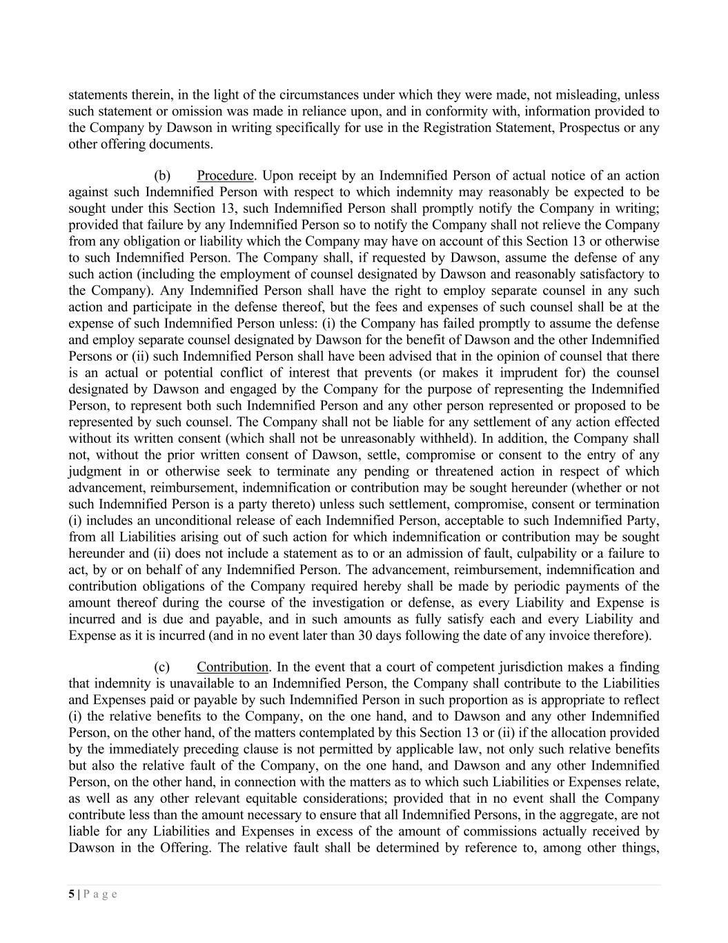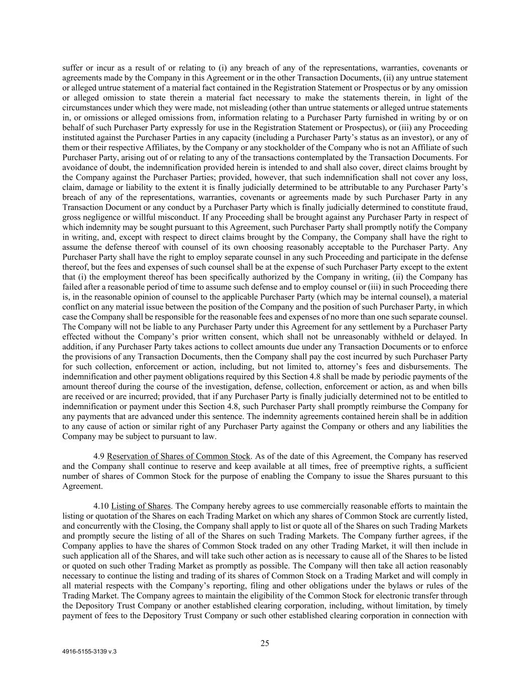 25 4916-5155-3139 v.3 suffer or incur as a result of or relating to (i) any breach of any of the representations, warranties, covenants or agreements made by the Company in this Agreement or in the other Transaction Documents, (ii) any untrue statement or alleged untrue statement of a material fact contained in the Registration Statement or Prospectus or by any omission or alleged omission to state therein a material fact necessary to make the statements therein, in light of the circumstances under which they were made, not misleading (other than untrue statements or alleged untrue statements in, or omissions or alleged omissions from, information relating to a Purchaser Party furnished in writing by or on behalf of such Purchaser Party expressly for use in the Registration Statement or Prospectus), or (iii) any Proceeding instituted against the Purchaser Parties in any capacity (including a Purchaser Party’s status as an investor), or any of them or their respective Affiliates, by the Company or any stockholder of the Company who is not an Affiliate of such Purchaser Party, arising out of or relating to any of the transactions contemplated by the Transaction Documents. For avoidance of doubt, the indemnification provided herein is intended to and shall also cover, direct claims brought by the Company against the Purchaser Parties; provided, however, that such indemnification shall not cover any loss, claim, damage or liability to the extent it is finally judicially determined to be attributable to any Purchaser Party’s breach of any of the representations, warranties, covenants or agreements made by such Purchaser Party in any Transaction Document or any conduct by a Purchaser Party which is finally judicially determined to constitute fraud, gross negligence or willful misconduct. If any Proceeding shall be brought against any Purchaser Party in respect of which indemnity may be sought pursuant to this Agreement, such Purchaser Party shall promptly notify the Company in writing, and, except with respect to direct claims brought by the Company, the Company shall have the right to assume the defense thereof with counsel of its own choosing reasonably acceptable to the Purchaser Party. Any Purchaser Party shall have the right to employ separate counsel in any such Proceeding and participate in the defense thereof, but the fees and expenses of such counsel shall be at the expense of such Purchaser Party except to the extent that (i) the employment thereof has been specifically authorized by the Company in writing, (ii) the Company has failed after a reasonable period of time to assume such defense and to employ counsel or (iii) in such Proceeding there is, in the reasonable opinion of counsel to the applicable Purchaser Party (which may be internal counsel), a material conflict on any material issue between the position of the Company and the position of such Purchaser Party, in which case the Company shall be responsible for the reasonable fees and expenses of no more than one such separate counsel. The Company will not be liable to any Purchaser Party under this Agreement for any settlement by a Purchaser Party effected without the Company’s prior written consent, which shall not be unreasonably withheld or delayed. In addition, if any Purchaser Party takes actions to collect amounts due under any Transaction Documents or to enforce the provisions of any Transaction Documents, then the Company shall pay the cost incurred by such Purchaser Party for such collection, enforcement or action, including, but not limited to, attorney’s fees and disbursements. The indemnification and other payment obligations required by this Section 4.8 shall be made by periodic payments of the amount thereof during the course of the investigation, defense, collection, enforcement or action, as and when bills are received or are incurred; provided, that if any Purchaser Party is finally judicially determined not to be entitled to indemnification or payment under this Section 4.8, such Purchaser Party shall promptly reimburse the Company for any payments that are advanced under this sentence. The indemnity agreements contained herein shall be in addition to any cause of action or similar right of any Purchaser Party against the Company or others and any liabilities the Company may be subject to pursuant to law. 4.9 Reservation of Shares of Common Stock. As of the date of this Agreement, the Company has reserved and the Company shall continue to reserve and keep available at all times, free of preemptive rights, a sufficient number of shares of Common Stock for the purpose of enabling the Company to issue the Shares pursuant to this Agreement. 4.10 Listing of Shares. The Company hereby agrees to use commercially reasonable efforts to maintain the listing or quotation of the Shares on each Trading Market on which any shares of Common Stock are currently listed, and concurrently with the Closing, the Company shall apply to list or quote all of the Shares on such Trading Markets and promptly secure the listing of all of the Shares on such Trading Markets. The Company further agrees, if the Company applies to have the shares of Common Stock traded on any other Trading Market, it will then include in such application all of the Shares, and will take such other action as is necessary to cause all of the Shares to be listed or quoted on such other Trading Market as promptly as possible. The Company will then take all action reasonably necessary to continue the listing and trading of its shares of Common Stock on a Trading Market and will comply in all material respects with the Company’s reporting, filing and other obligations under the bylaws or rules of the Trading Market. The Company agrees to maintain the eligibility of the Common Stock for electronic transfer through the Depository Trust Company or another established clearing corporation, including, without limitation, by timely payment of fees to the Dep