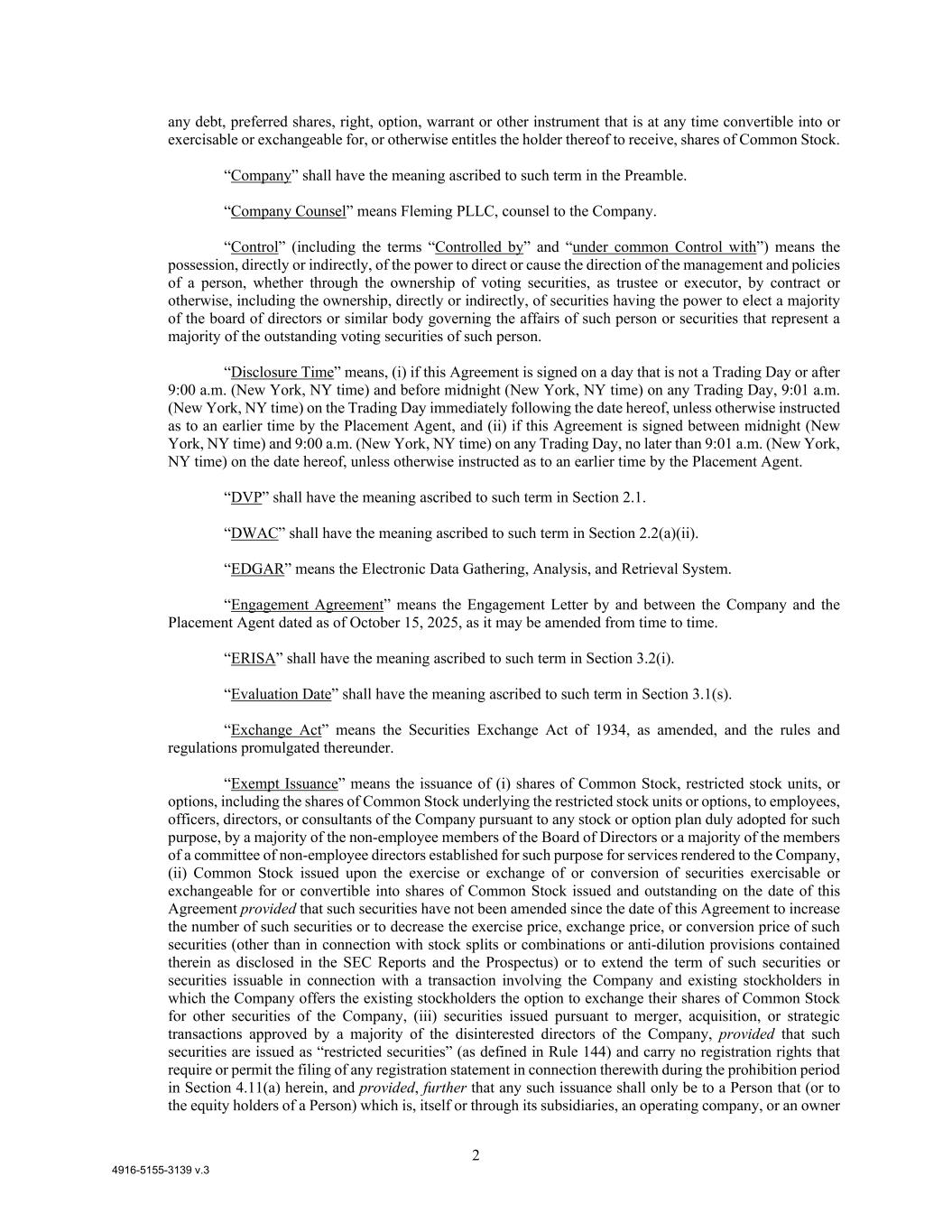 2 4916-5155-3139 v.3 any debt, preferred shares, right, option, warrant or other instrument that is at any time convertible into or exercisable or exchangeable for, or otherwise entitles the holder thereof to receive, shares of Common Stock. “Company” shall have the meaning ascribed to such term in the Preamble. “Company Counsel” means Fleming PLLC, counsel to the Company. “Control” (including the terms “Controlled by” and “under common Control with”) means the possession, directly or indirectly, of the power to direct or cause the direction of the management and policies of a person, whether through the ownership of voting securities, as trustee or executor, by contract or otherwise, including the ownership, directly or indirectly, of securities having the power to elect a majority of the board of directors or similar body governing the affairs of such person or securities that represent a majority of the outstanding voting securities of such person. “Disclosure Time” means, (i) if this Agreement is signed on a day that is not a Trading Day or after 9:00 a.m. (New York, NY time) and before midnight (New York, NY time) on any Trading Day, 9:01 a.m. (New York, NY time) on the Trading Day immediately following the date hereof, unless otherwise instructed as to an earlier time by the Placement Agent, and (ii) if this Agreement is signed between midnight (New York, NY time) and 9:00 a.m. (New York, NY time) on any Trading Day, no later than 9:01 a.m. (New York, NY time) on the date hereof, unless otherwise instructed as to an earlier time by the Placement Agent. “DVP” shall have the meaning ascribed to such term in Section 2.1. “DWAC” shall have the meaning ascribed to such term in Section 2.2(a)(ii). “EDGAR” means the Electronic Data Gathering, Analysis, and Retrieval System. “Engagement Agreement” means the Engagement Letter by and between the Company and the Placement Agent dated as of October 15, 2025, as it may be amended from time to time. “ERISA” shall have the meaning ascribed to such term in Section 3.2(i). “Evaluation Date” shall have the meaning ascribed to such term in Section 3.1(s). “Exchange Act” means the Securities Exchange Act of 1934, as amended, and the rules and regulations promulgated thereunder. “Exempt Issuance” means the issuance of (i) shares of Common Stock, restricted stock units, or options, including the shares of Common Stock underlying the restricted stock units or options, to employees, officers, directors, or consultants of the Company pursuant to any stock or option plan duly adopted for such purpose, by a majority of the non-employee members of the Board of Directors or a majority of the members of a committee of non-employee directors established for such purpose for services rendered to the Company, (ii) Common Stock issued upon the exercise or exchange of or conversion of securities exercisable or exchangeable for or convertible into shares of Common Stock issued and outstanding on the date of this Agreement provided that such securities have not been amended since the date of this Agreement to increase the number of such securities or to decrease the exercise price, exchange price, or conversion price of such securities (other than in connection with stock splits or combinations or anti-dilution provisions contained therein as disclosed in the SEC Reports and the Prospectus) or to extend the term of such securities or securities issuable in connection with a transaction involving the Company and existing stockholders in which the Company offers the existing stockholders the option to exchange their shares of Common Stock for other securities of the Company, (iii) securities issued pursuant to merger, acquisition, or strategic transactions approved by a majority of the disinterested directors of the Company, provided that such securities are issued as “restricted securities” (as defined in Rule 144) and carry no registration rights that require or permit the filing of any registration statement in connection therewith during the prohibition period in Section 4.11(a) herein, and provided, further that any such issuance shall only be to a Person that (or to the equity holders of a Person) which is, itself or through its subsidiaries, an operating company, or an owner