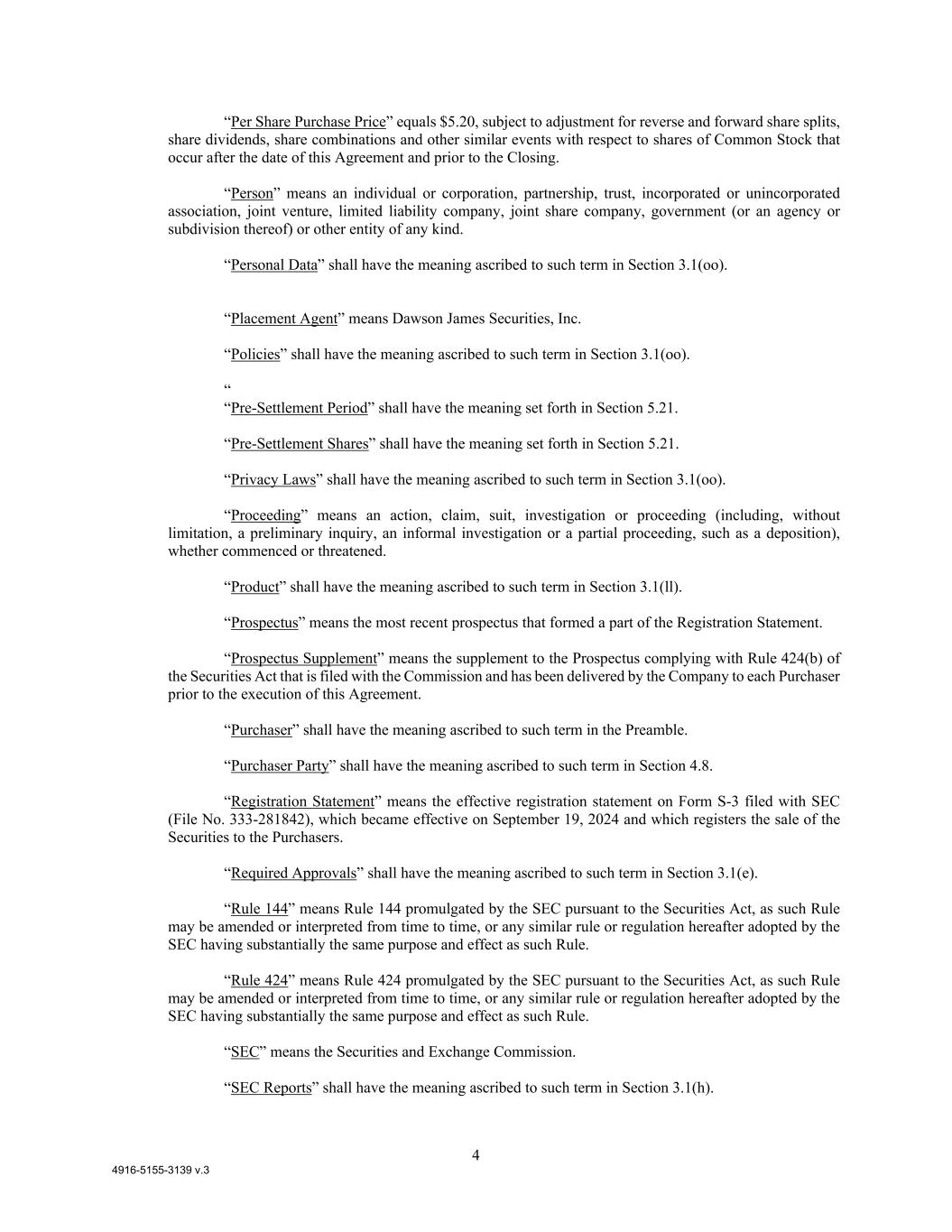 4 4916-5155-3139 v.3 “Per Share Purchase Price” equals $5.20, subject to adjustment for reverse and forward share splits, share dividends, share combinations and other similar events with respect to shares of Common Stock that occur after the date of this Agreement and prior to the Closing. “Person” means an individual or corporation, partnership, trust, incorporated or unincorporated association, joint venture, limited liability company, joint share company, government (or an agency or subdivision thereof) or other entity of any kind. “Personal Data” shall have the meaning ascribed to such term in Section 3.1(oo). “Placement Agent” means Dawson James Securities, Inc. “Policies” shall have the meaning ascribed to such term in Section 3.1(oo). “ “Pre-Settlement Period” shall have the meaning set forth in Section 5.21. “Pre-Settlement Shares” shall have the meaning set forth in Section 5.21. “Privacy Laws” shall have the meaning ascribed to such term in Section 3.1(oo). “Proceeding” means an action, claim, suit, investigation or proceeding (including, without limitation, a preliminary inquiry, an informal investigation or a partial proceeding, such as a deposition), whether commenced or threatened. “Product” shall have the meaning ascribed to such term in Section 3.1(ll). “Prospectus” means the most recent prospectus that formed a part of the Registration Statement. “Prospectus Supplement” means the supplement to the Prospectus complying with Rule 424(b) of the Securities Act that is filed with the Commission and has been delivered by the Company to each Purchaser prior to the execution of this Agreement. “Purchaser” shall have the meaning ascribed to such term in the Preamble. “Purchaser Party” shall have the meaning ascribed to such term in Section 4.8. “Registration Statement” means the effective registration statement on Form S-3 filed with SEC (File No. 333-281842), which became effective on September 19, 2024 and which registers the sale of the Securities to the Purchasers. “Required Approvals” shall have the meaning ascribed to such term in Section 3.1(e). “Rule 144” means Rule 144 promulgated by the SEC pursuant to the Securities Act, as such Rule may be amended or interpreted from time to time, or any similar rule or regulation hereafter adopted by the SEC having substantially the same purpose and effect as such Rule. “Rule 424” means Rule 424 promulgated by the SEC pursuant to the Securities Act, as such Rule may be amended or interpreted from time to time, or any similar rule or regulation hereafter adopted by the SEC having substantially the same purpose and effect as such Rule. “SEC” means the Securities and Exchange Commission. “SEC Reports” shall have the meaning ascribed to such term in Section 3.1(h).