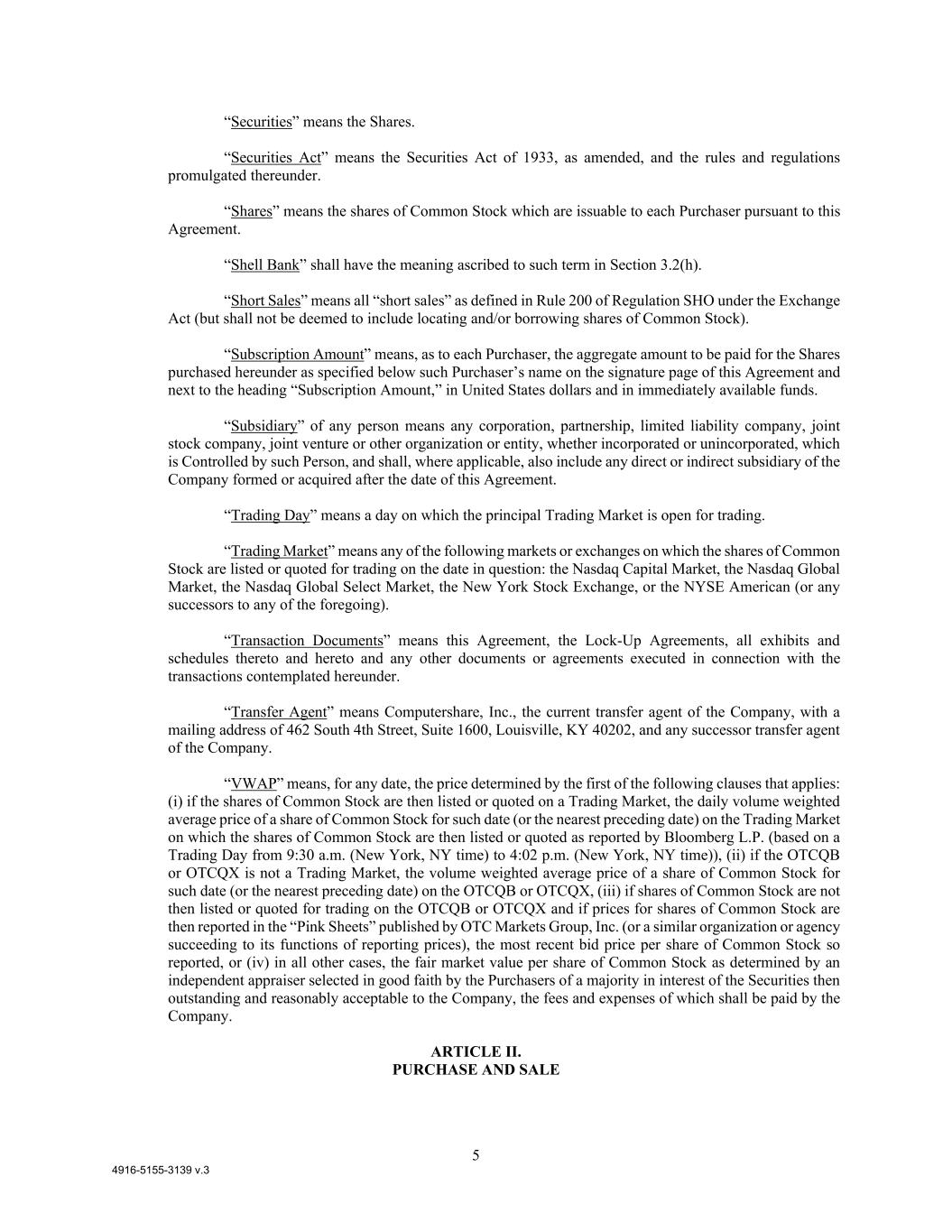 5 4916-5155-3139 v.3 “Securities” means the Shares. “Securities Act” means the Securities Act of 1933, as amended, and the rules and regulations promulgated thereunder. “Shares” means the shares of Common Stock which are issuable to each Purchaser pursuant to this Agreement. “Shell Bank” shall have the meaning ascribed to such term in Section 3.2(h). “Short Sales” means all “short sales” as defined in Rule 200 of Regulation SHO under the Exchange Act (but shall not be deemed to include locating and/or borrowing shares of Common Stock). “Subscription Amount” means, as to each Purchaser, the aggregate amount to be paid for the Shares purchased hereunder as specified below such Purchaser’s name on the signature page of this Agreement and next to the heading “Subscription Amount,” in United States dollars and in immediately available funds. “Subsidiary” of any person means any corporation, partnership, limited liability company, joint stock company, joint venture or other organization or entity, whether incorporated or unincorporated, which is Controlled by such Person, and shall, where applicable, also include any direct or indirect subsidiary of the Company formed or acquired after the date of this Agreement. “Trading Day” means a day on which the principal Trading Market is open for trading. “Trading Market” means any of the following markets or exchanges on which the shares of Common Stock are listed or quoted for trading on the date in question: the Nasdaq Capital Market, the Nasdaq Global Market, the Nasdaq Global Select Market, the New York Stock Exchange, or the NYSE American (or any successors to any of the foregoing). “Transaction Documents” means this Agreement, the Lock-Up Agreements, all exhibits and schedules thereto and hereto and any other documents or agreements executed in connection with the transactions contemplated hereunder. “Transfer Agent” means Computershare, Inc., the current transfer agent of the Company, with a mailing address of 462 South 4th Street, Suite 1600, Louisville, KY 40202, and any successor transfer agent of the Company. “VWAP” means, for any date, the price determined by the first of the following clauses that applies: (i) if the shares of Common Stock are then listed or quoted on a Trading Market, the daily volume weighted average price of a share of Common Stock for such date (or the nearest preceding date) on the Trading Market on which the shares of Common Stock are then listed or quoted as reported by Bloomberg L.P. (based on a Trading Day from 9:30 a.m. (New York, NY time) to 4:02 p.m. (New York, NY time)), (ii) if the OTCQB or OTCQX is not a Trading Market, the volume weighted average price of a share of Common Stock for such date (or the nearest preceding date) on the OTCQB or OTCQX, (iii) if shares of Common Stock are not then listed or quoted for trading on the OTCQB or OTCQX and if prices for shares of Common Stock are then reported in the “Pink Sheets” published by OTC Markets Group, Inc. (or a similar organization or agency succeeding to its functions of reporting prices), the most recent bid price per share of Common Stock so reported, or (iv) in all other cases, the fair market value per share of Common Stock as determined by an independent appraiser selected in good faith by the Purchasers of a majority in interest of the Securities then outstanding and reasonably acceptable to the Company, the fees and expenses of which shall be paid by the Company. ARTICLE II. PURCHASE AND SALE