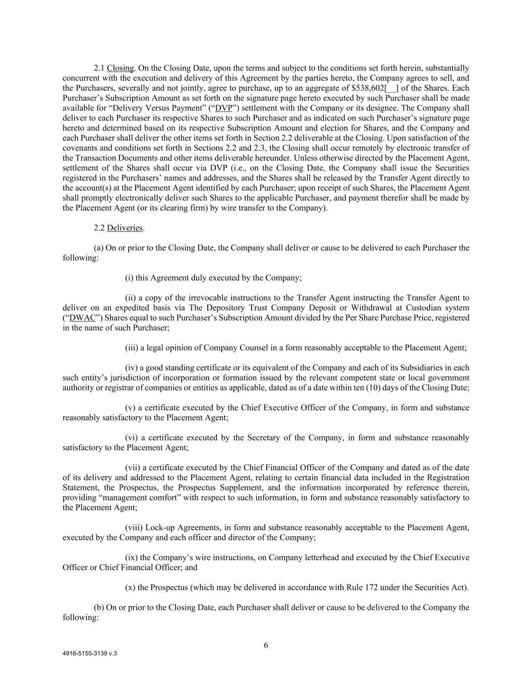 6 4916-5155-3139 v.3 2.1 Closing. On the Closing Date, upon the terms and subject to the conditions set forth herein, substantially concurrent with the execution and delivery of this Agreement by the parties hereto, the Company agrees to sell, and the Purchasers, severally and not jointly, agree to purchase, up to an aggregate of $538,602[__] of the Shares. Each Purchaser’s Subscription Amount as set forth on the signature page hereto executed by such Purchaser shall be made available for “Delivery Versus Payment” (“DVP”) settlement with the Company or its designee. The Company shall deliver to each Purchaser its respective Shares to such Purchaser and as indicated on such Purchaser’s signature page hereto and determined based on its respective Subscription Amount and election for Shares, and the Company and each Purchaser shall deliver the other items set forth in Section 2.2 deliverable at the Closing. Upon satisfaction of the covenants and conditions set forth in Sections 2.2 and 2.3, the Closing shall occur remotely by electronic transfer of the Transaction Documents and other items deliverable hereunder. Unless otherwise directed by the Placement Agent, settlement of the Shares shall occur via DVP (i.e., on the Closing Date, the Company shall issue the Securities registered in the Purchasers’ names and addresses, and the Shares shall be released by the Transfer Agent directly to the account(s) at the Placement Agent identified by each Purchaser; upon receipt of such Shares, the Placement Agent shall promptly electronically deliver such Shares to the applicable Purchaser, and payment therefor shall be made by the Placement Agent (or its clearing firm) by wire transfer to the Company). 2.2 Deliveries. (a) On or prior to the Closing Date, the Company shall deliver or cause to be delivered to each Purchaser the following: (i) this Agreement duly executed by the Company; (ii) a copy of the irrevocable instructions to the Transfer Agent instructing the Transfer Agent to deliver on an expedited basis via The Depository Trust Company Deposit or Withdrawal at Custodian system (“DWAC”) Shares equal to such Purchaser’s Subscription Amount divided by the Per Share Purchase Price, registered in the name of such Purchaser; (iii) a legal opinion of Company Counsel in a form reasonably acceptable to the Placement Agent; (iv) a good standing certificate or its equivalent of the Company and each of its Subsidiaries in each such entity’s jurisdiction of incorporation or formation issued by the relevant competent state or local government authority or registrar of companies or entities as applicable, dated as of a date within ten (10) days of the Closing Date; (v) a certificate executed by the Chief Executive Officer of the Company, in form and substance reasonably satisfactory to the Placement Agent; (vi) a certificate executed by the Secretary of the Company, in form and substance reasonably satisfactory to the Placement Agent; (vii) a certificate executed by the Chief Financial Officer of the Company and dated as of the date of its delivery and addressed to the Placement Agent, relating to certain financial data included in the Registration Statement, the Prospectus, the Prospectus Supplement, and the information incorporated by reference therein, providing “management comfort” with respect to such information, in form and substance reasonably satisfactory to the Placement Agent; (viii) Lock-up Agreements, in form and substance reasonably acceptable to the Placement Agent, executed by the Company and each officer and director of the Company; (ix) the Company’s wire instructions, on Company letterhead and executed by the Chief Executive Officer or Chief Financial Officer; and (x) the Prospectus (which may be delivered in accordance with Rule 172 under the Securities Act). (b) On or prior to the Closing Date, each Purchaser shall deliver or cause to be delivered to the Company the following: