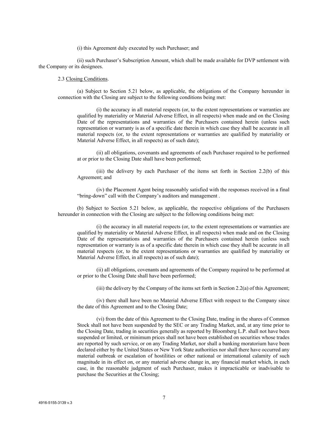 7 4916-5155-3139 v.3 (i) this Agreement duly executed by such Purchaser; and (ii) such Purchaser’s Subscription Amount, which shall be made available for DVP settlement with the Company or its designees. 2.3 Closing Conditions. (a) Subject to Section 5.21 below, as applicable, the obligations of the Company hereunder in connection with the Closing are subject to the following conditions being met: (i) the accuracy in all material respects (or, to the extent representations or warranties are qualified by materiality or Material Adverse Effect, in all respects) when made and on the Closing Date of the representations and warranties of the Purchasers contained herein (unless such representation or warranty is as of a specific date therein in which case they shall be accurate in all material respects (or, to the extent representations or warranties are qualified by materiality or Material Adverse Effect, in all respects) as of such date); (ii) all obligations, covenants and agreements of each Purchaser required to be performed at or prior to the Closing Date shall have been performed; (iii) the delivery by each Purchaser of the items set forth in Section 2.2(b) of this Agreement; and (iv) the Placement Agent being reasonably satisfied with the responses received in a final “bring-down” call with the Company’s auditors and management . (b) Subject to Section 5.21 below, as applicable, the respective obligations of the Purchasers hereunder in connection with the Closing are subject to the following conditions being met: (i) the accuracy in all material respects (or, to the extent representations or warranties are qualified by materiality or Material Adverse Effect, in all respects) when made and on the Closing Date of the representations and warranties of the Purchasers contained herein (unless such representation or warranty is as of a specific date therein in which case they shall be accurate in all material respects (or, to the extent representations or warranties are qualified by materiality or Material Adverse Effect, in all respects) as of such date); (ii) all obligations, covenants and agreements of the Company required to be performed at or prior to the Closing Date shall have been performed; (iii) the delivery by the Company of the items set forth in Section 2.2(a) of this Agreement; (iv) there shall have been no Material Adverse Effect with respect to the Company since the date of this Agreement and to the Closing Date; (vi) from the date of this Agreement to the Closing Date, trading in the shares of Common Stock shall not have been suspended by the SEC or any Trading Market, and, at any time prior to the Closing Date, trading in securities generally as reported by Bloomberg L.P. shall not have been suspended or limited, or minimum prices shall not have been established on securities whose trades are reported by such service, or on any Trading Market, nor shall a banking moratorium have been declared either by the United States or New York State authorities nor shall there have occurred any material outbreak or escalation of hostilities or other national or international calamity of such magnitude in its effect on, or any material adverse change in, any financial market which, in each case, in the reasonable judgment of such Purchaser, makes it impracticable or inadvisable to purchase the Securities at the Closing;