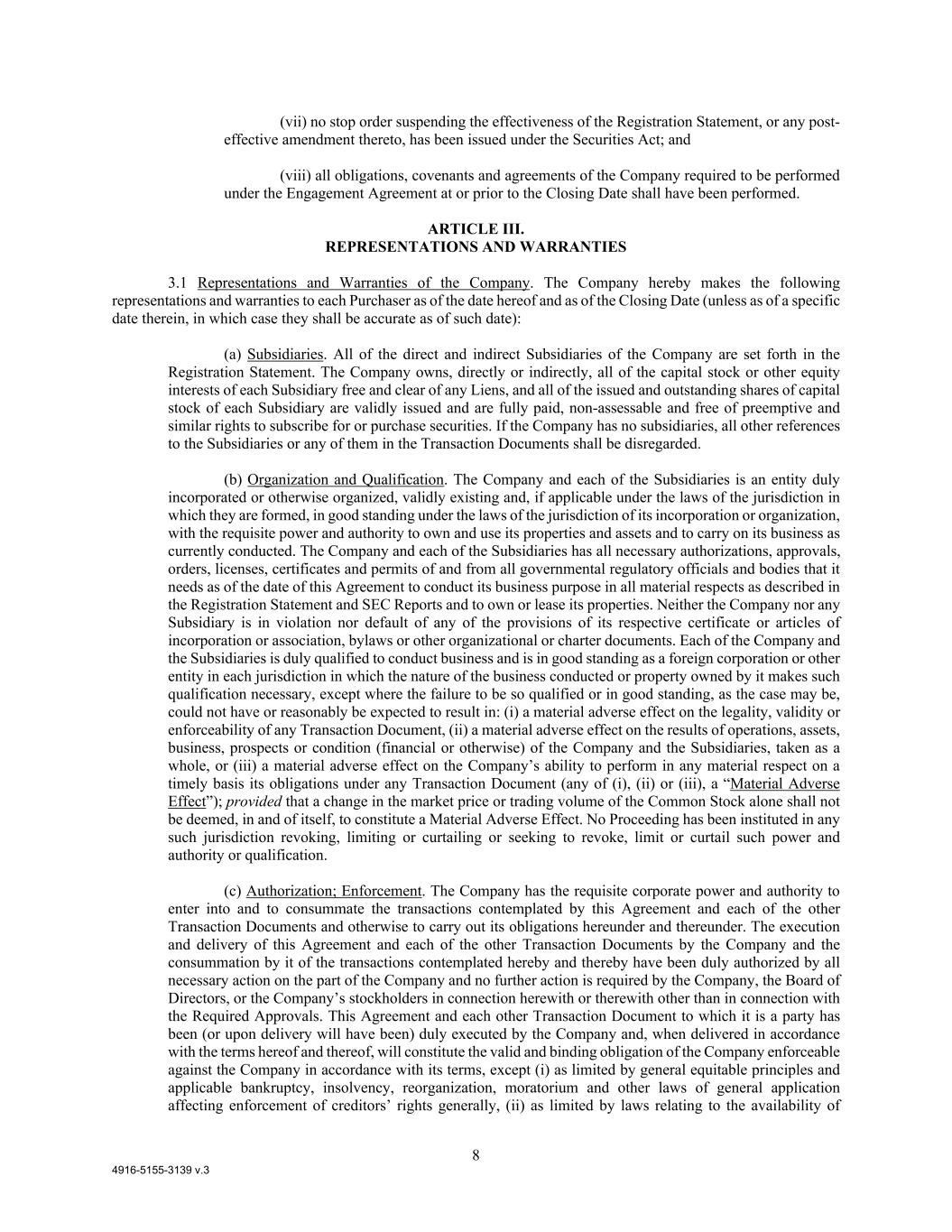 8 4916-5155-3139 v.3 (vii) no stop order suspending the effectiveness of the Registration Statement, or any post- effective amendment thereto, has been issued under the Securities Act; and (viii) all obligations, covenants and agreements of the Company required to be performed under the Engagement Agreement at or prior to the Closing Date shall have been performed. ARTICLE III. REPRESENTATIONS AND WARRANTIES 3.1 Representations and Warranties of the Company. The Company hereby makes the following representations and warranties to each Purchaser as of the date hereof and as of the Closing Date (unless as of a specific date therein, in which case they shall be accurate as of such date): (a) Subsidiaries. All of the direct and indirect Subsidiaries of the Company are set forth in the Registration Statement. The Company owns, directly or indirectly, all of the capital stock or other equity interests of each Subsidiary free and clear of any Liens, and all of the issued and outstanding shares of capital stock of each Subsidiary are validly issued and are fully paid, non-assessable and free of preemptive and similar rights to subscribe for or purchase securities. If the Company has no subsidiaries, all other references to the Subsidiaries or any of them in the Transaction Documents shall be disregarded. (b) Organization and Qualification. The Company and each of the Subsidiaries is an entity duly incorporated or otherwise organized, validly existing and, if applicable under the laws of the jurisdiction in which they are formed, in good standing under the laws of the jurisdiction of its incorporation or organization, with the requisite power and authority to own and use its properties and assets and to carry on its business as currently conducted. The Company and each of the Subsidiaries has all necessary authorizations, approvals, orders, licenses, certificates and permits of and from all governmental regulatory officials and bodies that it needs as of the date of this Agreement to conduct its business purpose in all material respects as described in the Registration Statement and SEC Reports and to own or lease its properties. Neither the Company nor any Subsidiary is in violation nor default of any of the provisions of its respective certificate or articles of incorporation or association, bylaws or other organizational or charter documents. Each of the Company and the Subsidiaries is duly qualified to conduct business and is in good standing as a foreign corporation or other entity in each jurisdiction in which the nature of the business conducted or property owned by it makes such qualification necessary, except where the failure to be so qualified or in good standing, as the case may be, could not have or reasonably be expected to result in: (i) a material adverse effect on the legality, validity or enforceability of any Transaction Document, (ii) a material adverse effect on the results of operations, assets, business, prospects or condition (financial or otherwise) of the Company and the Subsidiaries, taken as a whole, or (iii) a material adverse effect on the Company’s ability to perform in any material respect on a timely basis its obligations under any Transaction Document (any of (i), (ii) or (iii), a “Material Adverse Effect”); provided that a change in the market price or trading volume of the Common Stock alone shall not be deemed, in and of itself, to constitute a Material Adverse Effect. No Proceeding has been instituted in any such jurisdiction revoking, limiting or curtailing or seeking to revoke, limit or curtail such power and authority or qualification. (c) Authorization; Enforcement. The Company has the requisite corporate power and authority to enter into and to consummate the transactions contemplated by this Agreement and each of the other Transaction Documents and otherwise to carry out its obligations hereunder and thereunder. The execution and delivery of this Agreement and each of the other Transaction Documents by the Company and the consummation by it of the transactions contemplated hereby and thereby have been duly authorized by all necessary action on the part of the Company and no further action is required by the Company, the Board of Directors, or the Company’s stockholders in connection herewith or therewith other than in connection with the Required Approvals. This Agreement and each other Transaction Document to which it is a party has been (or upon delivery will have been) duly executed by the Company and, when delivered in accordance with the terms hereof and thereof, will constitute the valid and binding obligation of the Company enforceable against the Company in accordance with its terms, except (i) as limited by general equitable principles and applicable bankruptcy, insolvency, reorganization, moratorium and other laws of general application affecting enforcement of creditors’ rights generally, (ii) as limited by laws relating to the availability of