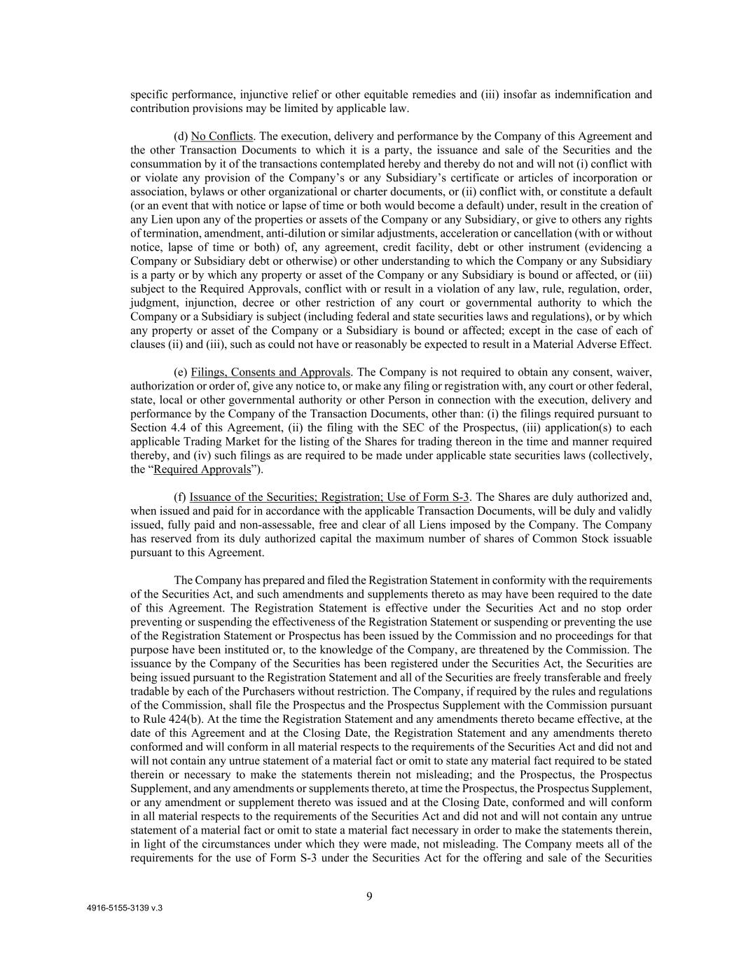 9 4916-5155-3139 v.3 specific performance, injunctive relief or other equitable remedies and (iii) insofar as indemnification and contribution provisions may be limited by applicable law. (d) No Conflicts. The execution, delivery and performance by the Company of this Agreement and the other Transaction Documents to which it is a party, the issuance and sale of the Securities and the consummation by it of the transactions contemplated hereby and thereby do not and will not (i) conflict with or violate any provision of the Company’s or any Subsidiary’s certificate or articles of incorporation or association, bylaws or other organizational or charter documents, or (ii) conflict with, or constitute a default (or an event that with notice or lapse of time or both would become a default) under, result in the creation of any Lien upon any of the properties or assets of the Company or any Subsidiary, or give to others any rights of termination, amendment, anti-dilution or similar adjustments, acceleration or cancellation (with or without notice, lapse of time or both) of, any agreement, credit facility, debt or other instrument (evidencing a Company or Subsidiary debt or otherwise) or other understanding to which the Company or any Subsidiary is a party or by which any property or asset of the Company or any Subsidiary is bound or affected, or (iii) subject to the Required Approvals, conflict with or result in a violation of any law, rule, regulation, order, judgment, injunction, decree or other restriction of any court or governmental authority to which the Company or a Subsidiary is subject (including federal and state securities laws and regulations), or by which any property or asset of the Company or a Subsidiary is bound or affected; except in the case of each of clauses (ii) and (iii), such as could not have or reasonably be expected to result in a Material Adverse Effect. (e) Filings, Consents and Approvals. The Company is not required to obtain any consent, waiver, authorization or order of, give any notice to, or make any filing or registration with, any court or other federal, state, local or other governmental authority or other Person in connection with the execution, delivery and performance by the Company of the Transaction Documents, other than: (i) the filings required pursuant to Section 4.4 of this Agreement, (ii) the filing with the SEC of the Prospectus, (iii) application(s) to each applicable Trading Market for the listing of the Shares for trading thereon in the time and manner required thereby, and (iv) such filings as are required to be made under applicable state securities laws (collectively, the “Required Approvals”). (f) Issuance of the Securities; Registration; Use of Form S-3. The Shares are duly authorized and, when issued and paid for in accordance with the applicable Transaction Documents, will be duly and validly issued, fully paid and non-assessable, free and clear of all Liens imposed by the Company. The Company has reserved from its duly authorized capital the maximum number of shares of Common Stock issuable pursuant to this Agreement. The Company has prepared and filed the Registration Statement in conformity with the requirements of the Securities Act, and such amendments and supplements thereto as may have been required to the date of this Agreement. The Registration Statement is effective under the Securities Act and no stop order preventing or suspending the effectiveness of the Registration Statement or suspending or preventing the use of the Registration Statement or Prospectus has been issued by the Commission and no proceedings for that purpose have been instituted or, to the knowledge of the Company, are threatened by the Commission. The issuance by the Company of the Securities has been registered under the Securities Act, the Securities are being issued pursuant to the Registration Statement and all of the Securities are freely transferable and freely tradable by each of the Purchasers without restriction. The Company, if required by the rules and regulations of the Commission, shall file the Prospectus and the Prospectus Supplement with the Commission pursuant to Rule 424(b). At the time the Registration Statement and any amendments thereto became effective, at the date of this Agreement and at the Closing Date, the Registration Statement and any amendments thereto conformed and will conform in all material respects to the requirements of the Securities Act and did not and will not contain any untrue statement of a material fact or omit to state any material fact required to be stated therein or necessary to make the statements therein not misleading; and the Prospectus, the Prospectus Supplement, and any amendments or supplements thereto, at time the Prospectus, the Prospectus Supplement, or any amendment or supplement thereto was issued and at the Closing Date, conformed and will conform in all material respects to the requirements of the Securities Act and did not and will not contain any untrue statement of a material fact or omit to state a material fact necessary in order to make the statements therein, in light of the circumstances under which they were made, not misleading. The Company meets all of the requirements for the use of Form S-3 under the Securities Act for the offering and sale of the Securities