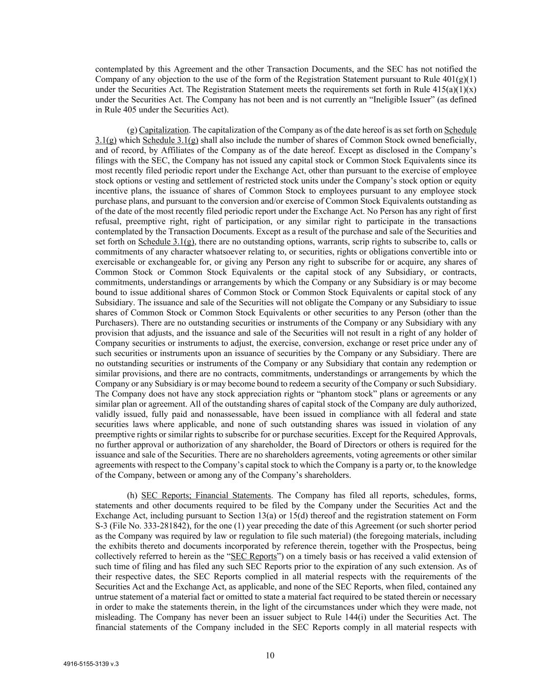 10 4916-5155-3139 v.3 contemplated by this Agreement and the other Transaction Documents, and the SEC has not notified the Company of any objection to the use of the form of the Registration Statement pursuant to Rule 401(g)(1) under the Securities Act. The Registration Statement meets the requirements set forth in Rule 415(a)(1)(x) under the Securities Act. The Company has not been and is not currently an “Ineligible Issuer” (as defined in Rule 405 under the Securities Act). (g) Capitalization. The capitalization of the Company as of the date hereof is as set forth on Schedule 3.1(g) which Schedule 3.1(g) shall also include the number of shares of Common Stock owned beneficially, and of record, by Affiliates of the Company as of the date hereof. Except as disclosed in the Company’s filings with the SEC, the Company has not issued any capital stock or Common Stock Equivalents since its most recently filed periodic report under the Exchange Act, other than pursuant to the exercise of employee stock options or vesting and settlement of restricted stock units under the Company’s stock option or equity incentive plans, the issuance of shares of Common Stock to employees pursuant to any employee stock purchase plans, and pursuant to the conversion and/or exercise of Common Stock Equivalents outstanding as of the date of the most recently filed periodic report under the Exchange Act. No Person has any right of first refusal, preemptive right, right of participation, or any similar right to participate in the transactions contemplated by the Transaction Documents. Except as a result of the purchase and sale of the Securities and set forth on Schedule 3.1(g), there are no outstanding options, warrants, scrip rights to subscribe to, calls or commitments of any character whatsoever relating to, or securities, rights or obligations convertible into or exercisable or exchangeable for, or giving any Person any right to subscribe for or acquire, any shares of Common Stock or Common Stock Equivalents or the capital stock of any Subsidiary, or contracts, commitments, understandings or arrangements by which the Company or any Subsidiary is or may become bound to issue additional shares of Common Stock or Common Stock Equivalents or capital stock of any Subsidiary. The issuance and sale of the Securities will not obligate the Company or any Subsidiary to issue shares of Common Stock or Common Stock Equivalents or other securities to any Person (other than the Purchasers). There are no outstanding securities or instruments of the Company or any Subsidiary with any provision that adjusts, and the issuance and sale of the Securities will not result in a right of any holder of Company securities or instruments to adjust, the exercise, conversion, exchange or reset price under any of such securities or instruments upon an issuance of securities by the Company or any Subsidiary. There are no outstanding securities or instruments of the Company or any Subsidiary that contain any redemption or similar provisions, and there are no contracts, commitments, understandings or arrangements by which the Company or any Subsidiary is or may become bound to redeem a security of the Company or such Subsidiary. The Company does not have any stock appreciation rights or “phantom stock” plans or agreements or any similar plan or agreement. All of the outstanding shares of capital stock of the Company are duly authorized, validly issued, fully paid and nonassessable, have been issued in compliance with all federal and state securities laws where applicable, and none of such outstanding shares was issued in violation of any preemptive rights or similar rights to subscribe for or purchase securities. Except for the Required Approvals, no further approval or authorization of any shareholder, the Board of Directors or others is required for the issuance and sale of the Securities. There are no shareholders agreements, voting agreements or other similar agreements with respect to the Company’s capital stock to which the Company is a party or, to the knowledge of the Company, between or among any of the Company’s shareholders. (h) SEC Reports; Financial Statements. The Company has filed all reports, schedules, forms, statements and other documents required to be filed by the Company under the Securities Act and the Exchange Act, including pursuant to Section 13(a) or 15(d) thereof and the registration statement on Form S-3 (File No. 333-281842), for the one (1) year preceding the date of this Agreement (or such shorter period as the Company was required by law or regulation to file such material) (the foregoing materials, including the exhibits thereto and documents incorporated by reference therein, together with the Prospectus, being collectively referred to herein as the “SEC Reports”) on a timely basis or has received a valid extension of such time of filing and has filed any such SEC Reports prior to the expiration of any such extension. As of their respective dates, the SEC Reports complied in all material respects with the requirements of the Securities Act and the Exchange Act, as applicable, and none of the SEC Reports, when filed, contained any untrue statement of a material fact or omitted to state a material fact required to be stated therein or necessary in order to make the statements therein, in the light of the circumstances under which they were made, not misleading. The Company has never been an issuer subject to Rule 144(i) under the Securities Act. The financial statements of the Company included in the SEC Reports comply in all material respects with