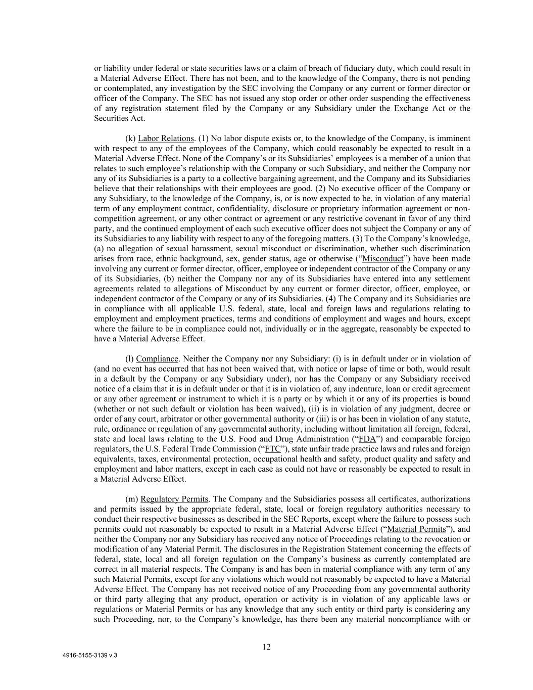 12 4916-5155-3139 v.3 or liability under federal or state securities laws or a claim of breach of fiduciary duty, which could result in a Material Adverse Effect. There has not been, and to the knowledge of the Company, there is not pending or contemplated, any investigation by the SEC involving the Company or any current or former director or officer of the Company. The SEC has not issued any stop order or other order suspending the effectiveness of any registration statement filed by the Company or any Subsidiary under the Exchange Act or the Securities Act. (k) Labor Relations. (1) No labor dispute exists or, to the knowledge of the Company, is imminent with respect to any of the employees of the Company, which could reasonably be expected to result in a Material Adverse Effect. None of the Company’s or its Subsidiaries’ employees is a member of a union that relates to such employee’s relationship with the Company or such Subsidiary, and neither the Company nor any of its Subsidiaries is a party to a collective bargaining agreement, and the Company and its Subsidiaries believe that their relationships with their employees are good. (2) No executive officer of the Company or any Subsidiary, to the knowledge of the Company, is, or is now expected to be, in violation of any material term of any employment contract, confidentiality, disclosure or proprietary information agreement or non- competition agreement, or any other contract or agreement or any restrictive covenant in favor of any third party, and the continued employment of each such executive officer does not subject the Company or any of its Subsidiaries to any liability with respect to any of the foregoing matters. (3) To the Company’s knowledge, (a) no allegation of sexual harassment, sexual misconduct or discrimination, whether such discrimination arises from race, ethnic background, sex, gender status, age or otherwise (“Misconduct”) have been made involving any current or former director, officer, employee or independent contractor of the Company or any of its Subsidiaries, (b) neither the Company nor any of its Subsidiaries have entered into any settlement agreements related to allegations of Misconduct by any current or former director, officer, employee, or independent contractor of the Company or any of its Subsidiaries. (4) The Company and its Subsidiaries are in compliance with all applicable U.S. federal, state, local and foreign laws and regulations relating to employment and employment practices, terms and conditions of employment and wages and hours, except where the failure to be in compliance could not, individually or in the aggregate, reasonably be expected to have a Material Adverse Effect. (l) Compliance. Neither the Company nor any Subsidiary: (i) is in default under or in violation of (and no event has occurred that has not been waived that, with notice or lapse of time or both, would result in a default by the Company or any Subsidiary under), nor has the Company or any Subsidiary received notice of a claim that it is in default under or that it is in violation of, any indenture, loan or credit agreement or any other agreement or instrument to which it is a party or by which it or any of its properties is bound (whether or not such default or violation has been waived), (ii) is in violation of any judgment, decree or order of any court, arbitrator or other governmental authority or (iii) is or has been in violation of any statute, rule, ordinance or regulation of any governmental authority, including without limitation all foreign, federal, state and local laws relating to the U.S. Food and Drug Administration (“FDA”) and comparable foreign regulators, the U.S. Federal Trade Commission (“FTC”), state unfair trade practice laws and rules and foreign equivalents, taxes, environmental protection, occupational health and safety, product quality and safety and employment and labor matters, except in each case as could not have or reasonably be expected to result in a Material Adverse Effect. (m) Regulatory Permits. The Company and the Subsidiaries possess all certificates, authorizations and permits issued by the appropriate federal, state, local or foreign regulatory authorities necessary to conduct their respective businesses as described in the SEC Reports, except where the failure to possess such permits could not reasonably be expected to result in a Material Adverse Effect (“Material Permits”), and neither the Company nor any Subsidiary has received any notice of Proceedings relating to the revocation or modification of any Material Permit. The disclosures in the Registration Statement concerning the effects of federal, state, local and all foreign regulation on the Company’s business as currently contemplated are correct in all material respects. The Company is and has been in material compliance with any term of any such Material Permits, except for any violations which would not reasonably be expected to have a Material Adverse Effect. The Company has not received notice of any Proceeding from any governmental authority or third party alleging that any product, operation or activity is in violation of any applicable laws or regulations or Material Permits or has any knowledge that any such entity or third party is considering any such Proceeding, nor, to the Company’s knowledge, has there been any material noncompliance with or