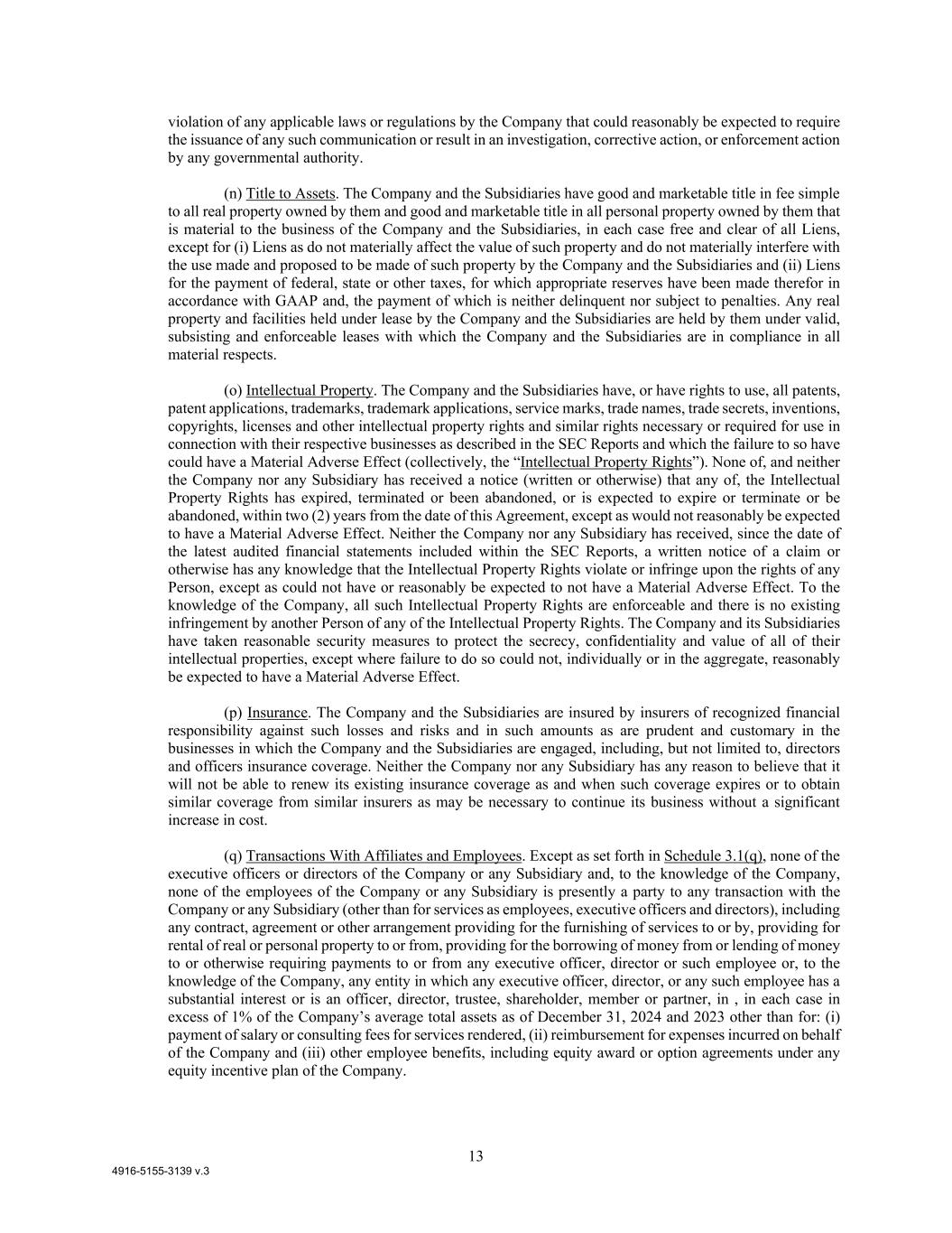 13 4916-5155-3139 v.3 violation of any applicable laws or regulations by the Company that could reasonably be expected to require the issuance of any such communication or result in an investigation, corrective action, or enforcement action by any governmental authority. (n) Title to Assets. The Company and the Subsidiaries have good and marketable title in fee simple to all real property owned by them and good and marketable title in all personal property owned by them that is material to the business of the Company and the Subsidiaries, in each case free and clear of all Liens, except for (i) Liens as do not materially affect the value of such property and do not materially interfere with the use made and proposed to be made of such property by the Company and the Subsidiaries and (ii) Liens for the payment of federal, state or other taxes, for which appropriate reserves have been made therefor in accordance with GAAP and, the payment of which is neither delinquent nor subject to penalties. Any real property and facilities held under lease by the Company and the Subsidiaries are held by them under valid, subsisting and enforceable leases with which the Company and the Subsidiaries are in compliance in all material respects. (o) Intellectual Property. The Company and the Subsidiaries have, or have rights to use, all patents, patent applications, trademarks, trademark applications, service marks, trade names, trade secrets, inventions, copyrights, licenses and other intellectual property rights and similar rights necessary or required for use in connection with their respective businesses as described in the SEC Reports and which the failure to so have could have a Material Adverse Effect (collectively, the “Intellectual Property Rights”). None of, and neither the Company nor any Subsidiary has received a notice (written or otherwise) that any of, the Intellectual Property Rights has expired, terminated or been abandoned, or is expected to expire or terminate or be abandoned, within two (2) years from the date of this Agreement, except as would not reasonably be expected to have a Material Adverse Effect. Neither the Company nor any Subsidiary has received, since the date of the latest audited financial statements included within the SEC Reports, a written notice of a claim or otherwise has any knowledge that the Intellectual Property Rights violate or infringe upon the rights of any Person, except as could not have or reasonably be expected to not have a Material Adverse Effect. To the knowledge of the Company, all such Intellectual Property Rights are enforceable and there is no existing infringement by another Person of any of the Intellectual Property Rights. The Company and its Subsidiaries have taken reasonable security measures to protect the secrecy, confidentiality and value of all of their intellectual properties, except where failure to do so could not, individually or in the aggregate, reasonably be expected to have a Material Adverse Effect. (p) Insurance. The Company and the Subsidiaries are insured by insurers of recognized financial responsibility against such losses and risks and in such amounts as are prudent and customary in the businesses in which the Company and the Subsidiaries are engaged, including, but not limited to, directors and officers insurance coverage. Neither the Company nor any Subsidiary has any reason to believe that it will not be able to renew its existing insurance coverage as and when such coverage expires or to obtain similar coverage from similar insurers as may be necessary to continue its business without a significant increase in cost. (q) Transactions With Affiliates and Employees. Except as set forth in Schedule 3.1(q), none of the executive officers or directors of the Company or any Subsidiary and, to the knowledge of the Company, none of the employees of the Company or any Subsidiary is presently a party to any transaction with the Company or any Subsidiary (other than for services as employees, executive officers and directors), including any contract, agreement or other arrangement providing for the furnishing of services to or by, providing for rental of real or personal property to or from, providing for the borrowing of money from or lending of money to or otherwise requiring payments to or from any executive officer, director or such employee or, to the knowledge of the Company, any entity in which any executive officer, director, or any such employee has a substantial interest or is an officer, director, trustee, shareholder, member or partner, in , in each case in excess of 1% of the Company’s average total assets as of December 31, 2024 and 2023 other than for: (i) payment of salary or consulting fees for services rendered, (ii) reimbursement for expenses incurred on behalf of the Company and (iii) other employee benefits, including equity award or option agreements under any equity incentive plan of the Company.