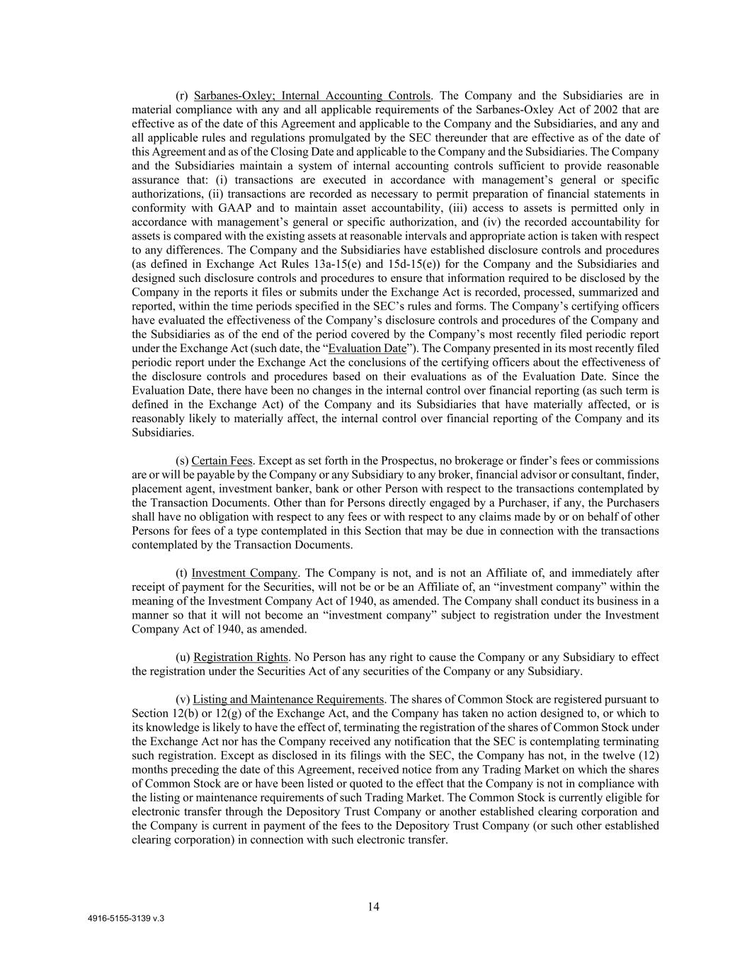 14 4916-5155-3139 v.3 (r) Sarbanes-Oxley; Internal Accounting Controls. The Company and the Subsidiaries are in material compliance with any and all applicable requirements of the Sarbanes-Oxley Act of 2002 that are effective as of the date of this Agreement and applicable to the Company and the Subsidiaries, and any and all applicable rules and regulations promulgated by the SEC thereunder that are effective as of the date of this Agreement and as of the Closing Date and applicable to the Company and the Subsidiaries. The Company and the Subsidiaries maintain a system of internal accounting controls sufficient to provide reasonable assurance that: (i) transactions are executed in accordance with management’s general or specific authorizations, (ii) transactions are recorded as necessary to permit preparation of financial statements in conformity with GAAP and to maintain asset accountability, (iii) access to assets is permitted only in accordance with management’s general or specific authorization, and (iv) the recorded accountability for assets is compared with the existing assets at reasonable intervals and appropriate action is taken with respect to any differences. The Company and the Subsidiaries have established disclosure controls and procedures (as defined in Exchange Act Rules 13a-15(e) and 15d-15(e)) for the Company and the Subsidiaries and designed such disclosure controls and procedures to ensure that information required to be disclosed by the Company in the reports it files or submits under the Exchange Act is recorded, processed, summarized and reported, within the time periods specified in the SEC’s rules and forms. The Company’s certifying officers have evaluated the effectiveness of the Company’s disclosure controls and procedures of the Company and the Subsidiaries as of the end of the period covered by the Company’s most recently filed periodic report under the Exchange Act (such date, the “Evaluation Date”). The Company presented in its most recently filed periodic report under the Exchange Act the conclusions of the certifying officers about the effectiveness of the disclosure controls and procedures based on their evaluations as of the Evaluation Date. Since the Evaluation Date, there have been no changes in the internal control over financial reporting (as such term is defined in the Exchange Act) of the Company and its Subsidiaries that have materially affected, or is reasonably likely to materially affect, the internal control over financial reporting of the Company and its Subsidiaries. (s) Certain Fees. Except as set forth in the Prospectus, no brokerage or finder’s fees or commissions are or will be payable by the Company or any Subsidiary to any broker, financial advisor or consultant, finder, placement agent, investment banker, bank or other Person with respect to the transactions contemplated by the Transaction Documents. Other than for Persons directly engaged by a Purchaser, if any, the Purchasers shall have no obligation with respect to any fees or with respect to any claims made by or on behalf of other Persons for fees of a type contemplated in this Section that may be due in connection with the transactions contemplated by the Transaction Documents. (t) Investment Company. The Company is not, and is not an Affiliate of, and immediately after receipt of payment for the Securities, will not be or be an Affiliate of, an “investment company” within the meaning of the Investment Company Act of 1940, as amended. The Company shall conduct its business in a manner so that it will not become an “investment company” subject to registration under the Investment Company Act of 1940, as amended. (u) Registration Rights. No Person has any right to cause the Company or any Subsidiary to effect the registration under the Securities Act of any securities of the Company or any Subsidiary. (v) Listing and Maintenance Requirements. The shares of Common Stock are registered pursuant to Section 12(b) or 12(g) of the Exchange Act, and the Company has taken no action designed to, or which to its knowledge is likely to have the effect of, terminating the registration of the shares of Common Stock under the Exchange Act nor has the Company received any notification that the SEC is contemplating terminating such registration. Except as disclosed in its filings with the SEC, the Company has not, in the twelve (12) months preceding the date of this Agreement, received notice from any Trading Market on which the shares of Common Stock are or have been listed or quoted to the effect that the Company is not in compliance with the listing or maintenance requirements of such Trading Market. The Common Stock is currently eligible for electronic transfer through the Depository Trust Company or another established clearing corporation and the Company is current in payment of the fees to the Depository Trust Company (or such other established clearing corporation) in connection with such electronic transfer.