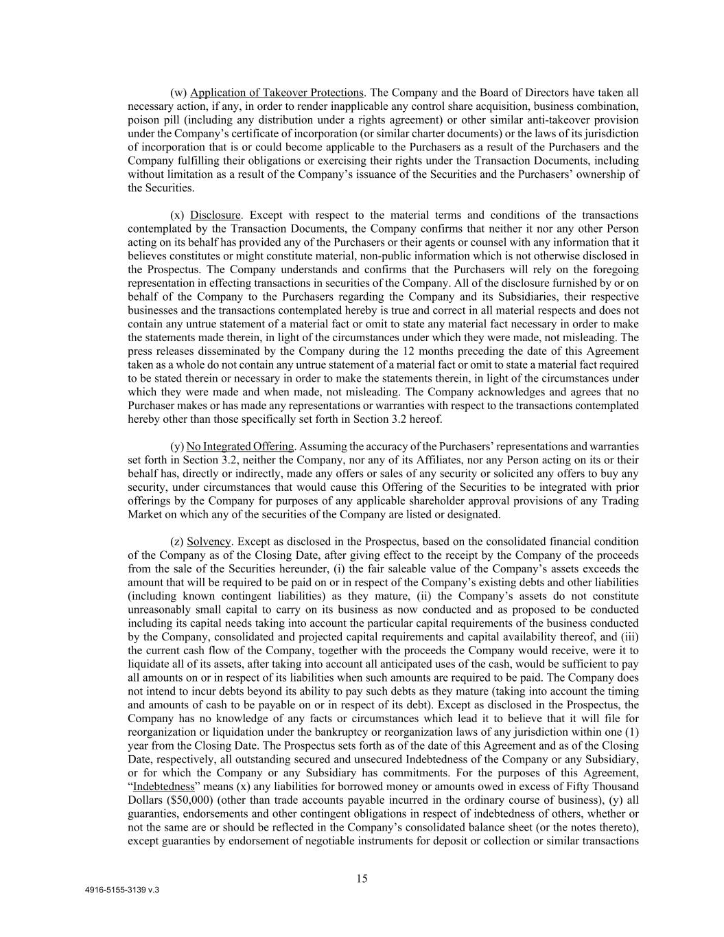 15 4916-5155-3139 v.3 (w) Application of Takeover Protections. The Company and the Board of Directors have taken all necessary action, if any, in order to render inapplicable any control share acquisition, business combination, poison pill (including any distribution under a rights agreement) or other similar anti-takeover provision under the Company’s certificate of incorporation (or similar charter documents) or the laws of its jurisdiction of incorporation that is or could become applicable to the Purchasers as a result of the Purchasers and the Company fulfilling their obligations or exercising their rights under the Transaction Documents, including without limitation as a result of the Company’s issuance of the Securities and the Purchasers’ ownership of the Securities. (x) Disclosure. Except with respect to the material terms and conditions of the transactions contemplated by the Transaction Documents, the Company confirms that neither it nor any other Person acting on its behalf has provided any of the Purchasers or their agents or counsel with any information that it believes constitutes or might constitute material, non-public information which is not otherwise disclosed in the Prospectus. The Company understands and confirms that the Purchasers will rely on the foregoing representation in effecting transactions in securities of the Company. All of the disclosure furnished by or on behalf of the Company to the Purchasers regarding the Company and its Subsidiaries, their respective businesses and the transactions contemplated hereby is true and correct in all material respects and does not contain any untrue statement of a material fact or omit to state any material fact necessary in order to make the statements made therein, in light of the circumstances under which they were made, not misleading. The press releases disseminated by the Company during the 12 months preceding the date of this Agreement taken as a whole do not contain any untrue statement of a material fact or omit to state a material fact required to be stated therein or necessary in order to make the statements therein, in light of the circumstances under which they were made and when made, not misleading. The Company acknowledges and agrees that no Purchaser makes or has made any representations or warranties with respect to the transactions contemplated hereby other than those specifically set forth in Section 3.2 hereof. (y) No Integrated Offering. Assuming the accuracy of the Purchasers’ representations and warranties set forth in Section 3.2, neither the Company, nor any of its Affiliates, nor any Person acting on its or their behalf has, directly or indirectly, made any offers or sales of any security or solicited any offers to buy any security, under circumstances that would cause this Offering of the Securities to be integrated with prior offerings by the Company for purposes of any applicable shareholder approval provisions of any Trading Market on which any of the securities of the Company are listed or designated. (z) Solvency. Except as disclosed in the Prospectus, based on the consolidated financial condition of the Company as of the Closing Date, after giving effect to the receipt by the Company of the proceeds from the sale of the Securities hereunder, (i) the fair saleable value of the Company’s assets exceeds the amount that will be required to be paid on or in respect of the Company’s existing debts and other liabilities (including known contingent liabilities) as they mature, (ii) the Company’s assets do not constitute unreasonably small capital to carry on its business as now conducted and as proposed to be conducted including its capital needs taking into account the particular capital requirements of the business conducted by the Company, consolidated and projected capital requirements and capital availability thereof, and (iii) the current cash flow of the Company, together with the proceeds the Company would receive, were it to liquidate all of its assets, after taking into account all anticipated uses of the cash, would be sufficient to pay all amounts on or in respect of its liabilities when such amounts are required to be paid. The Company does not intend to incur debts beyond its ability to pay such debts as they mature (taking into account the timing and amounts of cash to be payable on or in respect of its debt). Except as disclosed in the Prospectus, the Company has no knowledge of any facts or circumstances which lead it to believe that it will file for reorganization or liquidation under the bankruptcy or reorganization laws of any jurisdiction within one (1) year from the Closing Date. The Prospectus sets forth as of the date of this Agreement and as of the Closing Date, respectively, all outstanding secured and unsecured Indebtedness of the Company or any Subsidiary, or for which the Company or any Subsidiary has commitments. For the purposes of this Agreement, “Indebtedness” means (x) any liabilities for borrowed money or amounts owed in excess of Fifty Thousand Dollars ($50,000) (other than trade accounts payable incurred in the ordinary course of business), (y) all guaranties, endorsements and other contingent obligations in respect of indebtedness of others, whether or not the same are or should be reflected in the Company’s consolidated balance sheet (or the notes thereto), except guaranties by endorsement of negotiable instruments for deposit or collection or similar transactions