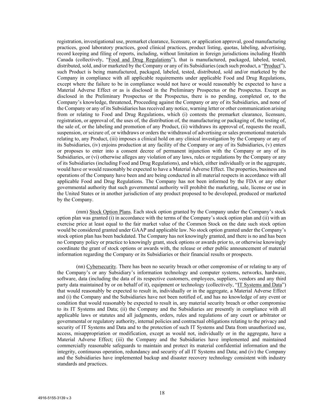 18 4916-5155-3139 v.3 registration, investigational use, premarket clearance, licensure, or application approval, good manufacturing practices, good laboratory practices, good clinical practices, product listing, quotas, labeling, advertising, record keeping and filing of reports, including, without limitation in foreign jurisdictions including Health Canada (collectively, “Food and Drug Regulations”), that is manufactured, packaged, labeled, tested, distributed, sold, and/or marketed by the Company or any of its Subsidiaries (each such product, a “Product”), such Product is being manufactured, packaged, labeled, tested, distributed, sold and/or marketed by the Company in compliance with all applicable requirements under applicable Food and Drug Regulations, except where the failure to be in compliance would not have or would reasonably be expected to have a Material Adverse Effect or as is disclosed in the Preliminary Prospectus or the Prospectus. Except as disclosed in the Preliminary Prospectus or the Prospectus, there is no pending, completed or, to the Company’s knowledge, threatened, Proceeding against the Company or any of its Subsidiaries, and none of the Company or any of its Subsidiaries has received any notice, warning letter or other communication arising from or relating to Food and Drug Regulations, which (i) contests the premarket clearance, licensure, registration, or approval of, the uses of, the distribution of, the manufacturing or packaging of, the testing of, the sale of, or the labeling and promotion of any Product, (ii) withdraws its approval of, requests the recall, suspension, or seizure of, or withdraws or orders the withdrawal of advertising or sales promotional materials relating to, any Product, (iii) imposes a clinical hold on any clinical investigation by the Company or any of its Subsidiaries, (iv) enjoins production at any facility of the Company or any of its Subsidiaries, (v) enters or proposes to enter into a consent decree of permanent injunction with the Company or any of its Subsidiaries, or (vi) otherwise alleges any violation of any laws, rules or regulations by the Company or any of its Subsidiaries (including Food and Drug Regulations), and which, either individually or in the aggregate, would have or would reasonably be expected to have a Material Adverse Effect. The properties, business and operations of the Company have been and are being conducted in all material respects in accordance with all applicable Food and Drug Regulations. The Company has not been informed by the FDA or any other governmental authority that such governmental authority will prohibit the marketing, sale, license or use in the United States or in another jurisdiction of any product proposed to be developed, produced or marketed by the Company. (mm) Stock Option Plans. Each stock option granted by the Company under the Company’s stock option plan was granted (i) in accordance with the terms of the Company’s stock option plan and (ii) with an exercise price at least equal to the fair market value of the Common Stock on the date such stock option would be considered granted under GAAP and applicable law. No stock option granted under the Company’s stock option plan has been backdated. The Company has not knowingly granted, and there is no and has been no Company policy or practice to knowingly grant, stock options or awards prior to, or otherwise knowingly coordinate the grant of stock options or awards with, the release or other public announcement of material information regarding the Company or its Subsidiaries or their financial results or prospects. (nn) Cybersecurity. There has been no security breach or other compromise of or relating to any of the Company’s or any Subsidiary’s information technology and computer systems, networks, hardware, software, data (including the data of its respective customers, employees, suppliers, vendors and any third party data maintained by or on behalf of it), equipment or technology (collectively, “IT Systems and Data”) that would reasonably be expected to result in, individually or in the aggregate, a Material Adverse Effect and (i) the Company and the Subsidiaries have not been notified of, and has no knowledge of any event or condition that would reasonably be expected to result in, any material security breach or other compromise to its IT Systems and Data; (ii) the Company and the Subsidiaries are presently in compliance with all applicable laws or statutes and all judgments, orders, rules and regulations of any court or arbitrator or governmental or regulatory authority, internal policies and contractual obligations relating to the privacy and security of IT Systems and Data and to the protection of such IT Systems and Data from unauthorized use, access, misappropriation or modification, except as would not, individually or in the aggregate, have a Material Adverse Effect; (iii) the Company and the Subsidiaries have implemented and maintained commercially reasonable safeguards to maintain and protect its material confidential information and the integrity, continuous operation, redundancy and security of all IT Systems and Data; and (iv) the Company and the Subsidiaries have implemented backup and disaster recovery technology consistent with industry standards and practices.