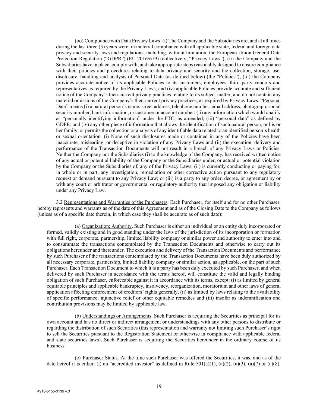 19 4916-5155-3139 v.3 (oo) Compliance with Data Privacy Laws. (i) The Company and the Subsidiaries are, and at all times during the last three (3) years were, in material compliance with all applicable state, federal and foreign data privacy and security laws and regulations, including, without limitation, the European Union General Data Protection Regulation (“GDPR”) (EU 2016/679) (collectively, “Privacy Laws”); (ii) the Company and the Subsidiaries have in place, comply with, and take appropriate steps reasonably designed to ensure compliance with their policies and procedures relating to data privacy and security and the collection, storage, use, disclosure, handling and analysis of Personal Data (as defined below) (the “Policies”); (iii) the Company provides accurate notice of its applicable Policies to its customers, employees, third party vendors and representatives as required by the Privacy Laws; and (iv) applicable Policies provide accurate and sufficient notice of the Company’s then-current privacy practices relating to its subject matter, and do not contain any material omissions of the Company’s then-current privacy practices, as required by Privacy Laws. “Personal Data” means (i) a natural person’s name, street address, telephone number, email address, photograph, social security number, bank information, or customer or account number; (ii) any information which would qualify as “personally identifying information” under the FTC, as amended; (iii) “personal data” as defined by GDPR; and (iv) any other piece of information that allows the identification of such natural person, or his or her family, or permits the collection or analysis of any identifiable data related to an identified person’s health or sexual orientation. (i) None of such disclosures made or contained in any of the Policies have been inaccurate, misleading, or deceptive in violation of any Privacy Laws and (ii) the execution, delivery and performance of the Transaction Documents will not result in a breach of any Privacy Laws or Policies. Neither the Company nor the Subsidiaries (i) to the knowledge of the Company, has received written notice of any actual or potential liability of the Company or the Subsidiaries under, or actual or potential violation by the Company or the Subsidiaries of, any of the Privacy Laws; (ii) is currently conducting or paying for, in whole or in part, any investigation, remediation or other corrective action pursuant to any regulatory request or demand pursuant to any Privacy Law; or (iii) is a party to any order, decree, or agreement by or with any court or arbitrator or governmental or regulatory authority that imposed any obligation or liability under any Privacy Law. 3.2 Representations and Warranties of the Purchasers. Each Purchaser, for itself and for no other Purchaser, hereby represents and warrants as of the date of this Agreement and as of the Closing Date to the Company as follows (unless as of a specific date therein, in which case they shall be accurate as of such date): (a) Organization; Authority. Such Purchaser is either an individual or an entity duly incorporated or formed, validly existing and in good standing under the laws of the jurisdiction of its incorporation or formation with full right, corporate, partnership, limited liability company or similar power and authority to enter into and to consummate the transactions contemplated by the Transaction Documents and otherwise to carry out its obligations hereunder and thereunder. The execution and delivery of the Transaction Documents and performance by such Purchaser of the transactions contemplated by the Transaction Documents have been duly authorized by all necessary corporate, partnership, limited liability company or similar action, as applicable, on the part of such Purchaser. Each Transaction Document to which it is a party has been duly executed by such Purchaser, and when delivered by such Purchaser in accordance with the terms hereof, will constitute the valid and legally binding obligation of such Purchaser, enforceable against it in accordance with its terms, except: (i) as limited by general equitable principles and applicable bankruptcy, insolvency, reorganization, moratorium and other laws of general application affecting enforcement of creditors’ rights generally, (ii) as limited by laws relating to the availability of specific performance, injunctive relief or other equitable remedies and (iii) insofar as indemnification and contribution provisions may be limited by applicable law. (b) Understandings or Arrangements. Such Purchaser is acquiring the Securities as principal for its own account and has no direct or indirect arrangement or understandings with any other persons to distribute or regarding the distribution of such Securities (this representation and warranty not limiting such Purchaser’s right to sell the Securities pursuant to the Registration Statement or otherwise in compliance with applicable federal and state securities laws). Such Purchaser is acquiring the Securities hereunder in the ordinary course of its business. (c) Purchaser Status. At the time such Purchaser was offered the Securities, it was, and as of the date hereof it is either: (i) an “accredited investor” as defined in Rule 501(a)(1), (a)(2), (a)(3), (a)(7) or (a)(8),