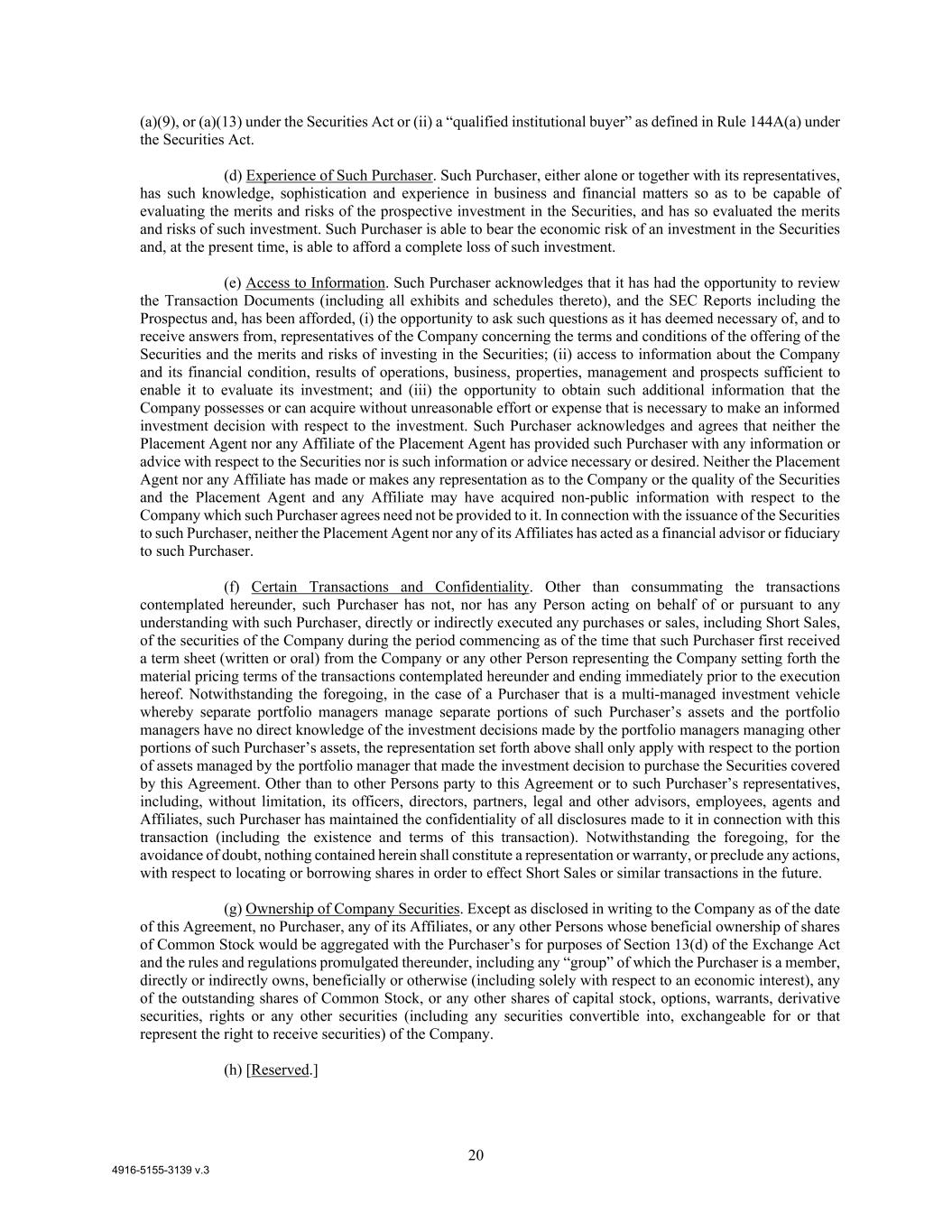 20 4916-5155-3139 v.3 (a)(9), or (a)(13) under the Securities Act or (ii) a “qualified institutional buyer” as defined in Rule 144A(a) under the Securities Act. (d) Experience of Such Purchaser. Such Purchaser, either alone or together with its representatives, has such knowledge, sophistication and experience in business and financial matters so as to be capable of evaluating the merits and risks of the prospective investment in the Securities, and has so evaluated the merits and risks of such investment. Such Purchaser is able to bear the economic risk of an investment in the Securities and, at the present time, is able to afford a complete loss of such investment. (e) Access to Information. Such Purchaser acknowledges that it has had the opportunity to review the Transaction Documents (including all exhibits and schedules thereto), and the SEC Reports including the Prospectus and, has been afforded, (i) the opportunity to ask such questions as it has deemed necessary of, and to receive answers from, representatives of the Company concerning the terms and conditions of the offering of the Securities and the merits and risks of investing in the Securities; (ii) access to information about the Company and its financial condition, results of operations, business, properties, management and prospects sufficient to enable it to evaluate its investment; and (iii) the opportunity to obtain such additional information that the Company possesses or can acquire without unreasonable effort or expense that is necessary to make an informed investment decision with respect to the investment. Such Purchaser acknowledges and agrees that neither the Placement Agent nor any Affiliate of the Placement Agent has provided such Purchaser with any information or advice with respect to the Securities nor is such information or advice necessary or desired. Neither the Placement Agent nor any Affiliate has made or makes any representation as to the Company or the quality of the Securities and the Placement Agent and any Affiliate may have acquired non-public information with respect to the Company which such Purchaser agrees need not be provided to it. In connection with the issuance of the Securities to such Purchaser, neither the Placement Agent nor any of its Affiliates has acted as a financial advisor or fiduciary to such Purchaser. (f) Certain Transactions and Confidentiality. Other than consummating the transactions contemplated hereunder, such Purchaser has not, nor has any Person acting on behalf of or pursuant to any understanding with such Purchaser, directly or indirectly executed any purchases or sales, including Short Sales, of the securities of the Company during the period commencing as of the time that such Purchaser first received a term sheet (written or oral) from the Company or any other Person representing the Company setting forth the material pricing terms of the transactions contemplated hereunder and ending immediately prior to the execution hereof. Notwithstanding the foregoing, in the case of a Purchaser that is a multi-managed investment vehicle whereby separate portfolio managers manage separate portions of such Purchaser’s assets and the portfolio managers have no direct knowledge of the investment decisions made by the portfolio managers managing other portions of such Purchaser’s assets, the representation set forth above shall only apply with respect to the portion of assets managed by the portfolio manager that made the investment decision to purchase the Securities covered by this Agreement. Other than to other Persons party to this Agreement or to such Purchaser’s representatives, including, without limitation, its officers, directors, partners, legal and other advisors, employees, agents and Affiliates, such Purchaser has maintained the confidentiality of all disclosures made to it in connection with this transaction (including the existence and terms of this transaction). Notwithstanding the foregoing, for the avoidance of doubt, nothing contained herein shall constitute a representation or warranty, or preclude any actions, with respect to locating or borrowing shares in order to effect Short Sales or similar transactions in the future. (g) Ownership of Company Securities. Except as disclosed in writing to the Company as of the date of this Agreement, no Purchaser, any of its Affiliates, or any other Persons whose beneficial ownership of shares of Common Stock would be aggregated with the Purchaser’s for purposes of Section 13(d) of the Exchange Act and the rules and regulations promulgated thereunder, including any “group” of which the Purchaser is a member, directly or indirectly owns, beneficially or otherwise (including solely with respect to an economic interest), any of the outstanding shares of Common Stock, or any other shares of capital stock, options, warrants, derivative securities, rights or any other securities (including any securities convertible into, exchangeable for or that represent the right to receive securities) of the Company. (h) [Reserved.]