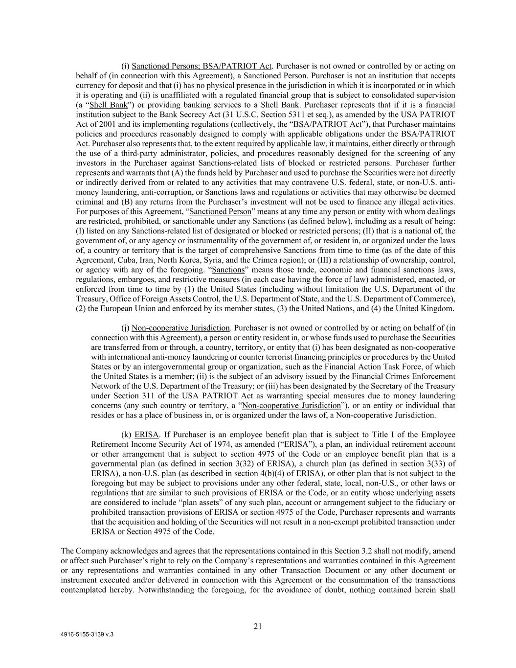 21 4916-5155-3139 v.3 (i) Sanctioned Persons; BSA/PATRIOT Act. Purchaser is not owned or controlled by or acting on behalf of (in connection with this Agreement), a Sanctioned Person. Purchaser is not an institution that accepts currency for deposit and that (i) has no physical presence in the jurisdiction in which it is incorporated or in which it is operating and (ii) is unaffiliated with a regulated financial group that is subject to consolidated supervision (a “Shell Bank”) or providing banking services to a Shell Bank. Purchaser represents that if it is a financial institution subject to the Bank Secrecy Act (31 U.S.C. Section 5311 et seq.), as amended by the USA PATRIOT Act of 2001 and its implementing regulations (collectively, the “BSA/PATRIOT Act”), that Purchaser maintains policies and procedures reasonably designed to comply with applicable obligations under the BSA/PATRIOT Act. Purchaser also represents that, to the extent required by applicable law, it maintains, either directly or through the use of a third-party administrator, policies, and procedures reasonably designed for the screening of any investors in the Purchaser against Sanctions-related lists of blocked or restricted persons. Purchaser further represents and warrants that (A) the funds held by Purchaser and used to purchase the Securities were not directly or indirectly derived from or related to any activities that may contravene U.S. federal, state, or non-U.S. anti- money laundering, anti-corruption, or Sanctions laws and regulations or activities that may otherwise be deemed criminal and (B) any returns from the Purchaser’s investment will not be used to finance any illegal activities. For purposes of this Agreement, “Sanctioned Person” means at any time any person or entity with whom dealings are restricted, prohibited, or sanctionable under any Sanctions (as defined below), including as a result of being: (I) listed on any Sanctions-related list of designated or blocked or restricted persons; (II) that is a national of, the government of, or any agency or instrumentality of the government of, or resident in, or organized under the laws of, a country or territory that is the target of comprehensive Sanctions from time to time (as of the date of this Agreement, Cuba, Iran, North Korea, Syria, and the Crimea region); or (III) a relationship of ownership, control, or agency with any of the foregoing. “Sanctions” means those trade, economic and financial sanctions laws, regulations, embargoes, and restrictive measures (in each case having the force of law) administered, enacted, or enforced from time to time by (1) the United States (including without limitation the U.S. Department of the Treasury, Office of Foreign Assets Control, the U.S. Department of State, and the U.S. Department of Commerce), (2) the European Union and enforced by its member states, (3) the United Nations, and (4) the United Kingdom. (j) Non-cooperative Jurisdiction. Purchaser is not owned or controlled by or acting on behalf of (in connection with this Agreement), a person or entity resident in, or whose funds used to purchase the Securities are transferred from or through, a country, territory, or entity that (i) has been designated as non-cooperative with international anti-money laundering or counter terrorist financing principles or procedures by the United States or by an intergovernmental group or organization, such as the Financial Action Task Force, of which the United States is a member; (ii) is the subject of an advisory issued by the Financial Crimes Enforcement Network of the U.S. Department of the Treasury; or (iii) has been designated by the Secretary of the Treasury under Section 311 of the USA PATRIOT Act as warranting special measures due to money laundering concerns (any such country or territory, a “Non-cooperative Jurisdiction”), or an entity or individual that resides or has a place of business in, or is organized under the laws of, a Non-cooperative Jurisdiction. (k) ERISA. If Purchaser is an employee benefit plan that is subject to Title I of the Employee Retirement Income Security Act of 1974, as amended (“ERISA”), a plan, an individual retirement account or other arrangement that is subject to section 4975 of the Code or an employee benefit plan that is a governmental plan (as defined in section 3(32) of ERISA), a church plan (as defined in section 3(33) of ERISA), a non-U.S. plan (as described in section 4(b)(4) of ERISA), or other plan that is not subject to the foregoing but may be subject to provisions under any other federal, state, local, non-U.S., or other laws or regulations that are similar to such provisions of ERISA or the Code, or an entity whose underlying assets are considered to include “plan assets” of any such plan, account or arrangement subject to the fiduciary or prohibited transaction provisions of ERISA or section 4975 of the Code, Purchaser represents and warrants that the acquisition and holding of the Securities will not result in a non-exempt prohibited transaction under ERISA or Section 4975 of the Code. The Company acknowledges and agrees that the representations contained in this Section 3.2 shall not modify, amend or affect such Purchaser’s right to rely on the Company’s representations and warranties contained in this Agreement or any representations and warranties contained in any other Transaction Document or any other document or instrument executed and/or delivered in connection with this Agreement or the consummation of the transactions contemplated hereby. Notwithstanding the foregoing, for the avoidance of doubt, nothing contained herein shall