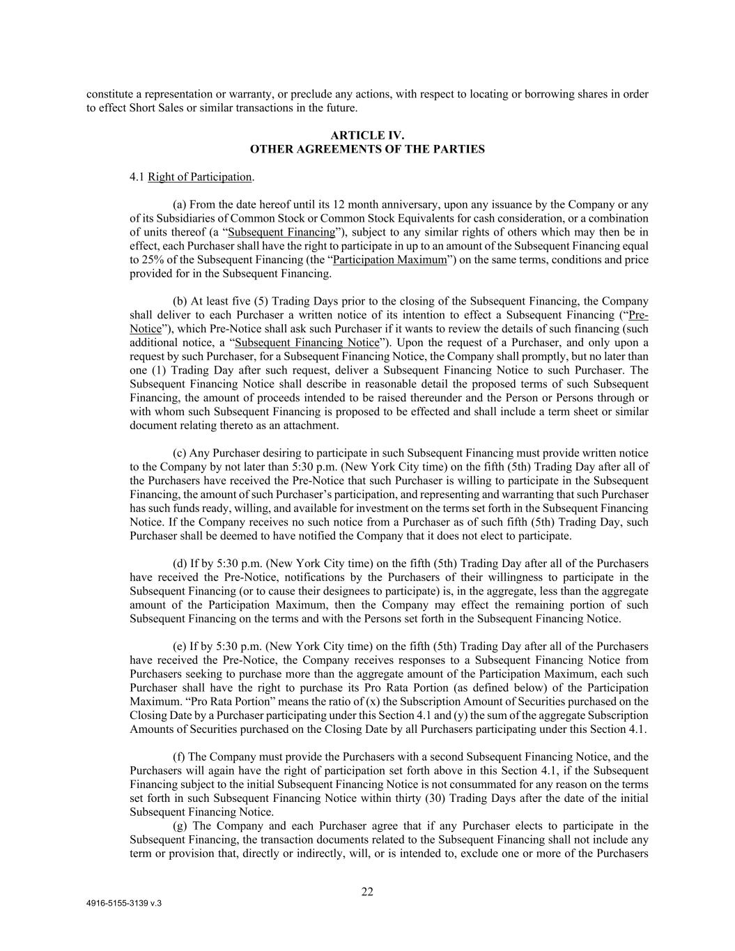 22 4916-5155-3139 v.3 constitute a representation or warranty, or preclude any actions, with respect to locating or borrowing shares in order to effect Short Sales or similar transactions in the future. ARTICLE IV. OTHER AGREEMENTS OF THE PARTIES 4.1 Right of Participation. (a) From the date hereof until its 12 month anniversary, upon any issuance by the Company or any of its Subsidiaries of Common Stock or Common Stock Equivalents for cash consideration, or a combination of units thereof (a “Subsequent Financing”), subject to any similar rights of others which may then be in effect, each Purchaser shall have the right to participate in up to an amount of the Subsequent Financing equal to 25% of the Subsequent Financing (the “Participation Maximum”) on the same terms, conditions and price provided for in the Subsequent Financing. (b) At least five (5) Trading Days prior to the closing of the Subsequent Financing, the Company shall deliver to each Purchaser a written notice of its intention to effect a Subsequent Financing (“Pre- Notice”), which Pre-Notice shall ask such Purchaser if it wants to review the details of such financing (such additional notice, a “Subsequent Financing Notice”). Upon the request of a Purchaser, and only upon a request by such Purchaser, for a Subsequent Financing Notice, the Company shall promptly, but no later than one (1) Trading Day after such request, deliver a Subsequent Financing Notice to such Purchaser. The Subsequent Financing Notice shall describe in reasonable detail the proposed terms of such Subsequent Financing, the amount of proceeds intended to be raised thereunder and the Person or Persons through or with whom such Subsequent Financing is proposed to be effected and shall include a term sheet or similar document relating thereto as an attachment. (c) Any Purchaser desiring to participate in such Subsequent Financing must provide written notice to the Company by not later than 5:30 p.m. (New York City time) on the fifth (5th) Trading Day after all of the Purchasers have received the Pre-Notice that such Purchaser is willing to participate in the Subsequent Financing, the amount of such Purchaser’s participation, and representing and warranting that such Purchaser has such funds ready, willing, and available for investment on the terms set forth in the Subsequent Financing Notice. If the Company receives no such notice from a Purchaser as of such fifth (5th) Trading Day, such Purchaser shall be deemed to have notified the Company that it does not elect to participate. (d) If by 5:30 p.m. (New York City time) on the fifth (5th) Trading Day after all of the Purchasers have received the Pre-Notice, notifications by the Purchasers of their willingness to participate in the Subsequent Financing (or to cause their designees to participate) is, in the aggregate, less than the aggregate amount of the Participation Maximum, then the Company may effect the remaining portion of such Subsequent Financing on the terms and with the Persons set forth in the Subsequent Financing Notice. (e) If by 5:30 p.m. (New York City time) on the fifth (5th) Trading Day after all of the Purchasers have received the Pre-Notice, the Company receives responses to a Subsequent Financing Notice from Purchasers seeking to purchase more than the aggregate amount of the Participation Maximum, each such Purchaser shall have the right to purchase its Pro Rata Portion (as defined below) of the Participation Maximum. “Pro Rata Portion” means the ratio of (x) the Subscription Amount of Securities purchased on the Closing Date by a Purchaser participating under this Section 4.1 and (y) the sum of the aggregate Subscription Amounts of Securities purchased on the Closing Date by all Purchasers participating under this Section 4.1. (f) The Company must provide the Purchasers with a second Subsequent Financing Notice, and the Purchasers will again have the right of participation set forth above in this Section 4.1, if the Subsequent Financing subject to the initial Subsequent Financing Notice is not consummated for any reason on the terms set forth in such Subsequent Financing Notice within thirty (30) Trading Days after the date of the initial Subsequent Financing Notice. (g) The Company and each Purchaser agree that if any Purchaser elects to participate in the Subsequent Financing, the transaction documents related to the Subsequent Financing shall not include any term or provision that, directly or indirectly, will, or is intended to, exclude one or more of the Purchasers