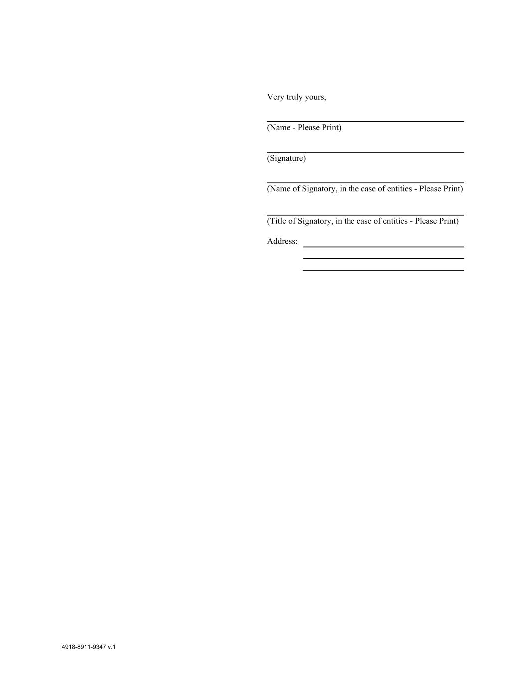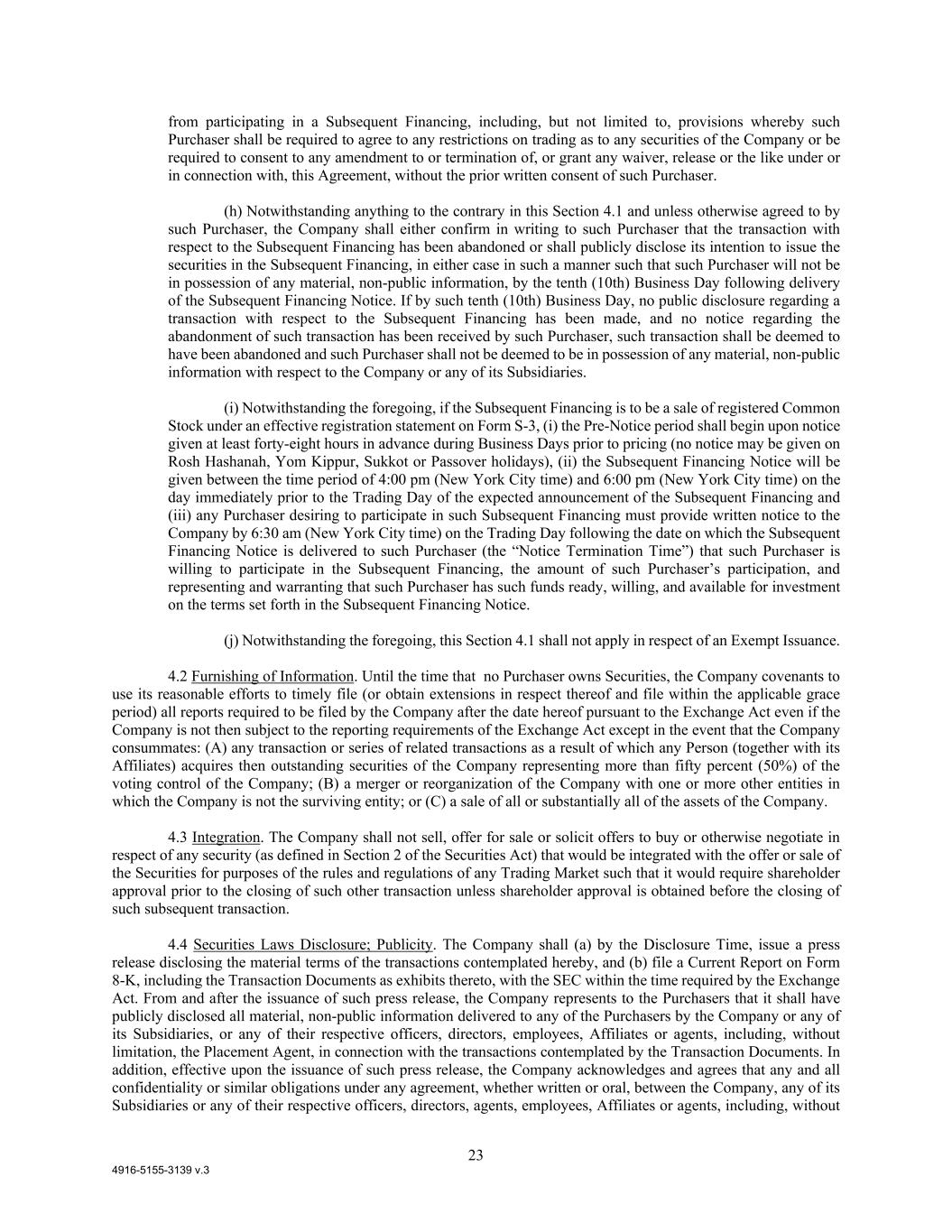 23 4916-5155-3139 v.3 from participating in a Subsequent Financing, including, but not limited to, provisions whereby such Purchaser shall be required to agree to any restrictions on trading as to any securities of the Company or be required to consent to any amendment to or termination of, or grant any waiver, release or the like under or in connection with, this Agreement, without the prior written consent of such Purchaser. (h) Notwithstanding anything to the contrary in this Section 4.1 and unless otherwise agreed to by such Purchaser, the Company shall either confirm in writing to such Purchaser that the transaction with respect to the Subsequent Financing has been abandoned or shall publicly disclose its intention to issue the securities in the Subsequent Financing, in either case in such a manner such that such Purchaser will not be in possession of any material, non-public information, by the tenth (10th) Business Day following delivery of the Subsequent Financing Notice. If by such tenth (10th) Business Day, no public disclosure regarding a transaction with respect to the Subsequent Financing has been made, and no notice regarding the abandonment of such transaction has been received by such Purchaser, such transaction shall be deemed to have been abandoned and such Purchaser shall not be deemed to be in possession of any material, non-public information with respect to the Company or any of its Subsidiaries. (i) Notwithstanding the foregoing, if the Subsequent Financing is to be a sale of registered Common Stock under an effective registration statement on Form S-3, (i) the Pre-Notice period shall begin upon notice given at least forty-eight hours in advance during Business Days prior to pricing (no notice may be given on Rosh Hashanah, Yom Kippur, Sukkot or Passover holidays), (ii) the Subsequent Financing Notice will be given between the time period of 4:00 pm (New York City time) and 6:00 pm (New York City time) on the day immediately prior to the Trading Day of the expected announcement of the Subsequent Financing and (iii) any Purchaser desiring to participate in such Subsequent Financing must provide written notice to the Company by 6:30 am (New York City time) on the Trading Day following the date on which the Subsequent Financing Notice is delivered to such Purchaser (the “Notice Termination Time”) that such Purchaser is willing to participate in the Subsequent Financing, the amount of such Purchaser’s participation, and representing and warranting that such Purchaser has such funds ready, willing, and available for investment on the terms set forth in the Subsequent Financing Notice. (j) Notwithstanding the foregoing, this Section 4.1 shall not apply in respect of an Exempt Issuance. 4.2 Furnishing of Information. Until the time that no Purchaser owns Securities, the Company covenants to use its reasonable efforts to timely file (or obtain extensions in respect thereof and file within the applicable grace period) all reports required to be filed by the Company after the date hereof pursuant to the Exchange Act even if the Company is not then subject to the reporting requirements of the Exchange Act except in the event that the Company consummates: (A) any transaction or series of related transactions as a result of which any Person (together with its Affiliates) acquires then outstanding securities of the Company representing more than fifty percent (50%) of the voting control of the Company; (B) a merger or reorganization of the Company with one or more other entities in which the Company is not the surviving entity; or (C) a sale of all or substantially all of the assets of the Company. 4.3 Integration. The Company shall not sell, offer for sale or solicit offers to buy or otherwise negotiate in respect of any security (as defined in Section 2 of the Securities Act) that would be integrated with the offer or sale of the Securities for purposes of the rules and regulations of any Trading Market such that it would require shareholder approval prior to the closing of such other transaction unless shareholder approval is obtained before the closing of such subsequent transaction. 4.4 Securities Laws Disclosure; Publicity. The Company shall (a) by the Disclosure Time, issue a press release disclosing the material terms of the transactions contemplated hereby, and (b) file a Current Report on Form 8-K, including the Transaction Documents as exhibits thereto, with the SEC within the time required by the Exchange Act. From and after the issuance of such press release, the Company represents to the Purchasers that it shall have publicly disclosed all material, non-public information delivered to any of the Purchasers by the Company or any of its Subsidiaries, or any of their respective officers, directors, employees, Affiliates or agents, including, without limitation, the Placement Agent, in connection with the transactions contemplated by the Transaction Documents. In addition, effective upon the issuance of such press release, the Company acknowledges and agrees that any and all confidentiality or similar obligations under any agreement, whether written or oral, between the Company, any of its Subsidiaries or any of their respective officers, directors, agents, employees, Affiliates or agents, including, without