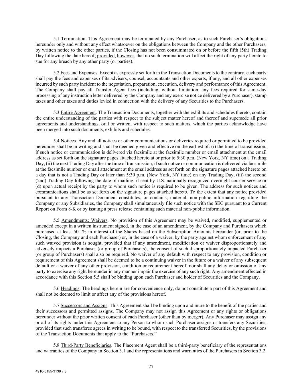 27 4916-5155-3139 v.3 5.1 Termination. This Agreement may be terminated by any Purchaser, as to such Purchaser’s obligations hereunder only and without any effect whatsoever on the obligations between the Company and the other Purchasers, by written notice to the other parties, if the Closing has not been consummated on or before the fifth (5th) Trading Day following the date hereof; provided, however, that no such termination will affect the right of any party hereto to sue for any breach by any other party (or parties). 5.2 Fees and Expenses. Except as expressly set forth in the Transaction Documents to the contrary, each party shall pay the fees and expenses of its advisers, counsel, accountants and other experts, if any, and all other expenses incurred by such party incident to the negotiation, preparation, execution, delivery and performance of this Agreement. The Company shall pay all Transfer Agent fees (including, without limitation, any fees required for same-day processing of any instruction letter delivered by the Company and any exercise notice delivered by a Purchaser), stamp taxes and other taxes and duties levied in connection with the delivery of any Securities to the Purchasers. 5.3 Entire Agreement. The Transaction Documents, together with the exhibits and schedules thereto, contain the entire understanding of the parties with respect to the subject matter hereof and thereof and supersede all prior agreements and understandings, oral or written, with respect to such matters, which the parties acknowledge have been merged into such documents, exhibits and schedules. 5.4 Notices. Any and all notices or other communications or deliveries required or permitted to be provided hereunder shall be in writing and shall be deemed given and effective on the earliest of: (i) the time of transmission, if such notice or communication is delivered via facsimile at the facsimile number or email attachment at the email address as set forth on the signature pages attached hereto at or prior to 5:30 p.m. (New York, NY time) on a Trading Day, (ii) the next Trading Day after the time of transmission, if such notice or communication is delivered via facsimile at the facsimile number or email attachment at the email address as set forth on the signature pages attached hereto on a day that is not a Trading Day or later than 5:30 p.m. (New York, NY time) on any Trading Day, (iii) the second (2nd) Trading Day following the date of mailing, if sent by U.S. nationally recognized overnight courier service or (d) upon actual receipt by the party to whom such notice is required to be given. The address for such notices and communications shall be as set forth on the signature pages attached hereto. To the extent that any notice provided pursuant to any Transaction Document constitutes, or contains, material, non-public information regarding the Company or any Subsidiaries, the Company shall simultaneously file such notice with the SEC pursuant to a Current Report on Form 8-K or by issuing a press release containing such material non-public information. 5.5 Amendments; Waivers. No provision of this Agreement may be waived, modified, supplemented or amended except in a written instrument signed, in the case of an amendment, by the Company and Purchasers which purchased at least 50.1% in interest of the Shares based on the Subscription Amounts hereunder (or, prior to the Closing, the Company and each Purchaser) or, in the case of a waiver, by the party against whom enforcement of any such waived provision is sought, provided that if any amendment, modification or waiver disproportionately and adversely impacts a Purchaser (or group of Purchasers), the consent of such disproportionately impacted Purchaser (or group of Purchasers) shall also be required. No waiver of any default with respect to any provision, condition or requirement of this Agreement shall be deemed to be a continuing waiver in the future or a waiver of any subsequent default or a waiver of any other provision, condition or requirement hereof, nor shall any delay or omission of any party to exercise any right hereunder in any manner impair the exercise of any such right. Any amendment effected in accordance with this Section 5.5 shall be binding upon each Purchaser and holder of Securities and the Company. 5.6 Headings. The headings herein are for convenience only, do not constitute a part of this Agreement and shall not be deemed to limit or affect any of the provisions hereof. 5.7 Successors and Assigns. This Agreement shall be binding upon and inure to the benefit of the parties and their successors and permitted assigns. The Company may not assign this Agreement or any rights or obligations hereunder without the prior written consent of each Purchaser (other than by merger). Any Purchaser may assign any or all of its rights under this Agreement to any Person to whom such Purchaser assigns or transfers any Securities, provided that such transferee agrees in writing to be bound, with respect to the transferred Securities, by the provisions of the Transaction Documents that apply to the “Purchasers.” 5.8 Third-Party Beneficiaries. The Placement Agent shall be a third-party beneficiary of the representations and warranties of the Company in Section 3.1 and the representations and warranties of the Purchasers in Section 3.2.