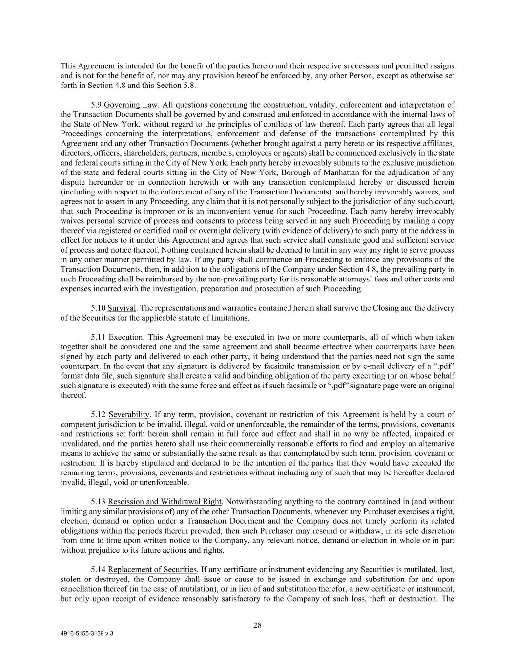 28 4916-5155-3139 v.3 This Agreement is intended for the benefit of the parties hereto and their respective successors and permitted assigns and is not for the benefit of, nor may any provision hereof be enforced by, any other Person, except as otherwise set forth in Section 4.8 and this Section 5.8. 5.9 Governing Law. All questions concerning the construction, validity, enforcement and interpretation of the Transaction Documents shall be governed by and construed and enforced in accordance with the internal laws of the State of New York, without regard to the principles of conflicts of law thereof. Each party agrees that all legal Proceedings concerning the interpretations, enforcement and defense of the transactions contemplated by this Agreement and any other Transaction Documents (whether brought against a party hereto or its respective affiliates, directors, officers, shareholders, partners, members, employees or agents) shall be commenced exclusively in the state and federal courts sitting in the City of New York. Each party hereby irrevocably submits to the exclusive jurisdiction of the state and federal courts sitting in the City of New York, Borough of Manhattan for the adjudication of any dispute hereunder or in connection herewith or with any transaction contemplated hereby or discussed herein (including with respect to the enforcement of any of the Transaction Documents), and hereby irrevocably waives, and agrees not to assert in any Proceeding, any claim that it is not personally subject to the jurisdiction of any such court, that such Proceeding is improper or is an inconvenient venue for such Proceeding. Each party hereby irrevocably waives personal service of process and consents to process being served in any such Proceeding by mailing a copy thereof via registered or certified mail or overnight delivery (with evidence of delivery) to such party at the address in effect for notices to it under this Agreement and agrees that such service shall constitute good and sufficient service of process and notice thereof. Nothing contained herein shall be deemed to limit in any way any right to serve process in any other manner permitted by law. If any party shall commence an Proceeding to enforce any provisions of the Transaction Documents, then, in addition to the obligations of the Company under Section 4.8, the prevailing party in such Proceeding shall be reimbursed by the non-prevailing party for its reasonable attorneys’ fees and other costs and expenses incurred with the investigation, preparation and prosecution of such Proceeding. 5.10 Survival. The representations and warranties contained herein shall survive the Closing and the delivery of the Securities for the applicable statute of limitations. 5.11 Execution. This Agreement may be executed in two or more counterparts, all of which when taken together shall be considered one and the same agreement and shall become effective when counterparts have been signed by each party and delivered to each other party, it being understood that the parties need not sign the same counterpart. In the event that any signature is delivered by facsimile transmission or by e-mail delivery of a “.pdf” format data file, such signature shall create a valid and binding obligation of the party executing (or on whose behalf such signature is executed) with the same force and effect as if such facsimile or “.pdf” signature page were an original thereof. 5.12 Severability. If any term, provision, covenant or restriction of this Agreement is held by a court of competent jurisdiction to be invalid, illegal, void or unenforceable, the remainder of the terms, provisions, covenants and restrictions set forth herein shall remain in full force and effect and shall in no way be affected, impaired or invalidated, and the parties hereto shall use their commercially reasonable efforts to find and employ an alternative means to achieve the same or substantially the same result as that contemplated by such term, provision, covenant or restriction. It is hereby stipulated and declared to be the intention of the parties that they would have executed the remaining terms, provisions, covenants and restrictions without including any of such that may be hereafter declared invalid, illegal, void or unenforceable. 5.13 Rescission and Withdrawal Right. Notwithstanding anything to the contrary contained in (and without limiting any similar provisions of) any of the other Transaction Documents, whenever any Purchaser exercises a right, election, demand or option under a Transaction Document and the Company does not timely perform its related obligations within the periods therein provided, then such Purchaser may rescind or withdraw, in its sole discretion from time to time upon written notice to the Company, any relevant notice, demand or election in whole or in part without prejudice to its future actions and rights. 5.14 Replacement of Securities. If any certificate or instrument evidencing any Securities is mutilated, lost, stolen or destroyed, the Company shall issue or cause to be issued in exchange and substitution for and upon cancellation thereof (in the case of mutilation), or in lieu of and substitution therefor, a new certificate or instrument, but only upon receipt of evidence reasonably satisfactory to the Company of such loss, theft or destruction. The