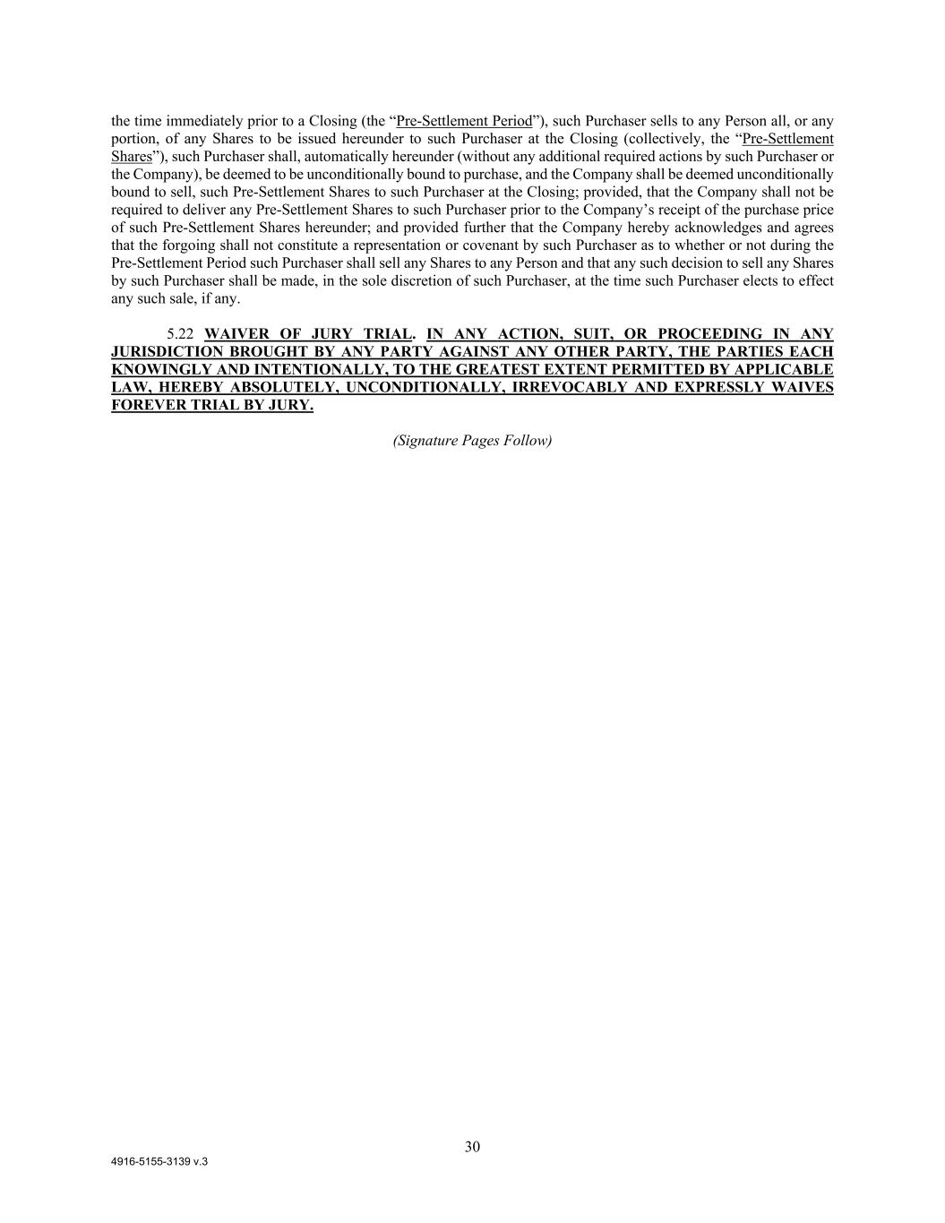 30 4916-5155-3139 v.3 the time immediately prior to a Closing (the “Pre-Settlement Period”), such Purchaser sells to any Person all, or any portion, of any Shares to be issued hereunder to such Purchaser at the Closing (collectively, the “Pre-Settlement Shares”), such Purchaser shall, automatically hereunder (without any additional required actions by such Purchaser or the Company), be deemed to be unconditionally bound to purchase, and the Company shall be deemed unconditionally bound to sell, such Pre-Settlement Shares to such Purchaser at the Closing; provided, that the Company shall not be required to deliver any Pre-Settlement Shares to such Purchaser prior to the Company’s receipt of the purchase price of such Pre-Settlement Shares hereunder; and provided further that the Company hereby acknowledges and agrees that the forgoing shall not constitute a representation or covenant by such Purchaser as to whether or not during the Pre-Settlement Period such Purchaser shall sell any Shares to any Person and that any such decision to sell any Shares by such Purchaser shall be made, in the sole discretion of such Purchaser, at the time such Purchaser elects to effect any such sale, if any. 5.22 WAIVER OF JURY TRIAL. IN ANY ACTION, SUIT, OR PROCEEDING IN ANY JURISDICTION BROUGHT BY ANY PARTY AGAINST ANY OTHER PARTY, THE PARTIES EACH KNOWINGLY AND INTENTIONALLY, TO THE GREATEST EXTENT PERMITTED BY APPLICABLE LAW, HEREBY ABSOLUTELY, UNCONDITIONALLY, IRREVOCABLY AND EXPRESSLY WAIVES FOREVER TRIAL BY JURY. (Signature Pages Follow)