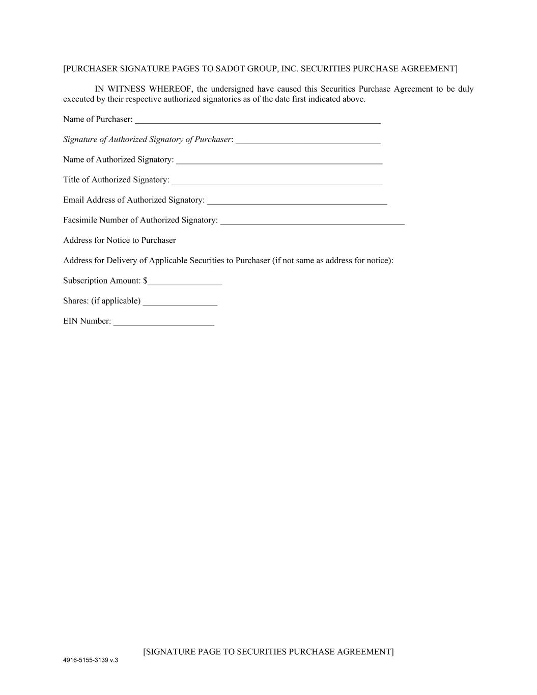 [SIGNATURE PAGE TO SECURITIES PURCHASE AGREEMENT] 4916-5155-3139 v.3 [PURCHASER SIGNATURE PAGES TO SADOT GROUP, INC. SECURITIES PURCHASE AGREEMENT] IN WITNESS WHEREOF, the undersigned have caused this Securities Purchase Agreement to be duly executed by their respective authorized signatories as of the date first indicated above. Name of Purchaser: ________________________________________________________ Signature of Authorized Signatory of Purchaser: _________________________________ Name of Authorized Signatory: _______________________________________________ Title of Authorized Signatory: ________________________________________________ Email Address of Authorized Signatory: _________________________________________ Facsimile Number of Authorized Signatory: __________________________________________ Address for Notice to Purchaser Address for Delivery of Applicable Securities to Purchaser (if not same as address for notice): Subscription Amount: $_________________ Shares: (if applicable) _________________ EIN Number: _______________________
