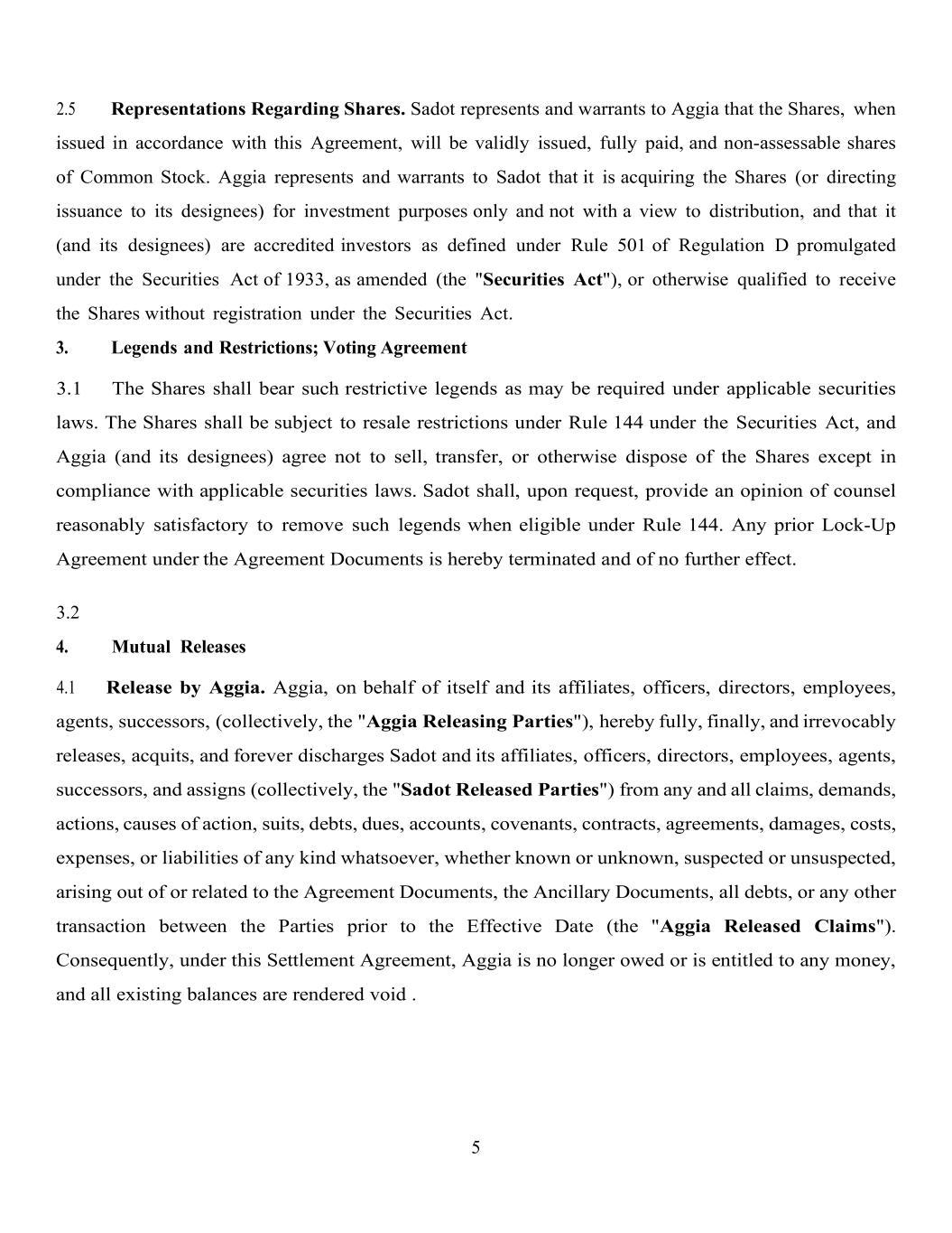 5 2.5 Representations Regarding Shares. Sadot represents and warrants to Aggia that the Shares, when issued in accordance with this Agreement, will be validly issued, fully paid, and non-assessable shares of Common Stock. Aggia represents and warrants to Sadot that it is acquiring the Shares (or directing issuance to its designees) for investment purposes only and not with a view to distribution, and that it (and its designees) are accredited investors as defined under Rule 501 of Regulation D promulgated under the Securities Act of 1933, as amended (the "Securities Act"), or otherwise qualified to receive the Shares without registration under the Securities Act. 3. Legends and Restrictions; Voting Agreement 3.1 The Shares shall bear such restrictive legends as may be required under applicable securities laws. The Shares shall be subject to resale restrictions under Rule 144 under the Securities Act, and Aggia (and its designees) agree not to sell, transfer, or otherwise dispose of the Shares except in compliance with applicable securities laws. Sadot shall, upon request, provide an opinion of counsel reasonably satisfactory to remove such legends when eligible under Rule 144. Any prior Lock-Up Agreement under the Agreement Documents is hereby terminated and of no further effect. 3.2 4. Mutual Releases 4.1 Release by Aggia. Aggia, on behalf of itself and its affiliates, officers, directors, employees, agents, successors, (collectively, the "Aggia Releasing Parties"), hereby fully, finally, and irrevocably releases, acquits, and forever discharges Sadot and its affiliates, officers, directors, employees, agents, successors, and assigns (collectively, the "Sadot Released Parties") from any and all claims, demands, actions, causes of action, suits, debts, dues, accounts, covenants, contracts, agreements, damages, costs, expenses, or liabilities of any kind whatsoever, whether known or unknown, suspected or unsuspected, arising out of or related to the Agreement Documents, the Ancillary Documents, all debts, or any other transaction between the Parties prior to the Effective Date (the "Aggia Released Claims"). Consequently, under this Settlement Agreement, Aggia is no longer owed or is entitled to any money, and all existing balances are rendered void .