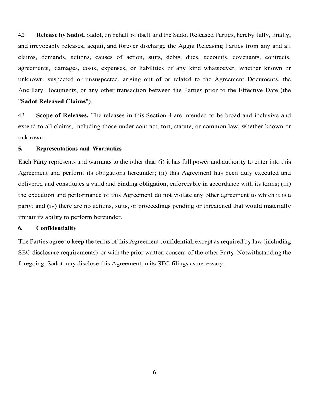 6 4.2 Release by Sadot. Sadot, on behalf of itself and the Sadot Released Parties, hereby fully, finally, and irrevocably releases, acquit, and forever discharge the Aggia Releasing Parties from any and all claims, demands, actions, causes of action, suits, debts, dues, accounts, covenants, contracts, agreements, damages, costs, expenses, or liabilities of any kind whatsoever, whether known or unknown, suspected or unsuspected, arising out of or related to the Agreement Documents, the Ancillary Documents, or any other transaction between the Parties prior to the Effective Date (the "Sadot Released Claims"). 4.3 Scope of Releases. The releases in this Section 4 are intended to be broad and inclusive and extend to all claims, including those under contract, tort, statute, or common law, whether known or unknown. 5. Representations and Warranties Each Party represents and warrants to the other that: (i) it has full power and authority to enter into this Agreement and perform its obligations hereunder; (ii) this Agreement has been duly executed and delivered and constitutes a valid and binding obligation, enforceable in accordance with its terms; (iii) the execution and performance of this Agreement do not violate any other agreement to which it is a party; and (iv) there are no actions, suits, or proceedings pending or threatened that would materially impair its ability to perform hereunder. 6. Confidentiality The Parties agree to keep the terms of this Agreement confidential, except as required by law (including SEC disclosure requirements) or with the prior written consent of the other Party. Notwithstanding the foregoing, Sadot may disclose this Agreement in its SEC filings as necessary.