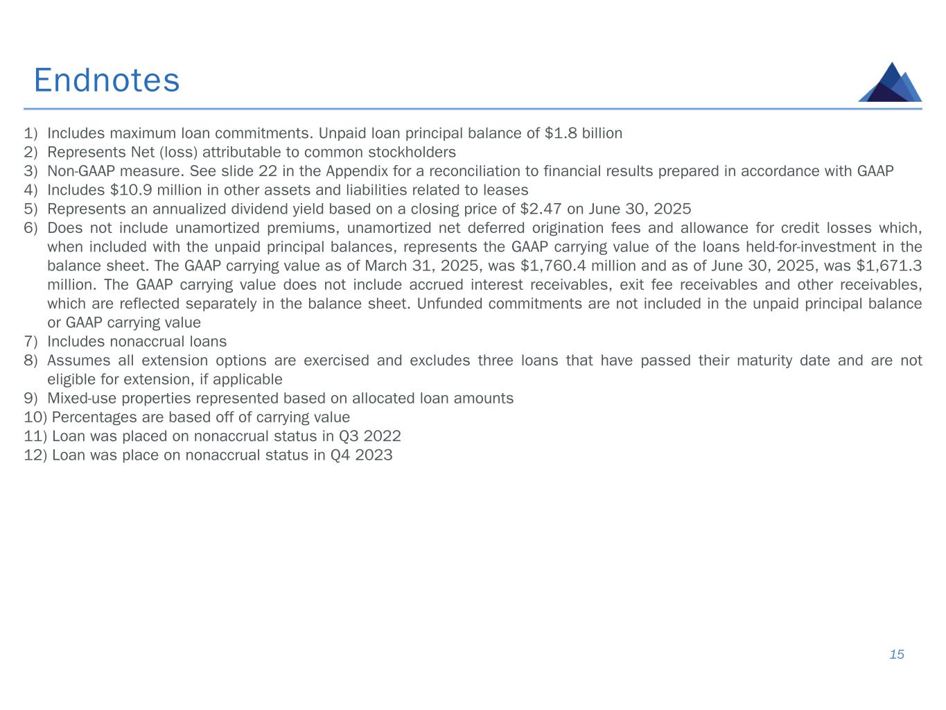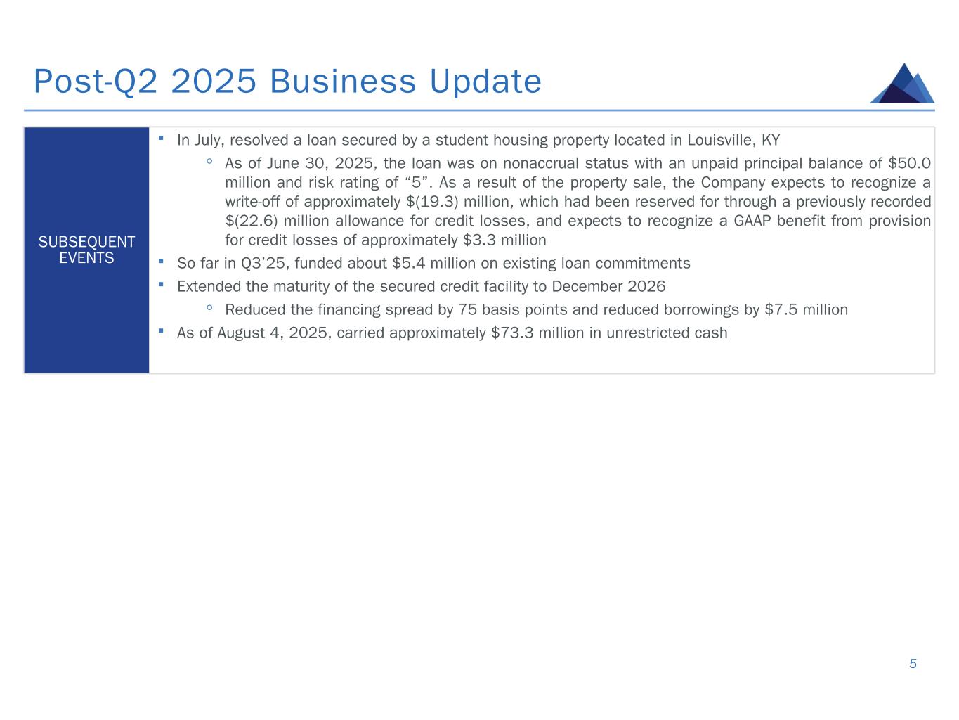 2025年6月30日現在、このローンは、未払い元本残高5,000万ドル、リスク格付け「5」で、非稼動状態にあった。この物件売却の結果、当社は約1930万ドルの評価損を認識する見込みであるが、この評価損は以前に計上した2260万ドルの貸倒引当金により引当計上されていたものであり、GAAP基準では約330万ドルの貸倒引当金戻入益を認識する見込みである。