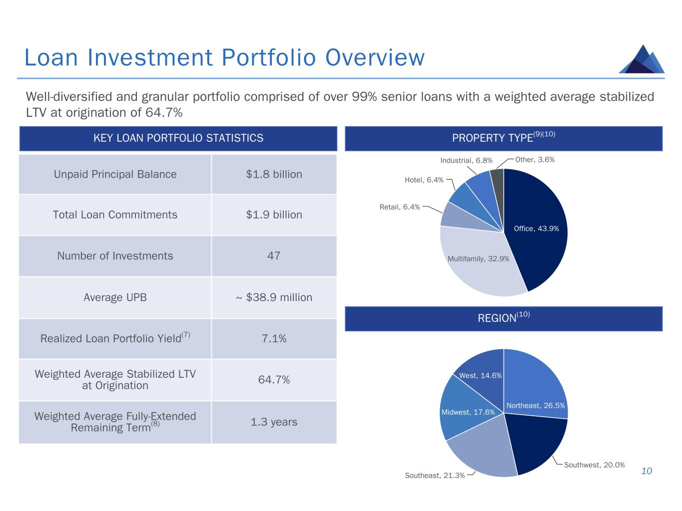 -当四半期末現在、98%変動金利のローン・ポートフォリオを保有しており、ローン・コミットメント総額は19億ドル、99%超がシニア・ローンで構成され、ポートフォリオ加重平均の組成時安定化LTV(3) は64.7%、実現ローン・ポートフォリオ利回り(4) は7.1%。