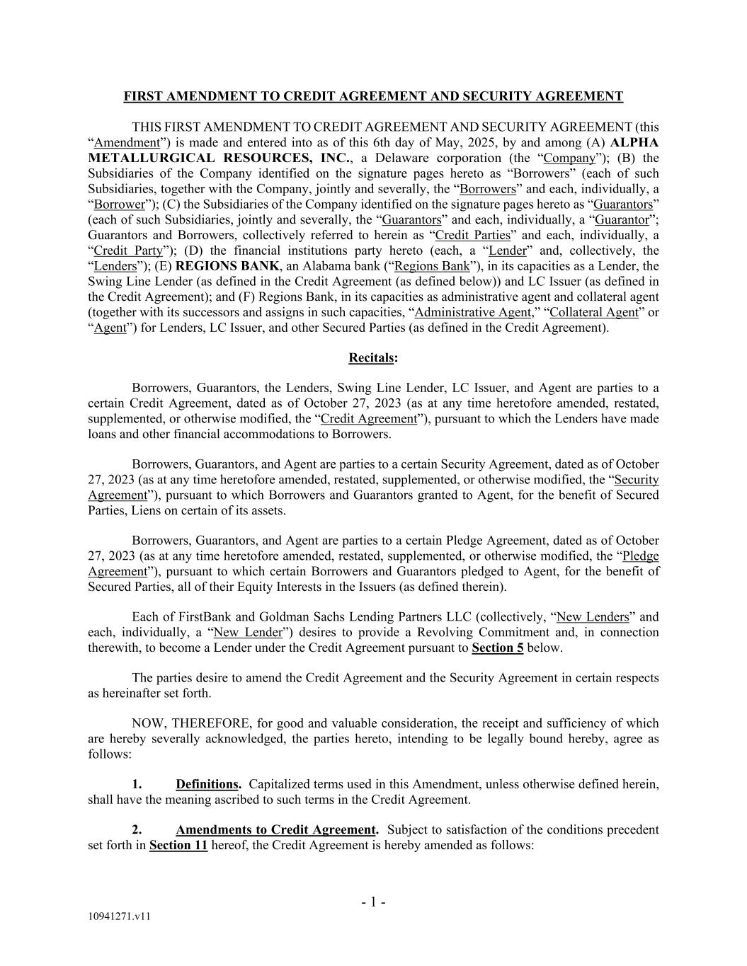 - 1 - 10941271.v11 FIRST AMENDMENT TO CREDIT AGREEMENT AND SECURITY AGREEMENT THIS FIRST AMENDMENT TO CREDIT AGREEMENT AND SECURITY AGREEMENT (this “Amendment”) is made and entered into as of this 6th day of May, 2025, by and among (A) ALPHA METALLURGICAL RESOURCES, INC., a Delaware corporation (the “Company”); (B) the Subsidiaries of the Company identified on the signature pages hereto as “Borrowers” (each of such Subsidiaries, together with the Company, jointly and severally, the “Borrowers” and each, individually, a “Borrower”); (C) the Subsidiaries of the Company identified on the signature pages hereto as “Guarantors” (each of such Subsidiaries, jointly and severally, the “Guarantors” and each, individually, a “Guarantor”; Guarantors and Borrowers, collectively referred to herein as “Credit Parties” and each, individually, a “Credit Party”); (D) the financial institutions party hereto (each, a “Lender” and, collectively, the “Lenders”); (E) REGIONS BANK, an Alabama bank (“Regions Bank”), in its capacities as a Lender, the Swing Line Lender (as defined in the Credit Agreement (as defined below)) and LC Issuer (as defined in the Credit Agreement); and (F) Regions Bank, in its capacities as administrative agent and collateral agent (together with its successors and assigns in such capacities, “Administrative Agent,” “Collateral Agent” or “Agent”) for Lenders, LC Issuer, and other Secured Parties (as defined in the Credit Agreement). Recitals: Borrowers, Guarantors, the Lenders, Swing Line Lender, LC Issuer, and Agent are parties to a certain Credit Agreement, dated as of October 27, 2023 (as at any time heretofore amended, restated, supplemented, or otherwise modified, the “Credit Agreement”), pursuant to which the Lenders have made loans and other financial accommodations to Borrowers. Borrowers, Guarantors, and Agent are parties to a certain Security Agreement, dated as of October 27, 2023 (as at any time heretofore amended, restated, supplemented, or otherwise modified, the “Security Agreement”), pursuant to which Borrowers and Guarantors granted to Agent, for the benefit of Secured Parties, Liens on certain of its assets. Borrowers, Guarantors, and Agent are parties to a certain Pledge Agreement, dated as of October 27, 2023 (as at any time heretofore amended, restated, supplemented, or otherwise modified, the “Pledge Agreement”), pursuant to which certain Borrowers and Guarantors pledged to Agent, for the benefit of Secured Parties, all of their Equity Interests in the Issuers (as defined therein). Each of FirstBank and Goldman Sachs Lending Partners LLC (collectively, “New Lenders” and each, individually, a “New Lender”) desires to provide a Revolving Commitment and, in connection therewith, to become a Lender under the Credit Agreement pursuant to Section 5 below. The parties desire to amend the Credit Agreement and the Security Agreement in certain respects as hereinafter set forth. NOW, THEREFORE, for good and valuable consideration, the receipt and sufficiency of which are hereby severally acknowledged, the parties hereto, intending to be legally bound hereby, agree as follows: 1. Definitions. Capitalized terms used in this Amendment, unless otherwise defined herein, shall have the meaning ascribed to such terms in the Credit Agreement. 2. Amendments to Credit Agreement. Subject to satisfaction of the conditions precedent set forth in Section 11 hereof, the Credit Agreement is hereby amended as follows: