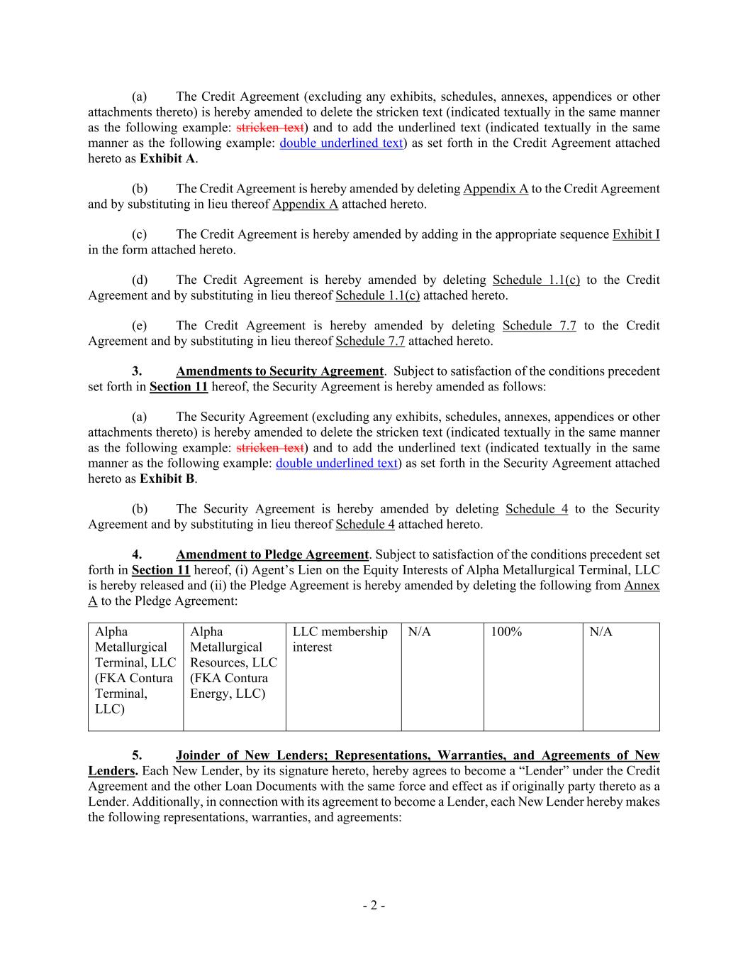 - 2 - (a) The Credit Agreement (excluding any exhibits, schedules, annexes, appendices or other attachments thereto) is hereby amended to delete the stricken text (indicated textually in the same manner as the following example: stricken text) and to add the underlined text (indicated textually in the same manner as the following example: double underlined text) as set forth in the Credit Agreement attached hereto as Exhibit A. (b) The Credit Agreement is hereby amended by deleting Appendix A to the Credit Agreement and by substituting in lieu thereof Appendix A attached hereto. (c) The Credit Agreement is hereby amended by adding in the appropriate sequence Exhibit I in the form attached hereto. (d) The Credit Agreement is hereby amended by deleting Schedule 1.1(c) to the Credit Agreement and by substituting in lieu thereof Schedule 1.1(c) attached hereto. (e) The Credit Agreement is hereby amended by deleting Schedule 7.7 to the Credit Agreement and by substituting in lieu thereof Schedule 7.7 attached hereto. 3. Amendments to Security Agreement. Subject to satisfaction of the conditions precedent set forth in Section 11 hereof, the Security Agreement is hereby amended as follows: (a) The Security Agreement (excluding any exhibits, schedules, annexes, appendices or other attachments thereto) is hereby amended to delete the stricken text (indicated textually in the same manner as the following example: stricken text) and to add the underlined text (indicated textually in the same manner as the following example: double underlined text) as set forth in the Security Agreement attached hereto as Exhibit B. (b) The Security Agreement is hereby amended by deleting Schedule 4 to the Security Agreement and by substituting in lieu thereof Schedule 4 attached hereto. 4. Amendment to Pledge Agreement. Subject to satisfaction of the conditions precedent set forth in Section 11 hereof, (i) Agent’s Lien on the Equity Interests of Alpha Metallurgical Terminal, LLC is hereby released and (ii) the Pledge Agreement is hereby amended by deleting the following from Annex A to the Pledge Agreement: Alpha Metallurgical Terminal, LLC (FKA Contura Terminal, LLC) Alpha Metallurgical Resources, LLC (FKA Contura Energy, LLC) LLC membership interest N/A 100% N/A 5. Joinder of New Lenders; Representations, Warranties, and Agreements of New Lenders. Each New Lender, by its signature hereto, hereby agrees to become a “Lender” under the Credit Agreement and the other Loan Documents with the same force and effect as if originally party thereto as a Lender. Additionally, in connection with its agreement to become a Lender, each New Lender hereby makes the following representations, warranties, and agreements: