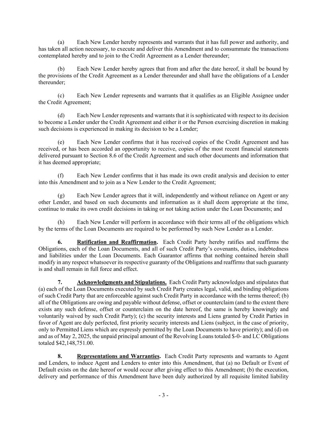- 3 - (a) Each New Lender hereby represents and warrants that it has full power and authority, and has taken all action necessary, to execute and deliver this Amendment and to consummate the transactions contemplated hereby and to join to the Credit Agreement as a Lender thereunder; (b) Each New Lender hereby agrees that from and after the date hereof, it shall be bound by the provisions of the Credit Agreement as a Lender thereunder and shall have the obligations of a Lender thereunder; (c) Each New Lender represents and warrants that it qualifies as an Eligible Assignee under the Credit Agreement; (d) Each New Lender represents and warrants that it is sophisticated with respect to its decision to become a Lender under the Credit Agreement and either it or the Person exercising discretion in making such decisions is experienced in making its decision to be a Lender; (e) Each New Lender confirms that it has received copies of the Credit Agreement and has received, or has been accorded an opportunity to receive, copies of the most recent financial statements delivered pursuant to Section 8.6 of the Credit Agreement and such other documents and information that it has deemed appropriate; (f) Each New Lender confirms that it has made its own credit analysis and decision to enter into this Amendment and to join as a New Lender to the Credit Agreement; (g) Each New Lender agrees that it will, independently and without reliance on Agent or any other Lender, and based on such documents and information as it shall deem appropriate at the time, continue to make its own credit decisions in taking or not taking action under the Loan Documents; and (h) Each New Lender will perform in accordance with their terms all of the obligations which by the terms of the Loan Documents are required to be performed by such New Lender as a Lender. 6. Ratification and Reaffirmation. Each Credit Party hereby ratifies and reaffirms the Obligations, each of the Loan Documents, and all of such Credit Party’s covenants, duties, indebtedness and liabilities under the Loan Documents. Each Guarantor affirms that nothing contained herein shall modify in any respect whatsoever its respective guaranty of the Obligations and reaffirms that such guaranty is and shall remain in full force and effect. 7. Acknowledgments and Stipulations. Each Credit Party acknowledges and stipulates that (a) each of the Loan Documents executed by such Credit Party creates legal, valid, and binding obligations of such Credit Party that are enforceable against such Credit Party in accordance with the terms thereof; (b) all of the Obligations are owing and payable without defense, offset or counterclaim (and to the extent there exists any such defense, offset or counterclaim on the date hereof, the same is hereby knowingly and voluntarily waived by such Credit Party); (c) the security interests and Liens granted by Credit Parties in favor of Agent are duly perfected, first priority security interests and Liens (subject, in the case of priority, only to Permitted Liens which are expressly permitted by the Loan Documents to have priority); and (d) on and as of May 2, 2025, the unpaid principal amount of the Revolving Loans totaled $-0- and LC Obligations totaled $42,148,751.00. 8. Representations and Warranties. Each Credit Party represents and warrants to Agent and Lenders, to induce Agent and Lenders to enter into this Amendment, that (a) no Default or Event of Default exists on the date hereof or would occur after giving effect to this Amendment; (b) the execution, delivery and performance of this Amendment have been duly authorized by all requisite limited liability