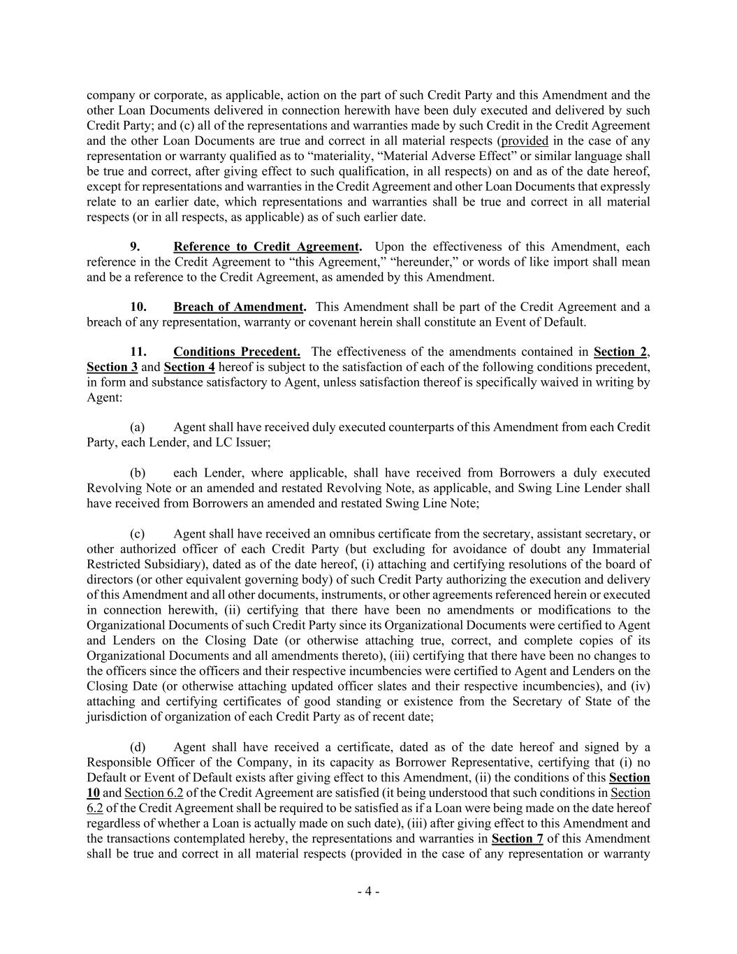 - 4 - company or corporate, as applicable, action on the part of such Credit Party and this Amendment and the other Loan Documents delivered in connection herewith have been duly executed and delivered by such Credit Party; and (c) all of the representations and warranties made by such Credit in the Credit Agreement and the other Loan Documents are true and correct in all material respects (provided in the case of any representation or warranty qualified as to “materiality, “Material Adverse Effect” or similar language shall be true and correct, after giving effect to such qualification, in all respects) on and as of the date hereof, except for representations and warranties in the Credit Agreement and other Loan Documents that expressly relate to an earlier date, which representations and warranties shall be true and correct in all material respects (or in all respects, as applicable) as of such earlier date. 9. Reference to Credit Agreement. Upon the effectiveness of this Amendment, each reference in the Credit Agreement to “this Agreement,” “hereunder,” or words of like import shall mean and be a reference to the Credit Agreement, as amended by this Amendment. 10. Breach of Amendment. This Amendment shall be part of the Credit Agreement and a breach of any representation, warranty or covenant herein shall constitute an Event of Default. 11. Conditions Precedent. The effectiveness of the amendments contained in Section 2, Section 3 and Section 4 hereof is subject to the satisfaction of each of the following conditions precedent, in form and substance satisfactory to Agent, unless satisfaction thereof is specifically waived in writing by Agent: (a) Agent shall have received duly executed counterparts of this Amendment from each Credit Party, each Lender, and LC Issuer; (b) each Lender, where applicable, shall have received from Borrowers a duly executed Revolving Note or an amended and restated Revolving Note, as applicable, and Swing Line Lender shall have received from Borrowers an amended and restated Swing Line Note; (c) Agent shall have received an omnibus certificate from the secretary, assistant secretary, or other authorized officer of each Credit Party (but excluding for avoidance of doubt any Immaterial Restricted Subsidiary), dated as of the date hereof, (i) attaching and certifying resolutions of the board of directors (or other equivalent governing body) of such Credit Party authorizing the execution and delivery of this Amendment and all other documents, instruments, or other agreements referenced herein or executed in connection herewith, (ii) certifying that there have been no amendments or modifications to the Organizational Documents of such Credit Party since its Organizational Documents were certified to Agent and Lenders on the Closing Date (or otherwise attaching true, correct, and complete copies of its Organizational Documents and all amendments thereto), (iii) certifying that there have been no changes to the officers since the officers and their respective incumbencies were certified to Agent and Lenders on the Closing Date (or otherwise attaching updated officer slates and their respective incumbencies), and (iv) attaching and certifying certificates of good standing or existence from the Secretary of State of the jurisdiction of organization of each Credit Party as of recent date; (d) Agent shall have received a certificate, dated as of the date hereof and signed by a Responsible Officer of the Company, in its capacity as Borrower Representative, certifying that (i) no Default or Event of Default exists after giving effect to this Amendment, (ii) the conditions of this Section 10 and Section 6.2 of the Credit Agreement are satisfied (it being understood that such conditions in Section 6.2 of the Credit Agreement shall be required to be satisfied as if a Loan were being made on the date hereof regardless of whether a Loan is actually made on such date), (iii) after giving effect to this Amendment and the transactions contemplated hereby, the representations and warranties in Section 7 of this Amendment shall be true and correct in all material respects (provided in the case of any representation or warranty