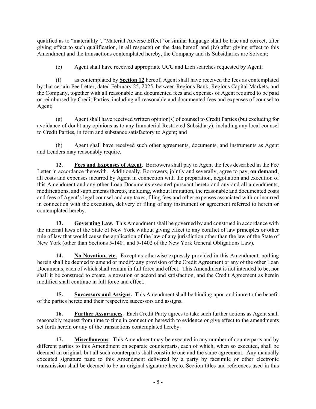 - 5 - qualified as to “materiality”, “Material Adverse Effect” or similar language shall be true and correct, after giving effect to such qualification, in all respects) on the date hereof, and (iv) after giving effect to this Amendment and the transactions contemplated hereby, the Company and its Subsidiaries are Solvent; (e) Agent shall have received appropriate UCC and Lien searches requested by Agent; (f) as contemplated by Section 12 hereof, Agent shall have received the fees as contemplated by that certain Fee Letter, dated February 25, 2025, between Regions Bank, Regions Capital Markets, and the Company, together with all reasonable and documented fees and expenses of Agent required to be paid or reimbursed by Credit Parties, including all reasonable and documented fees and expenses of counsel to Agent; (g) Agent shall have received written opinion(s) of counsel to Credit Parties (but excluding for avoidance of doubt any opinions as to any Immaterial Restricted Subsidiary), including any local counsel to Credit Parties, in form and substance satisfactory to Agent; and (h) Agent shall have received such other agreements, documents, and instruments as Agent and Lenders may reasonably require. 12. Fees and Expenses of Agent. Borrowers shall pay to Agent the fees described in the Fee Letter in accordance therewith. Additionally, Borrowers, jointly and severally, agree to pay, on demand, all costs and expenses incurred by Agent in connection with the preparation, negotiation and execution of this Amendment and any other Loan Documents executed pursuant hereto and any and all amendments, modifications, and supplements thereto, including, without limitation, the reasonable and documented costs and fees of Agent’s legal counsel and any taxes, filing fees and other expenses associated with or incurred in connection with the execution, delivery or filing of any instrument or agreement referred to herein or contemplated hereby. 13. Governing Law. This Amendment shall be governed by and construed in accordance with the internal laws of the State of New York without giving effect to any conflict of law principles or other rule of law that would cause the application of the law of any jurisdiction other than the law of the State of New York (other than Sections 5-1401 and 5-1402 of the New York General Obligations Law). 14. No Novation, etc. Except as otherwise expressly provided in this Amendment, nothing herein shall be deemed to amend or modify any provision of the Credit Agreement or any of the other Loan Documents, each of which shall remain in full force and effect. This Amendment is not intended to be, nor shall it be construed to create, a novation or accord and satisfaction, and the Credit Agreement as herein modified shall continue in full force and effect. 15. Successors and Assigns. This Amendment shall be binding upon and inure to the benefit of the parties hereto and their respective successors and assigns. 16. Further Assurances. Each Credit Party agrees to take such further actions as Agent shall reasonably request from time to time in connection herewith to evidence or give effect to the amendments set forth herein or any of the transactions contemplated hereby. 17. Miscellaneous. This Amendment may be executed in any number of counterparts and by different parties to this Amendment on separate counterparts, each of which, when so executed, shall be deemed an original, but all such counterparts shall constitute one and the same agreement. Any manually executed signature page to this Amendment delivered by a party by facsimile or other electronic transmission shall be deemed to be an original signature hereto. Section titles and references used in this