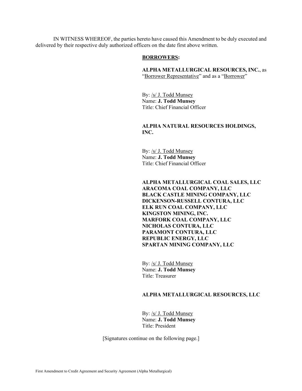 First Amendment to Credit Agreement and Security Agreement (Alpha Metallurgical) IN WITNESS WHEREOF, the parties hereto have caused this Amendment to be duly executed and delivered by their respective duly authorized officers on the date first above written. BORROWERS: ALPHA METALLURGICAL RESOURCES, INC., as “Borrower Representative” and as a “Borrower” By: /s/ J. Todd Munsey Name: J. Todd Munsey Title: Chief Financial Officer ALPHA NATURAL RESOURCES HOLDINGS, INC. By: /s/ J. Todd Munsey Name: J. Todd Munsey Title: Chief Financial Officer ALPHA METALLURGICAL COAL SALES, LLC ARACOMA COAL COMPANY, LLC BLACK CASTLE MINING COMPANY, LLC DICKENSON-RUSSELL CONTURA, LLC ELK RUN COAL COMPANY, LLC KINGSTON MINING, INC. MARFORK COAL COMPANY, LLC NICHOLAS CONTURA, LLC PARAMONT CONTURA, LLC REPUBLIC ENERGY, LLC SPARTAN MINING COMPANY, LLC By: /s/ J. Todd Munsey Name: J. Todd Munsey Title: Treasurer ALPHA METALLURGICAL RESOURCES, LLC By: /s/ J. Todd Munsey Name: J. Todd Munsey Title: President [Signatures continue on the following page.]