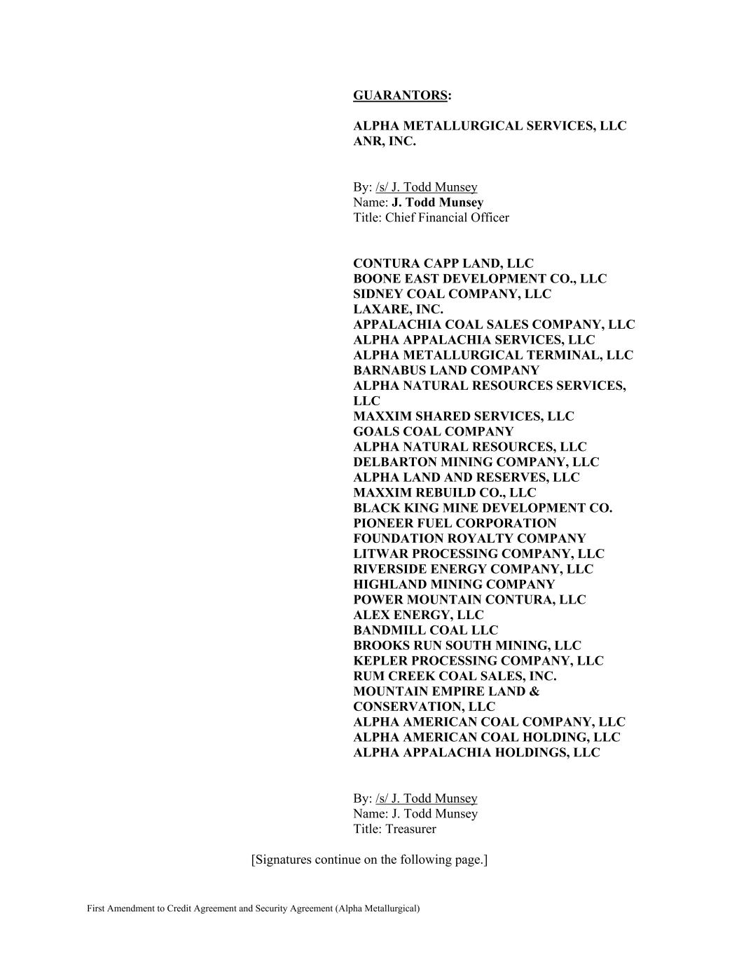 First Amendment to Credit Agreement and Security Agreement (Alpha Metallurgical) GUARANTORS: ALPHA METALLURGICAL SERVICES, LLC ANR, INC. By: /s/ J. Todd Munsey Name: J. Todd Munsey Title: Chief Financial Officer CONTURA CAPP LAND, LLC BOONE EAST DEVELOPMENT CO., LLC SIDNEY COAL COMPANY, LLC LAXARE, INC. APPALACHIA COAL SALES COMPANY, LLC ALPHA APPALACHIA SERVICES, LLC ALPHA METALLURGICAL TERMINAL, LLC BARNABUS LAND COMPANY ALPHA NATURAL RESOURCES SERVICES, LLC MAXXIM SHARED SERVICES, LLC GOALS COAL COMPANY ALPHA NATURAL RESOURCES, LLC DELBARTON MINING COMPANY, LLC ALPHA LAND AND RESERVES, LLC MAXXIM REBUILD CO., LLC BLACK KING MINE DEVELOPMENT CO. PIONEER FUEL CORPORATION FOUNDATION ROYALTY COMPANY LITWAR PROCESSING COMPANY, LLC RIVERSIDE ENERGY COMPANY, LLC HIGHLAND MINING COMPANY POWER MOUNTAIN CONTURA, LLC ALEX ENERGY, LLC BANDMILL COAL LLC BROOKS RUN SOUTH MINING, LLC KEPLER PROCESSING COMPANY, LLC RUM CREEK COAL SALES, INC. MOUNTAIN EMPIRE LAND & CONSERVATION, LLC ALPHA AMERICAN COAL COMPANY, LLC ALPHA AMERICAN COAL HOLDING, LLC ALPHA APPALACHIA HOLDINGS, LLC By: /s/ J. Todd Munsey Name: J. Todd Munsey Title: Treasurer [Signatures continue on the following page.]